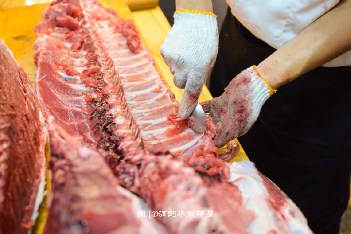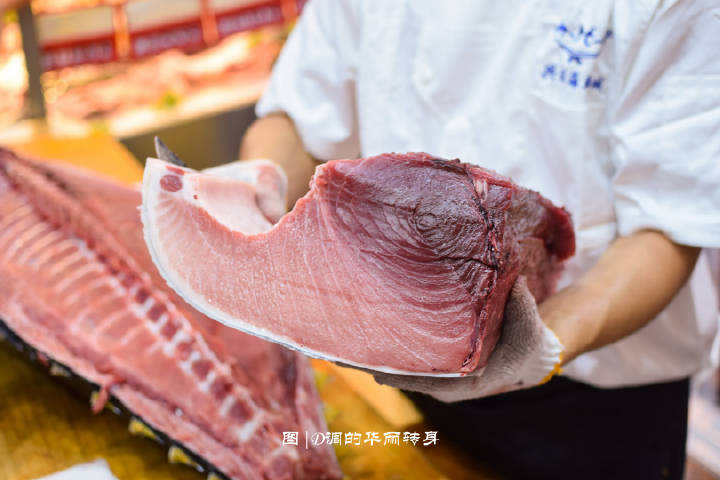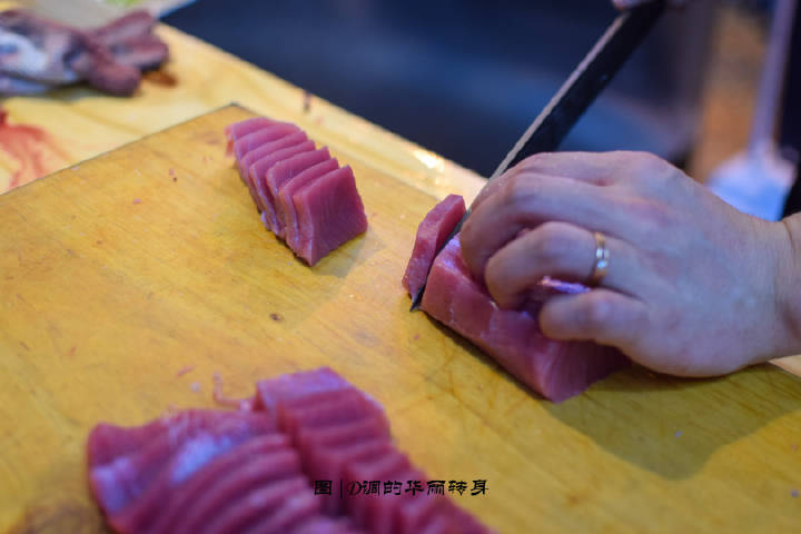 得知位于夏商水产中心的兴旺海鲜城有金枪鱼解体秀,自然不能放过我与金枪鱼本尊第一次亲密接触的机会。 晚上六点海鲜城入口处,华丽而充满仪式感的表演开始。一条重达180斤新鲜空运的蓝鳍金枪鱼展现在大家面前,师傅张开双臂,足有两个臂长! 蓝鳍金枪鱼个头比较大,不同的部位能够取到不同的肉质,所以金枪鱼的解体分为腹部+背部+鱼骨。 手起刀落,分离鱼头鱼尾,将长刀穿进鱼身,切下背部和腹部的鱼柳,整个过程行云流水,这是一种视觉上的享受。 金枪鱼腩是刺身中的黄金,能明显看到脂肪,不同的鱼腩呈现不同的纹理和色泽。靠近前腹部的大脂雪花油脂含量最多,入口即化。靠近中腹的中脂肥而不腻,而颜色最鲜红的赤身鲜味十足,香甜可口,也是食客的最爱。 现杀的金枪鱼,现场品尝才过瘾。大脂鱼肉切得厚薄适中,颜色偏粉白,是鱼肉中最肥美的部位,粘上芥末和酱油,一口塞入口中,就像吃冰淇淋一样在口中融化,香气浓郁。