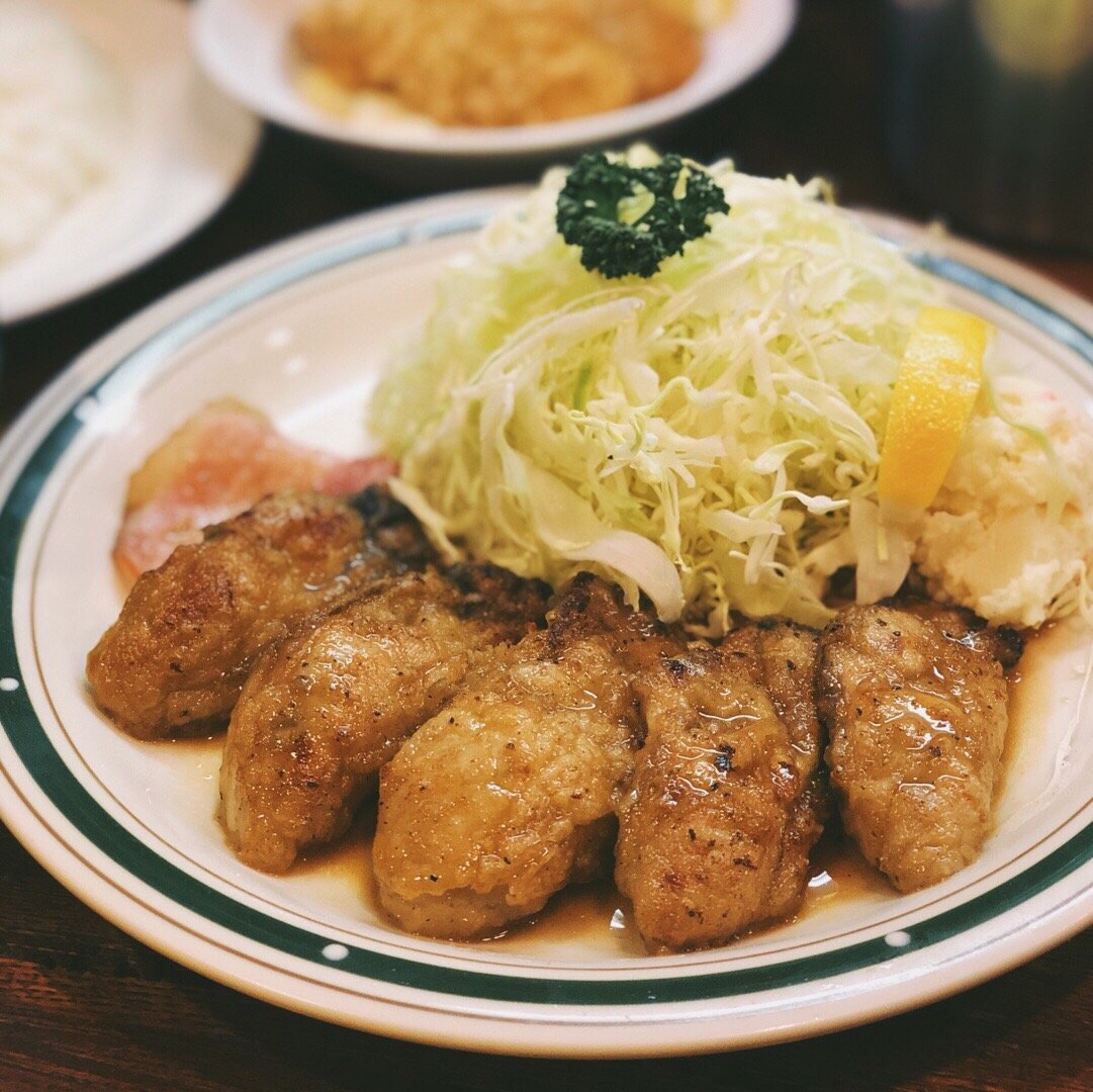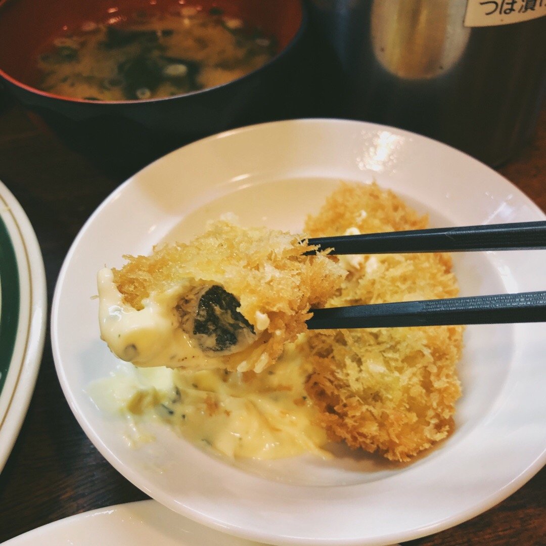 カキバター焼定食,1500円。黄油煎牡蛎,五颗肥厚的牡蛎配卷心菜丝和土豆泥,人气No.1就是它!牡蛎裹了薄薄的粉,这样煎的时候不会流失水分,保留了鲜嫩的口感。挤上柠檬汁趁热咬一口,大满足 カキフライ」420円。两颗炸牡蛎配塔塔酱和柠檬,现炸的新鲜美味! 干吃七颗大牡蛎,虽然很开心但觉得有点腻。刚好附近有一家鲷鱼烧名店,据说是东京排名前三的,那自然不能错过。现在边排队边码字,排一小时了还没轮到呐
