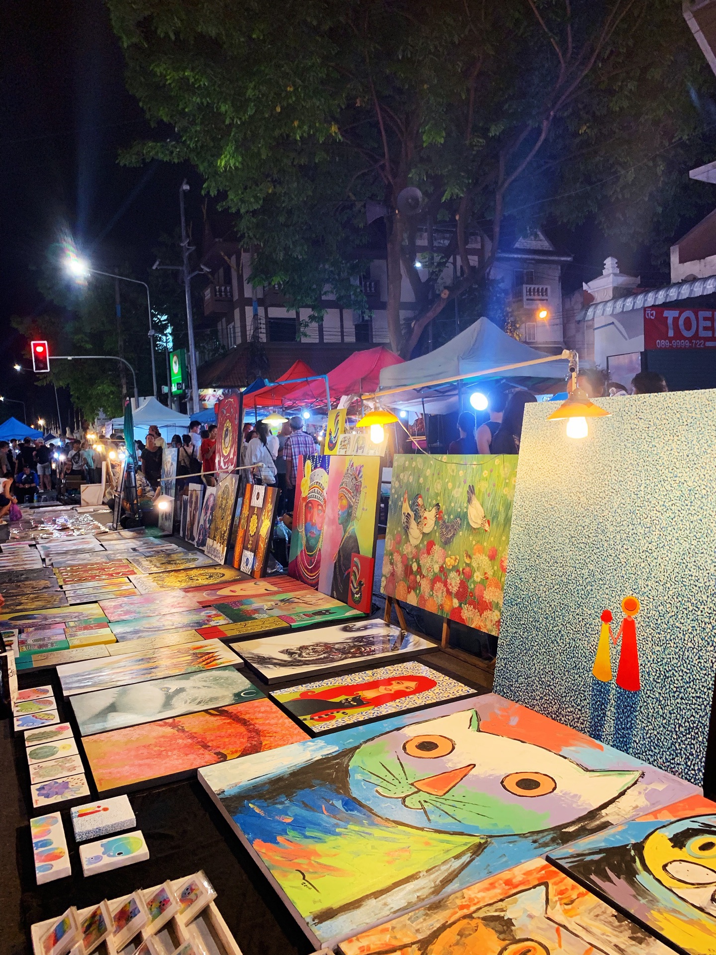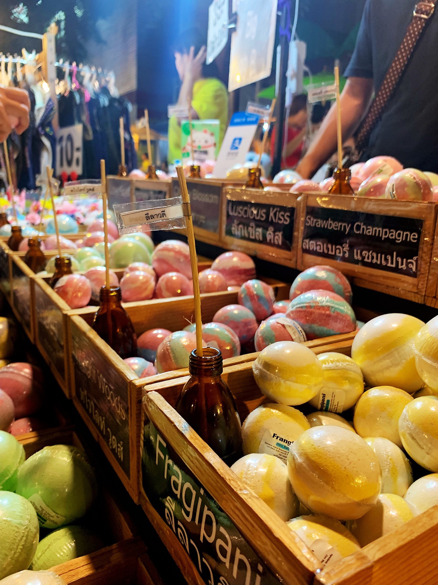 周日夜市据说是世界上很有名的夜市,必须要来打卡,更惊喜的是周日夜市离酒店就50米,出来就是。整个夜市真的好大呀~啊啊啊,到了十字路四面都是,根本不止1000米。卖的小玩意都很有意思,买了什么冰箱贴啥的。在集市上喝了那个百香果汁,1杯30泰铢,不加水不加糖,真的是真爱,太好喝了。喝完了又折返回去买了一杯,里面不知道放了多少百香果,好值~集市上还有很多卖衣服包包的,价格都很便宜,十分值得逛逛。 重点要推荐的是泡澡的精油球!超级便宜!小号的大概就十块人民币一个,大号的20人民币,比什么LUSH都便宜太多了,最重要的是这很好用!推荐几个味道:薰衣草味的,真是有舒缓的功效,洗完真的很放松;桃子味:真的好甜美好甜蜜,水里都是桃子的香气,泡澡心情都很愉悦;其他的味道也是OK的,性价比真的高。买了一堆回来,够用几个月了~