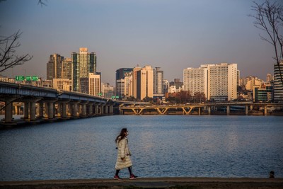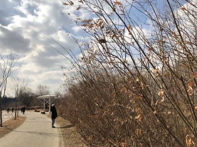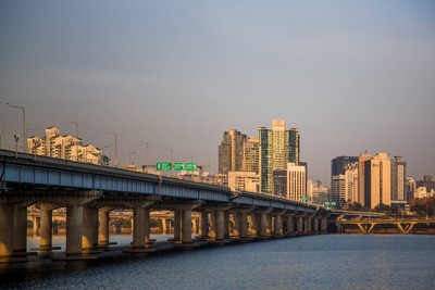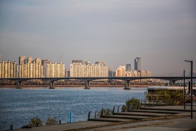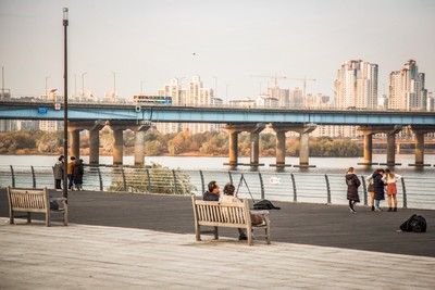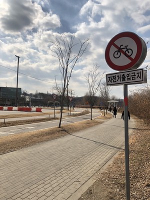 汉江滨江公园其实是很长的一溜,汉江沿途都是属于公园区域,但人流聚集地是这个停车场附近的草地。如果是夏天,可以看到一大片帐篷的景观,首尔人民喜欢租个帐篷在草地上面对汉江聊天野餐,即使现在冬天冷飕飕的,竟然也有一些倔强的帐篷屹立着。 滨江公园还有自行车道,夏天傍晚沿江骑个车应该很惬意了。