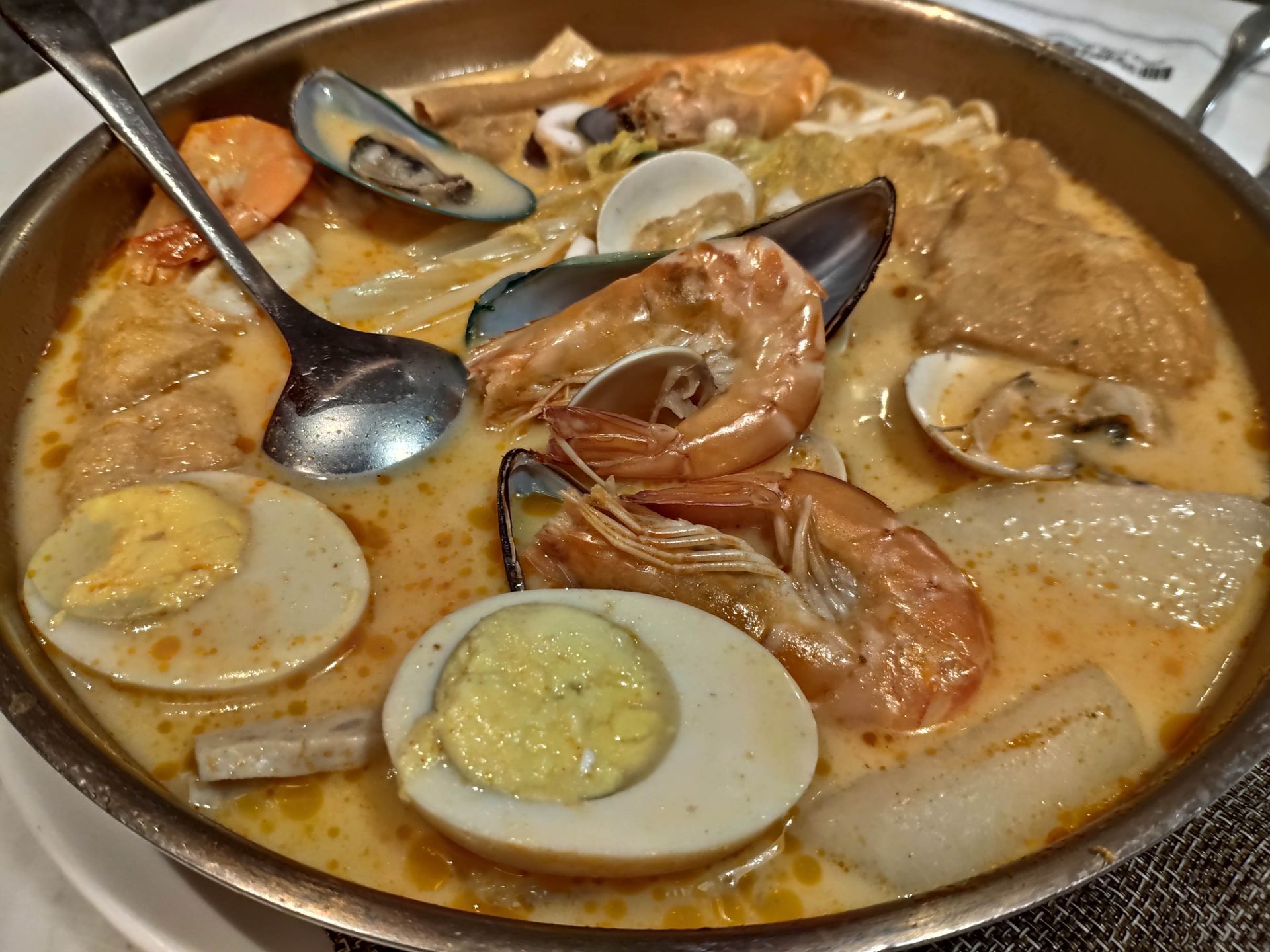 新加坡风味海鲜锅,辛辣味的咖喱,拿来拌饭,米饭都变得超级的好吃,配上丰富的海鲜,不错哟