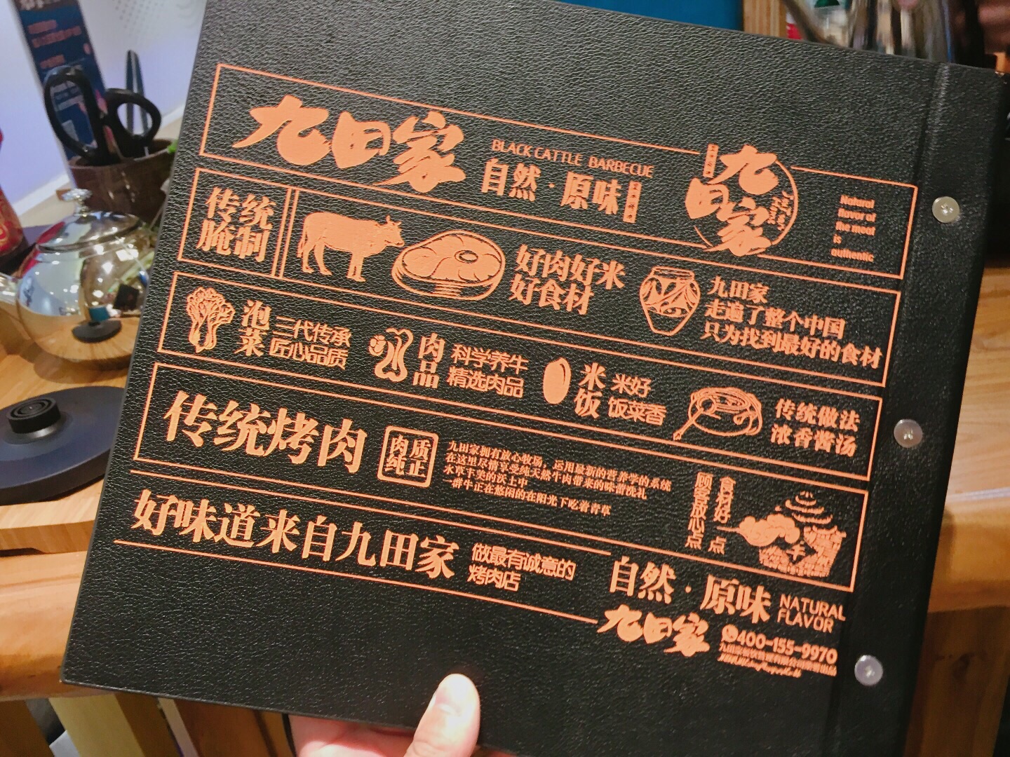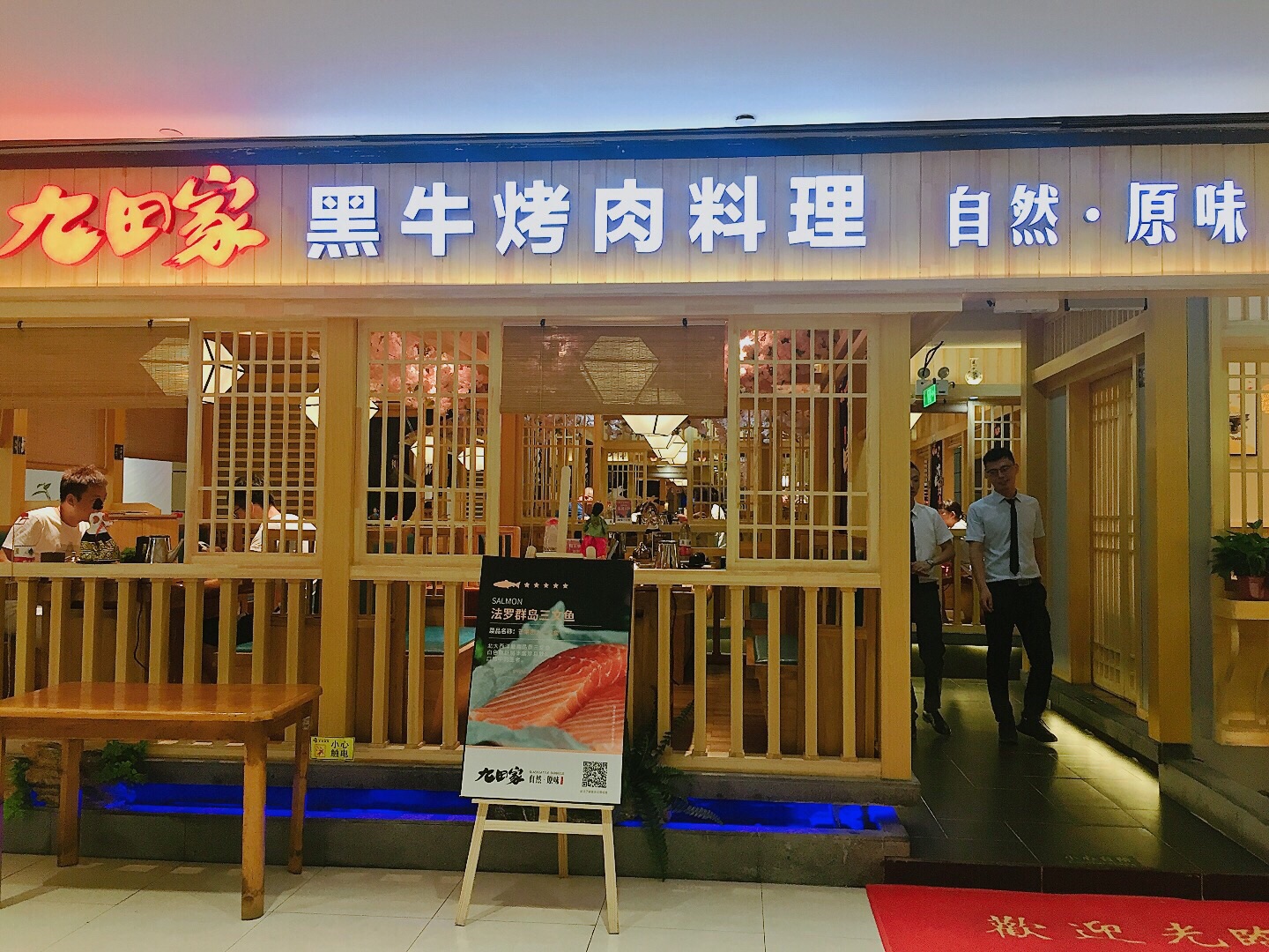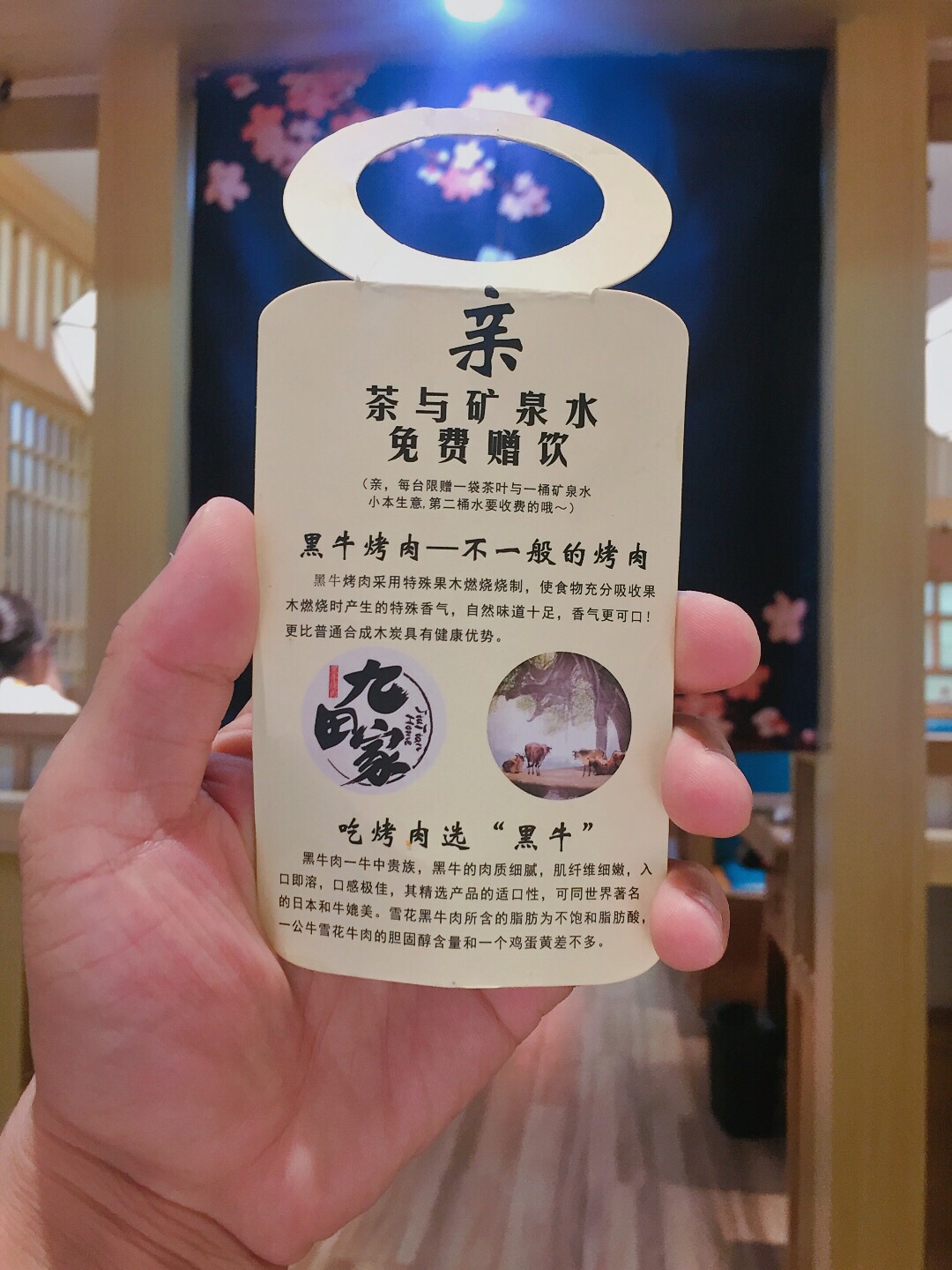#曲江银泰店#晚上和朋友来大唐不夜城步行街逛,然后准备在银泰城解决晚饭,A馆比B馆餐稍微能多点。而且还有一个袁家村美食城,但是瞄了一眼人实在太多了,而且位置紧张,真要走的时候看到这个烤肉,一看是九田家,在西安门店挺多的,于是直接进来尝尝。每桌会给提供一瓶农夫山泉水和茶叶一包,后面再加需要收费。让店里小哥给推荐了一下,比较喜欢吃牛肉,最后点一份牛肋条和一饱口福牛肉,朋友给自己点了猪五花,上菜很快,服务员先给烤一下。后面需要自己动手烤了,更换烤盘很及时。总体烤肉味道不错,服务也好!