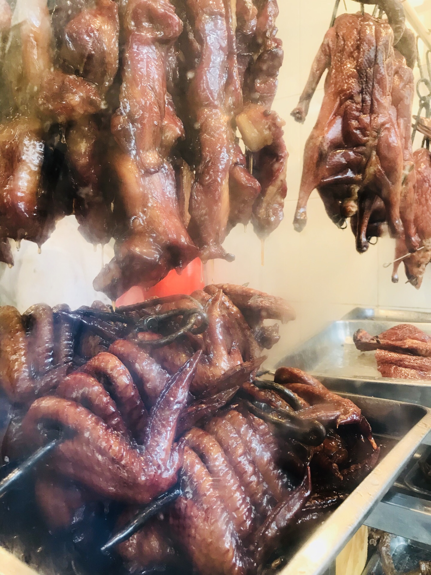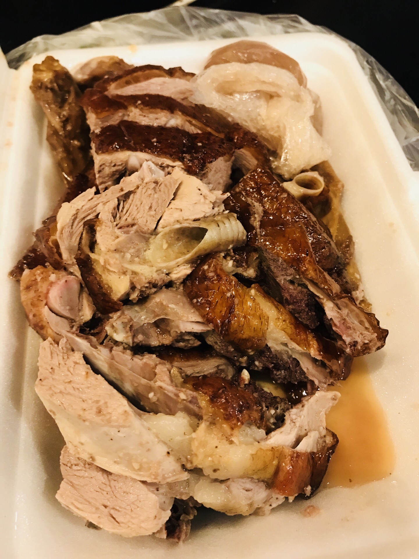 检验烧鹅好不好吃的标准之一就是凉了之后味道如何!这家满分通过!买的时候其实就不是很热,就是温乎的,后来拎了一路将近20分钟,随便找了个麦当劳坐下吃的,结果发现味道还是超级好,每份给一小袋汁儿,倒在烧鹅上真是点睛之笔,那个汁儿非常好吃,其实就是烧鹅里的原汁,浇上去肉更入味。尤其是鹅翅!人家美味!全是广州当地人来