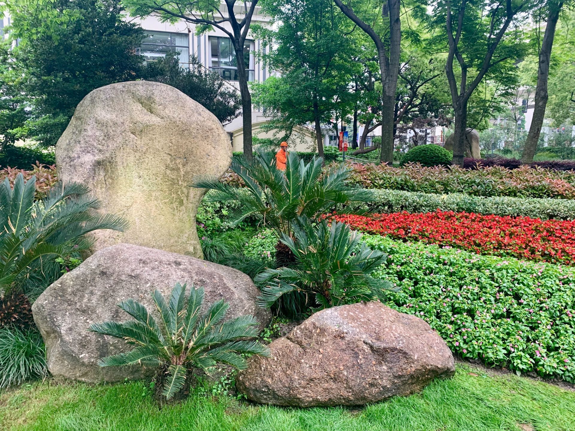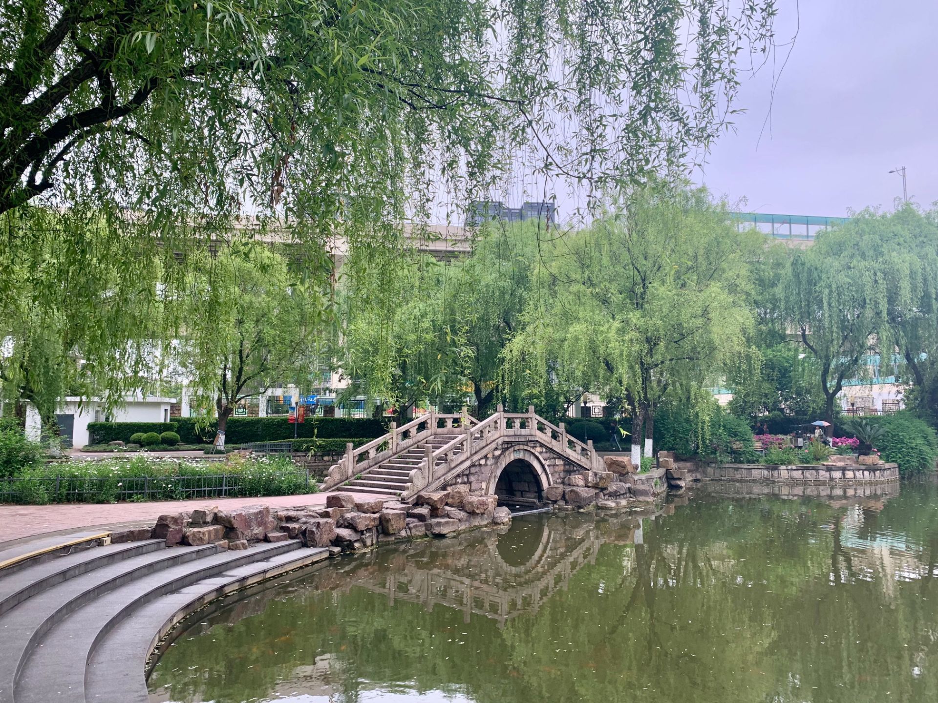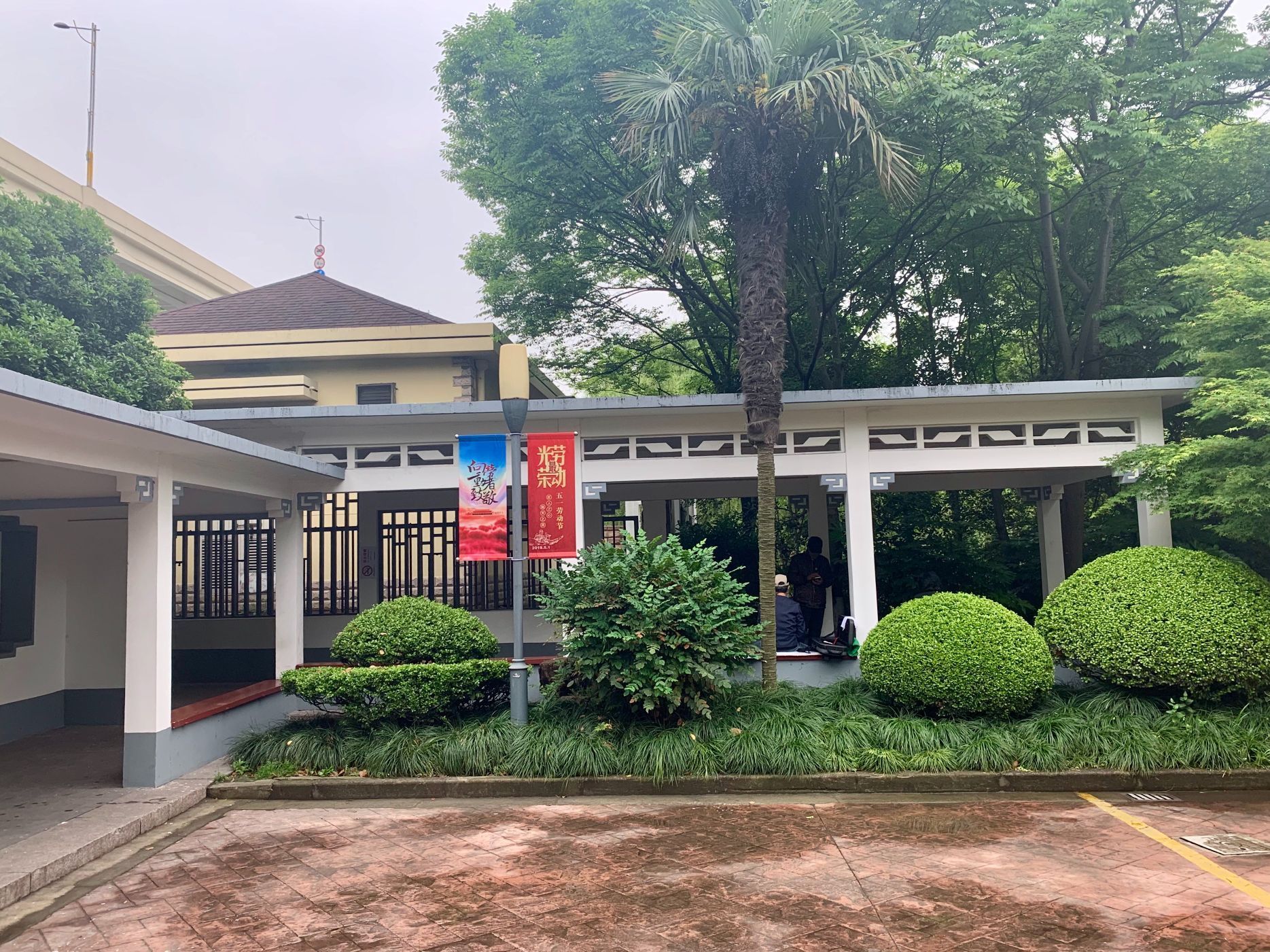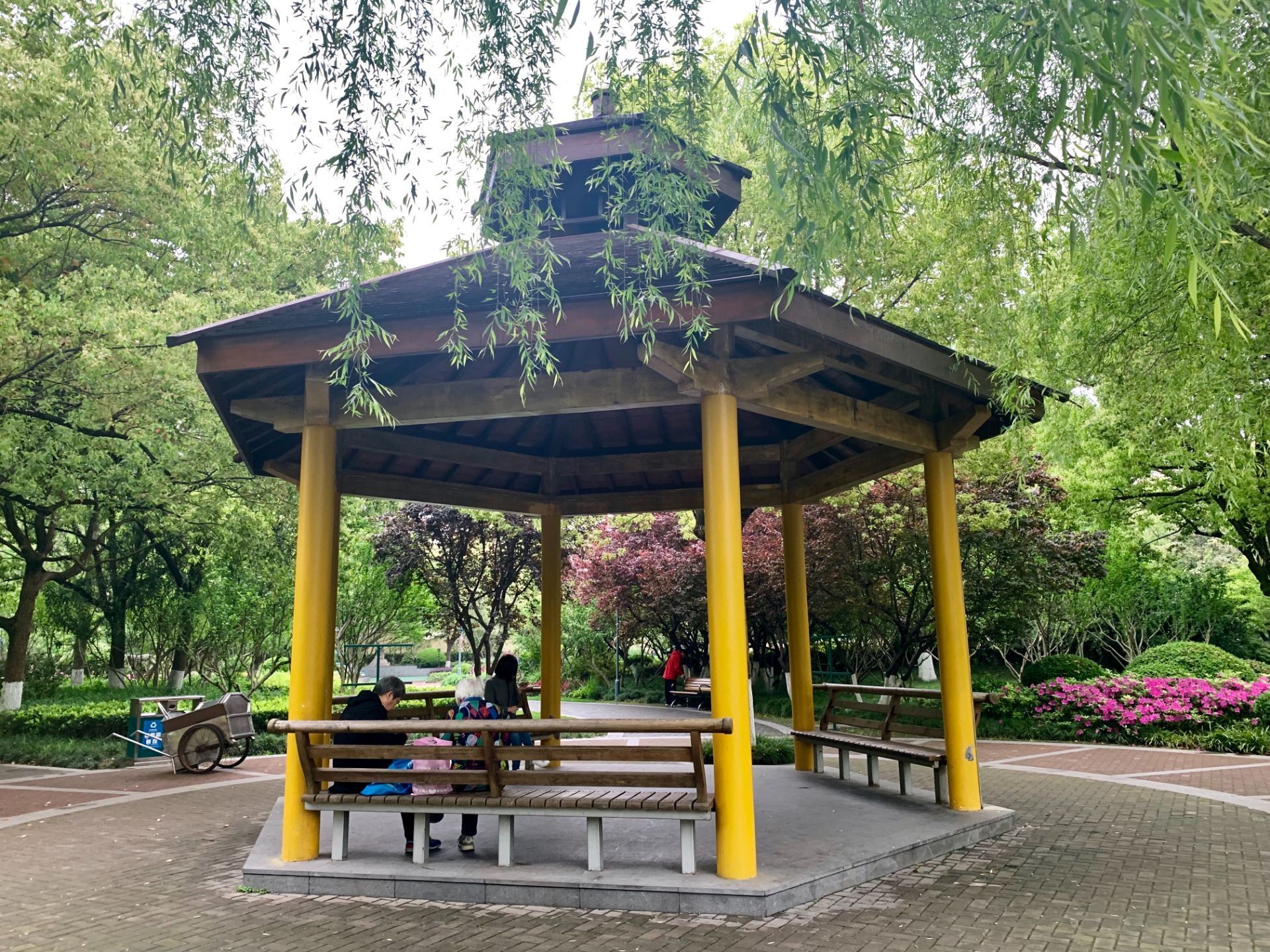 公园西南角有一个钢筋混凝土六角亭,翘角,单檐,筒瓦,葫芦顶,水泥地坪,磨石子扶王靠,非常漂亮