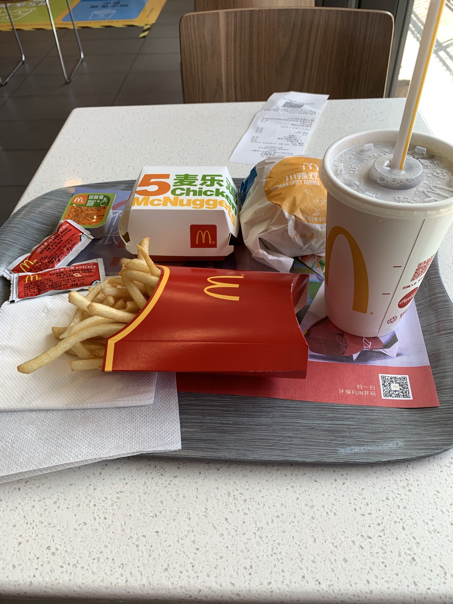 本来想点麦辣鸡腿堡,结果想尝尝川辣双鸡堡。自助点餐点完后,大概等了10多分钟。不好吃。真的很难吃