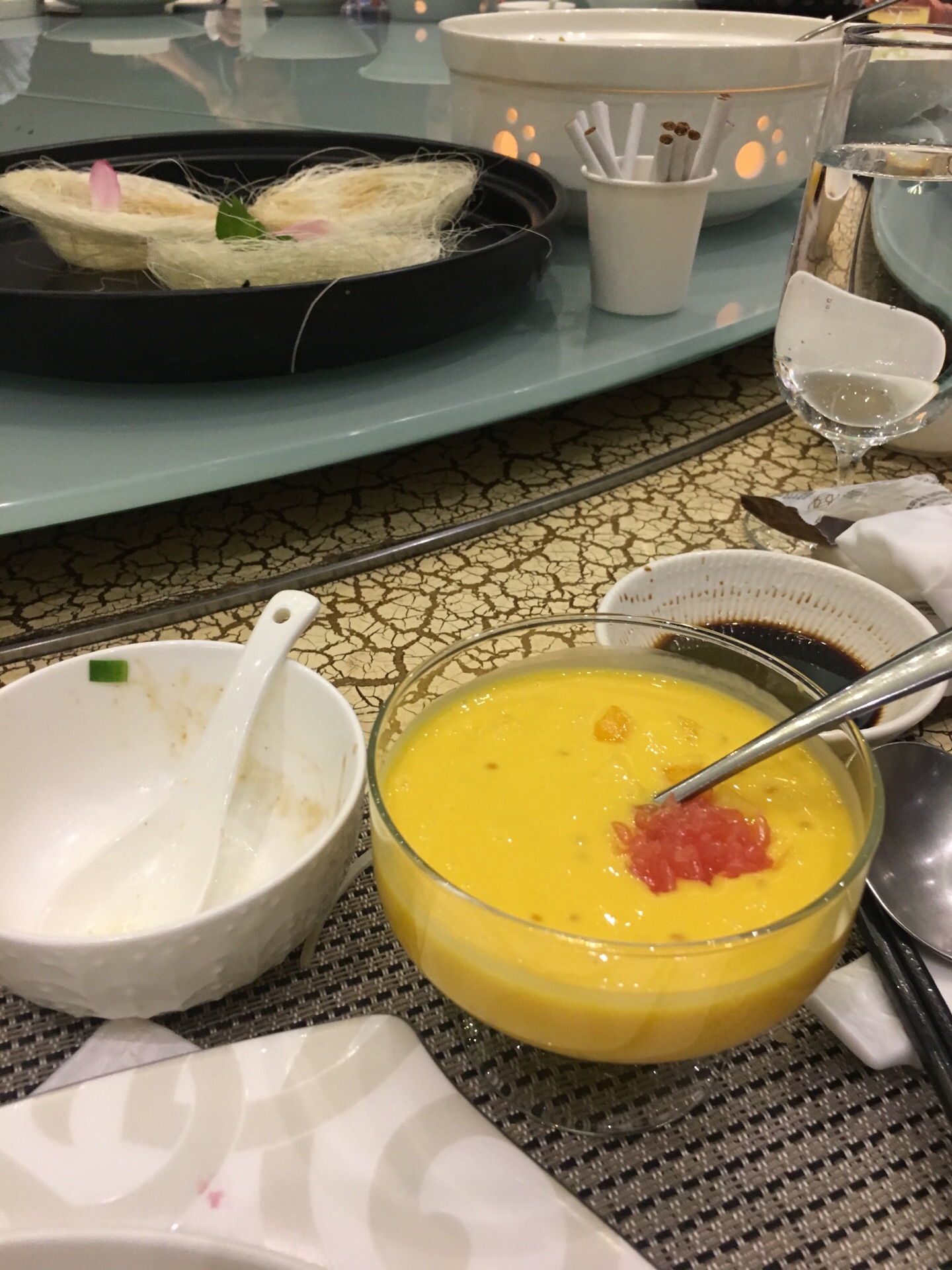 蟹粉汤包和蟹粉鸡头米都很腥,河豚鱼有点烧太甜了,松茸汤中只有2片松茸。最好吃的是火腿小豌豆和杨枝甘露