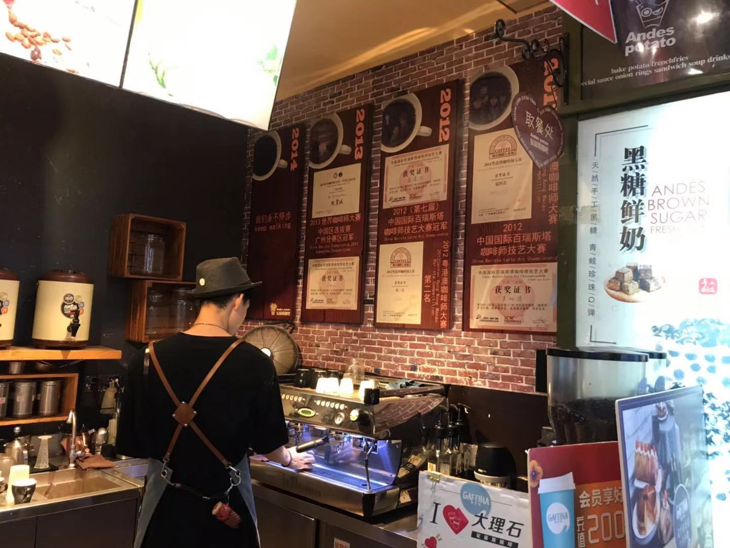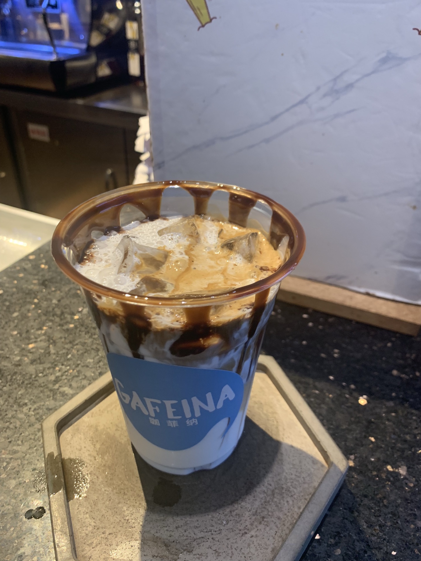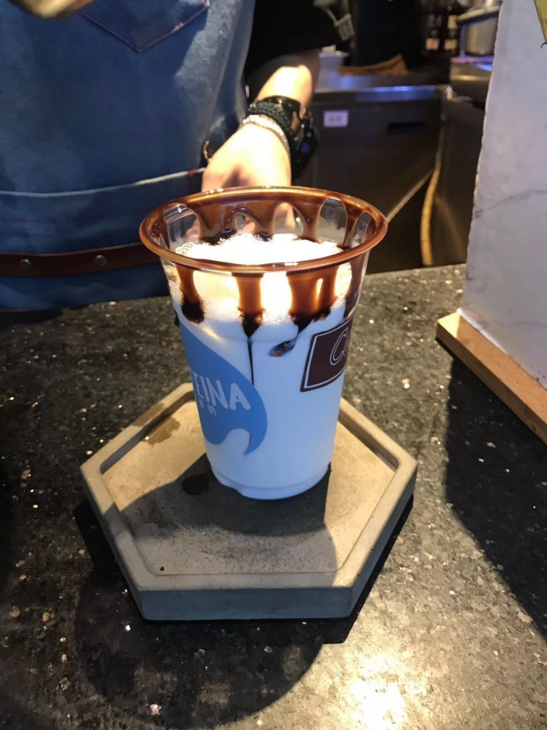 在江南新地,每次路过都被咖啡味吸引了,这次和朋友吃完饭后来拔草。 小哥哥和吧细心问完想喝什么,也会推荐。 出品很快,小哥哥还会问,要不要拍照啊,我准备把咖啡倒进去啦。 就像小哥哥说的,因为杯子边上是巧克力,所以每一口会有不同的感觉,好喝。