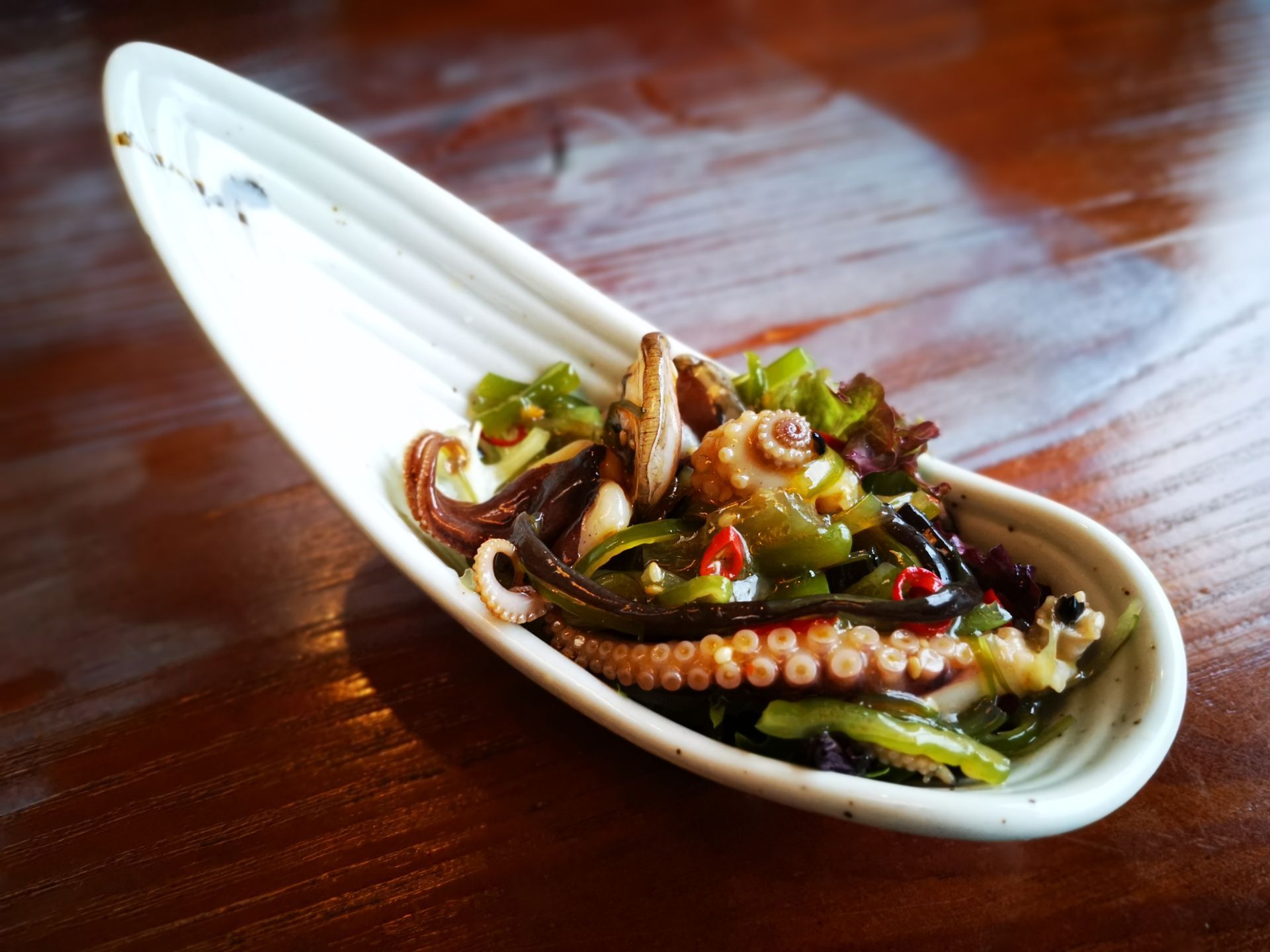 【环境】 这家上尚日料开在溪望路茶师庵路路口,阿里南门附近。停车可以停在茶师庵路路边,目前不会抄牌。园区内停车的话,5元/小时。门面非常的日式,一眼就找到了。进到里面,空间很大,餐位很多,卡座、包厢、榻榻米、吧台位,一应俱全。 >>>菜品 |华风八爪鱼^ 22元。问了服务员,八爪鱼是生是熟,答曰生。于是我们三个都不敢动筷。最后还是我抱着试试看的态度,先尝了一口。这八爪鱼分明就是熟的啊,大概是焯过水的,弹性很好。旁边的海草也还不错,QQ脆脆的。 |日本泡菜^ 16元。泡菜的颜色很诱人啊,味道也很赞,酸酸辣辣很开胃。不过日本泡菜和韩国泡菜有什么区别吗? |有机蔬菜沙拉^ 28元。蔬菜沙拉中规中矩,配了沙拉酱,热量就上去了。如果可选油醋汁,岂不是更好? |盐烤秋刀鱼^ 28元。挤一点柠檬汁上去,趁热吃鱼肉,就觉得还蛮清新的。等到翻身吃另一面的时候,鱼凉了有点腥味,就感觉差点了。 |火炙三文鱼寿司^ 49元。霸王餐页面的照片,一份是8个,但实际是4个哦。火炙的三文鱼半生不熟,不过只要品质过关就好。里面包的黄瓜、苹果、蟹棒,吃起来很清甜爽口。 |牛肉寿喜锅^ 89元。冷空气来了,阴雨绵绵,吃点锅物料理最暖身了。寿喜锅一份的量还挺足的,有蔬菜、菌菇、豆腐,另配一盘肥牛和一个鸡蛋。我挺喜欢寿喜锅带点甜味的锅底,不过爪子就不喜欢。牛肉的话品质一般,如果是雪花牛肉就高大上了。鸡蛋当蘸酱吃貌似才是寿喜锅的正确打开方式,但品质没法保证,还是煮熟吃的放心。 |石锅拌饭^ 39元。隔着帘子听到了呲呲呲的声音,就知道是石锅拌饭来了。服务员太贴心,已经帮我们拌好了。一人一碗分了之后还有的多哦,量够足的。酱料把米饭上了色,混着各类蔬菜,已经看不清都是些啥。吃了一口,好香啊,还有脆脆的锅巴,美滋滋。于是分分钟就把这一碗解决了。 |日式清汤^ 25元。清汤里面有鸡蛋和裙带菜(大概是),调味和口感也都恰到好处。 这一顿,原价也才294元,性价比蛮高哦。