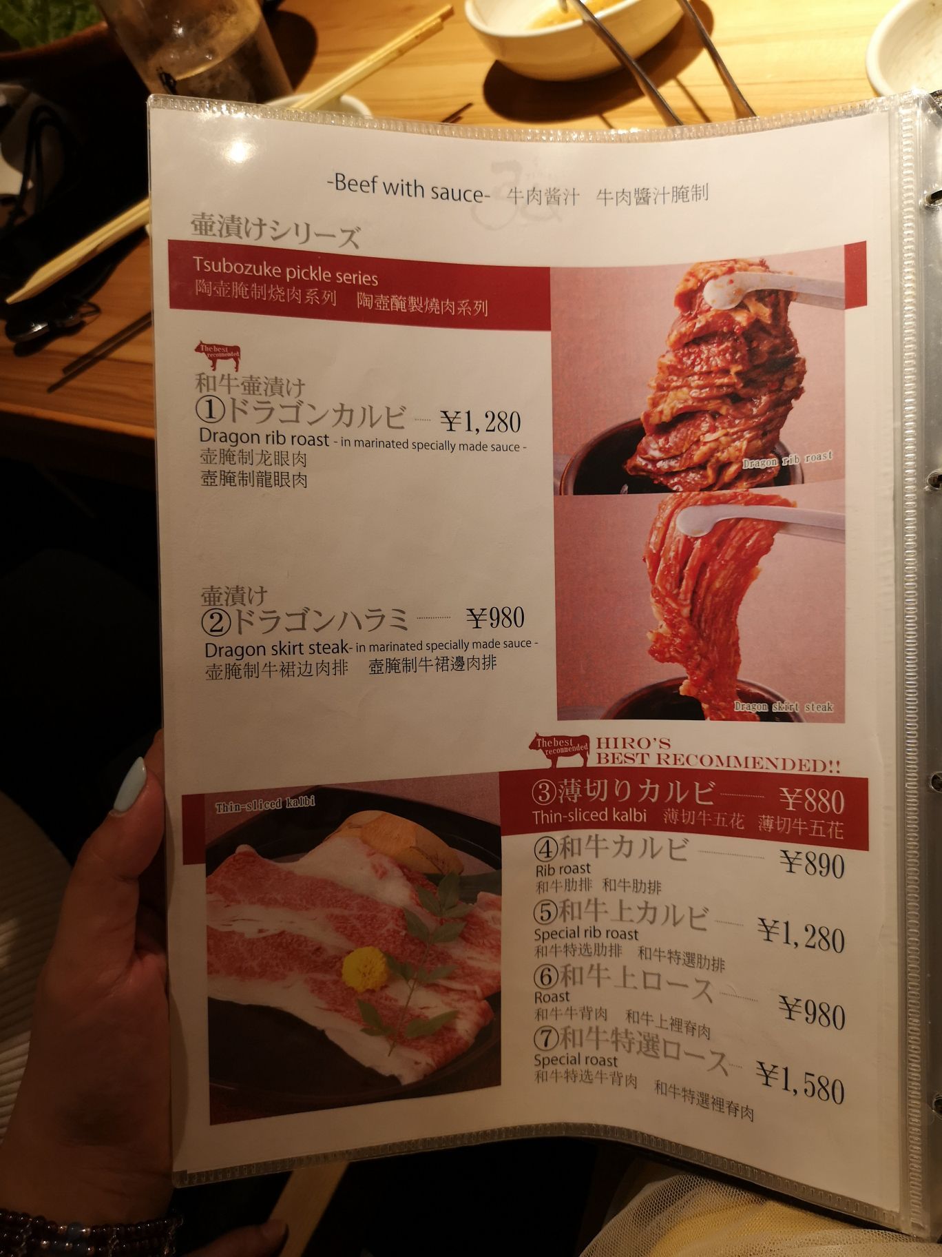 这次日本行最满意的一家和牛烤肉店之一,提前在官网预约好这家分店,选好时间,到点准时去吃就可以啦,而且官网其实有中文和英文夹一起还是可以看得懂。弘在京都有好几家分店,类型不太一样。这家貌似位置比较多而且相对人少一点。建议选早一点的时间段去吃,因为有些部位卖完就没有的啦,怨念很深的我就没有吃上生牛肉。 基本上喜欢吃的部位我们都滚了一次菜单,而且这家的烤网真心比起万兩要干净很多,不会这么容易烤焦。真心觉得每个都好吃,如果非要推荐的部位我觉得有个瓦罐装起来那个牛肉部位最好吃,其实我忘记名字啦,不过看菜单图片还是可以点到的。人均不贵的一家店,十分满意。