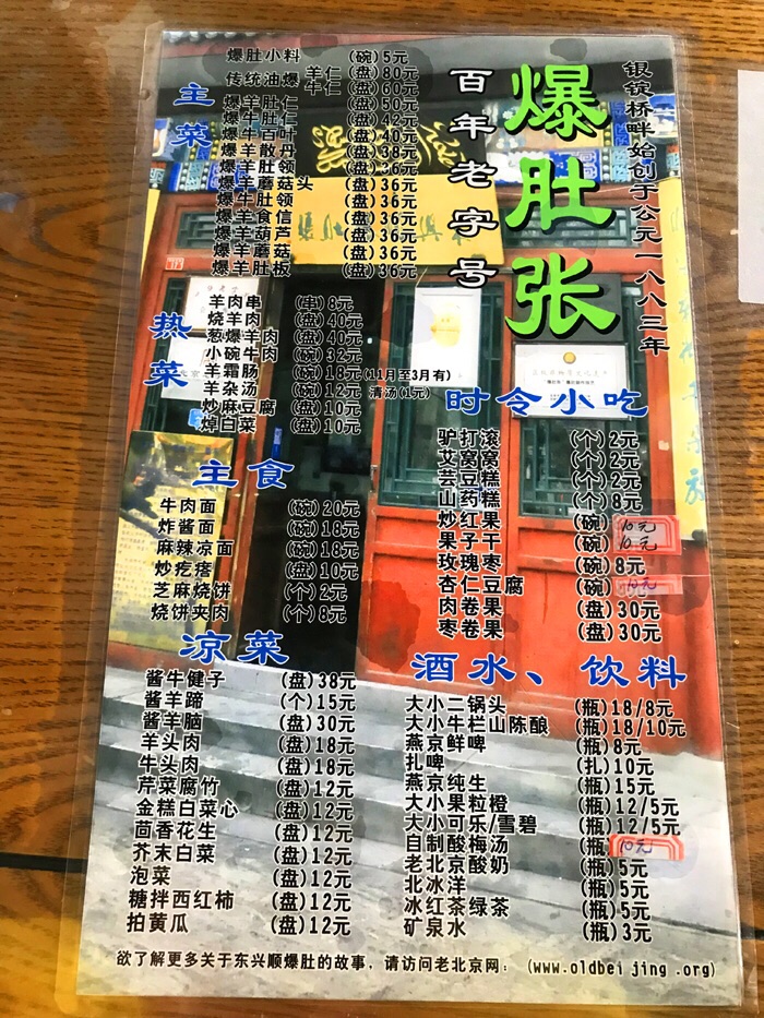 贴秋膘就从东兴顺爆肚张开始,这里的爆肚果真是名不虚传呀! 对爆肚一直挺热衷,后海边上这家不起眼的小门面,麻利的点上朋友推荐的必点菜! 爆牛百页:40元,看着不多吃起来才发现份量十足,有的朋友可能会吃不惯这个味,建议点碗麻酱去味儿,爆肚爽!脆!鲜!不油不腻,真的比别家吃起来更爽口,入口是新鲜的鲜甜味! 爆牛肚仁:42元,据说是牛胃口上隆起的一块肌肉口感清脆,不老,有点Q弹的口感,很有嚼劲,太有特色了! 杏仁豆腐:10元,本身不太喜欢杏仁的味道,但仍很好奇,杏仁味相当浓,做的很滑嫩,有特色。 果子干:10元,这个一定要尝!看着粘稠的糖汁没想到入口是如此的清爽,汤汁呈琥珀色,甜杏干为橙红色,加上雪白的藕片,上浇糖桂花汁,放在一起用冰镇着,吃到嘴里凉丝丝、脆生生,甜酸爽口!绝对赞!