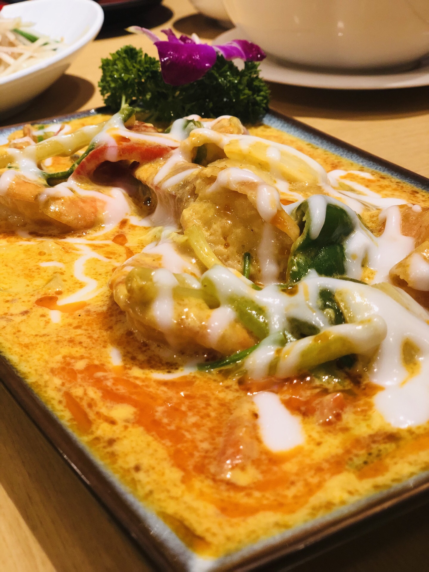 之前在他家另一家店吃过。店面很容易辨识。装修风格走东南亚路线,小摆设好漂亮。 中午有套餐,单人、双人或4人都有。会员生日还有优惠券。 【黄咖喱大虾】蛮好吃的,虾新鲜,黄咖喱不辣,酱汁浓郁,拌饭刚好。 【椰肉炖母鸡汤】量超级大,里面居然还有鸡血。只是这道菜的食材和【罗勒绿咖喱鸡】一模一样啊!只有酱汁不同。 【祖母酱肉末茄子】是他家最好吃的一道菜了,茄子入味超软糯。