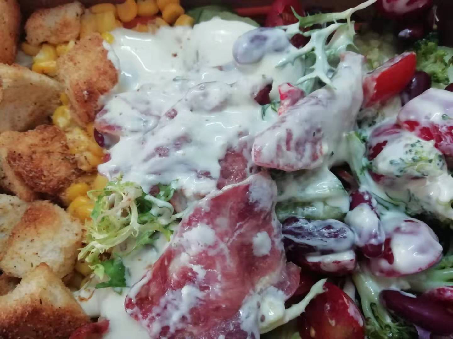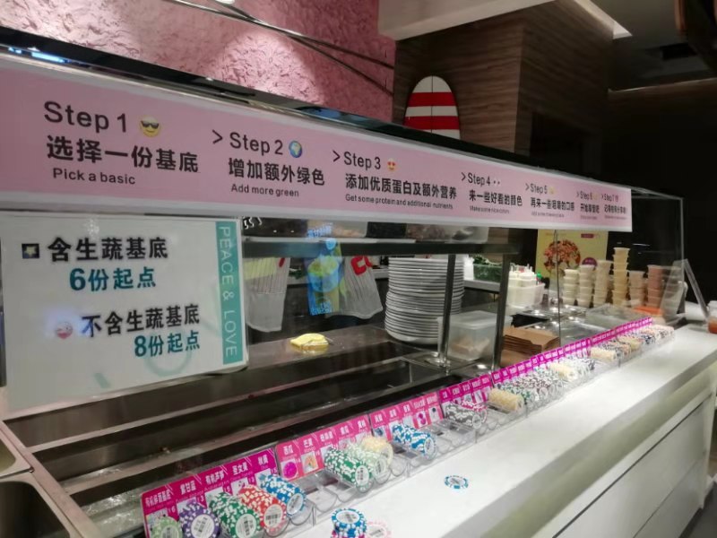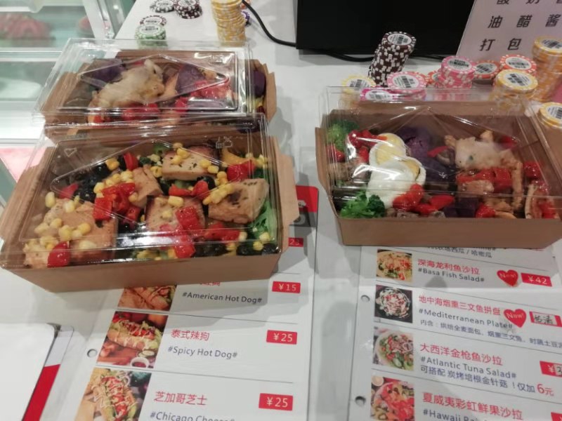 关山大道355号武汉K11的peace&love和平与爱主食沙拉(武汉K11Select店)来宵夜,结果因为堵车,晚来了半个多小时,到的时候已快下班,服务员已经帮我打包好了在等我。套餐的内容有1.芝加哥芝士热狗 ,看着漂亮,吃着满意。2.凯撒沙拉,内容丰富,分量十足。 3.冰摇柠檬茶 2杯,味道和柠檬红茶很相似,既解渴又消食。店子在负一楼中心位置,布置得很漂亮,粉色为基调,浪漫又温馨,很适合闺蜜聚会和情侣约会,赞[强]