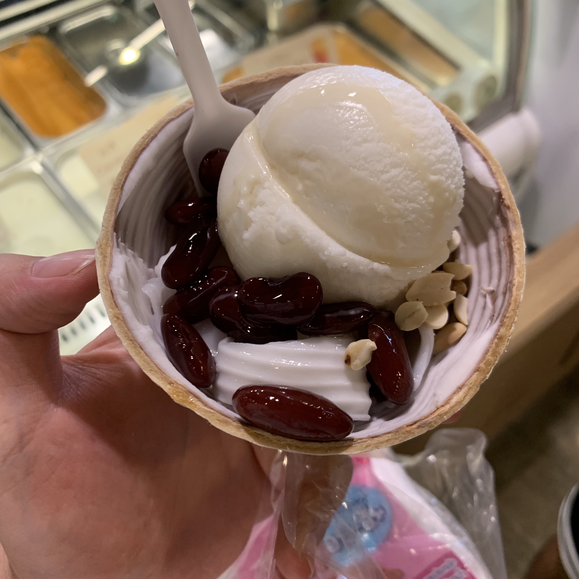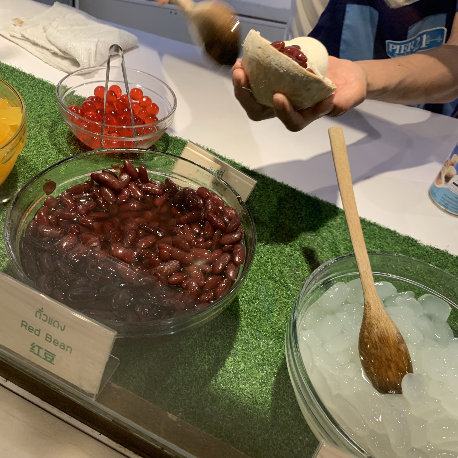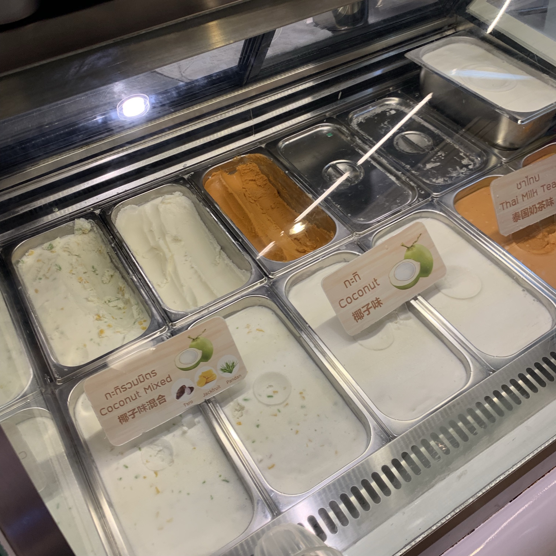 曼谷打卡~ 这家冰淇淋店就在网红美食城里面,办了储值卡就可以买了呦,但是不在卖吃的那边,是个独立的小店,我转了好几圈才看到~ 一个椰子壳,里面的椰肉也可以吃,还加了蜜豆之类的,价格挺便宜的,味道不错,可以作为饭后甜点~
