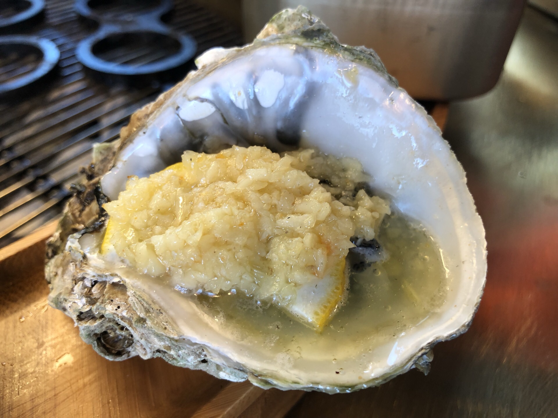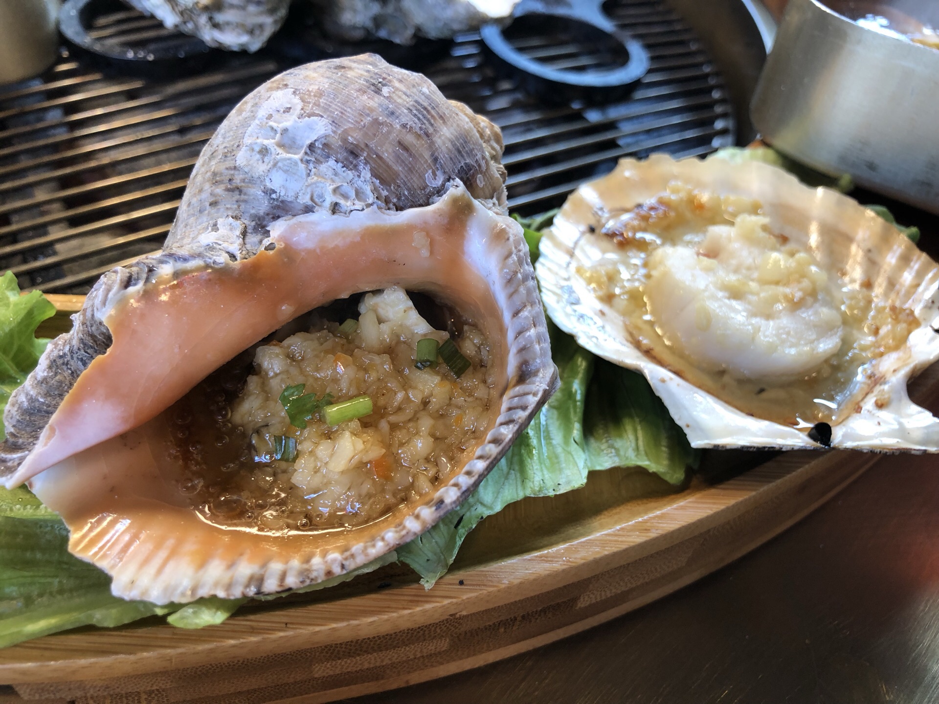 网红店必须打卡,海鲜呼啦圈又有创意,颜值又高,使用各种新鲜的海鲜,在烤炉旁围成一个圈儿,有鲍鱼、天鹅蛋、海螺、扇贝等等,都是爱吃的海鲜,由服务员代为烤制,一边烤一边加入蒜汁、特制海鲜酱油,吃到嘴里除了鲜美还是鲜美。
