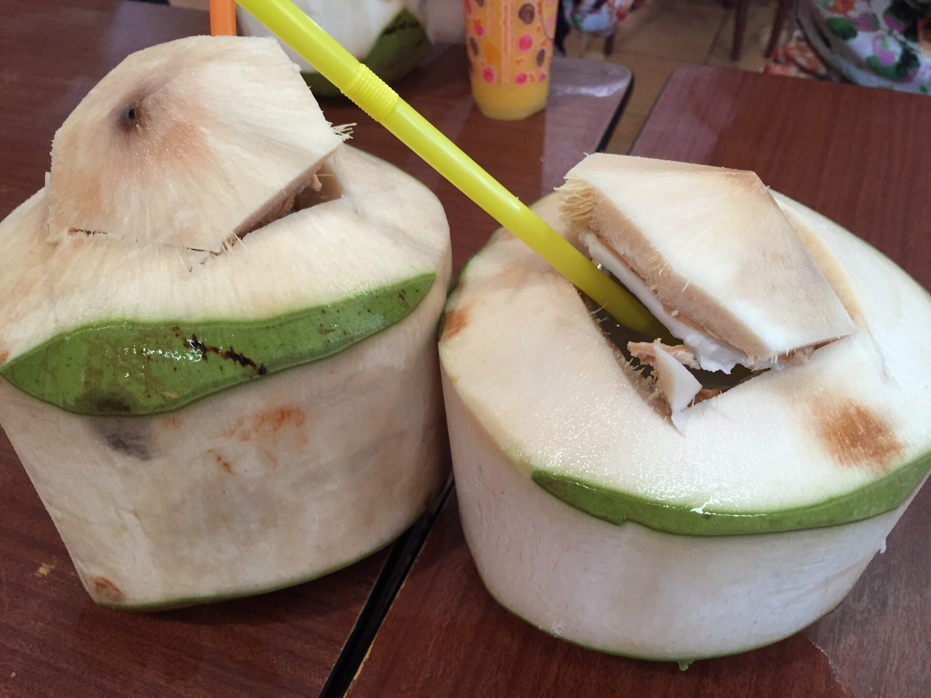 环境还不错,顶上有电风扇可以吹一下,普吉岛这个地方靠海,所以到了傍晚吃晚饭的时候并不是很热环境还不错,顶上有电风扇可以吹一下,普吉岛这个地方靠海,所以到了傍晚吃晚饭的时候并不是很热。每次在餐厅总会点新鲜的椰子吃,非常的便宜。