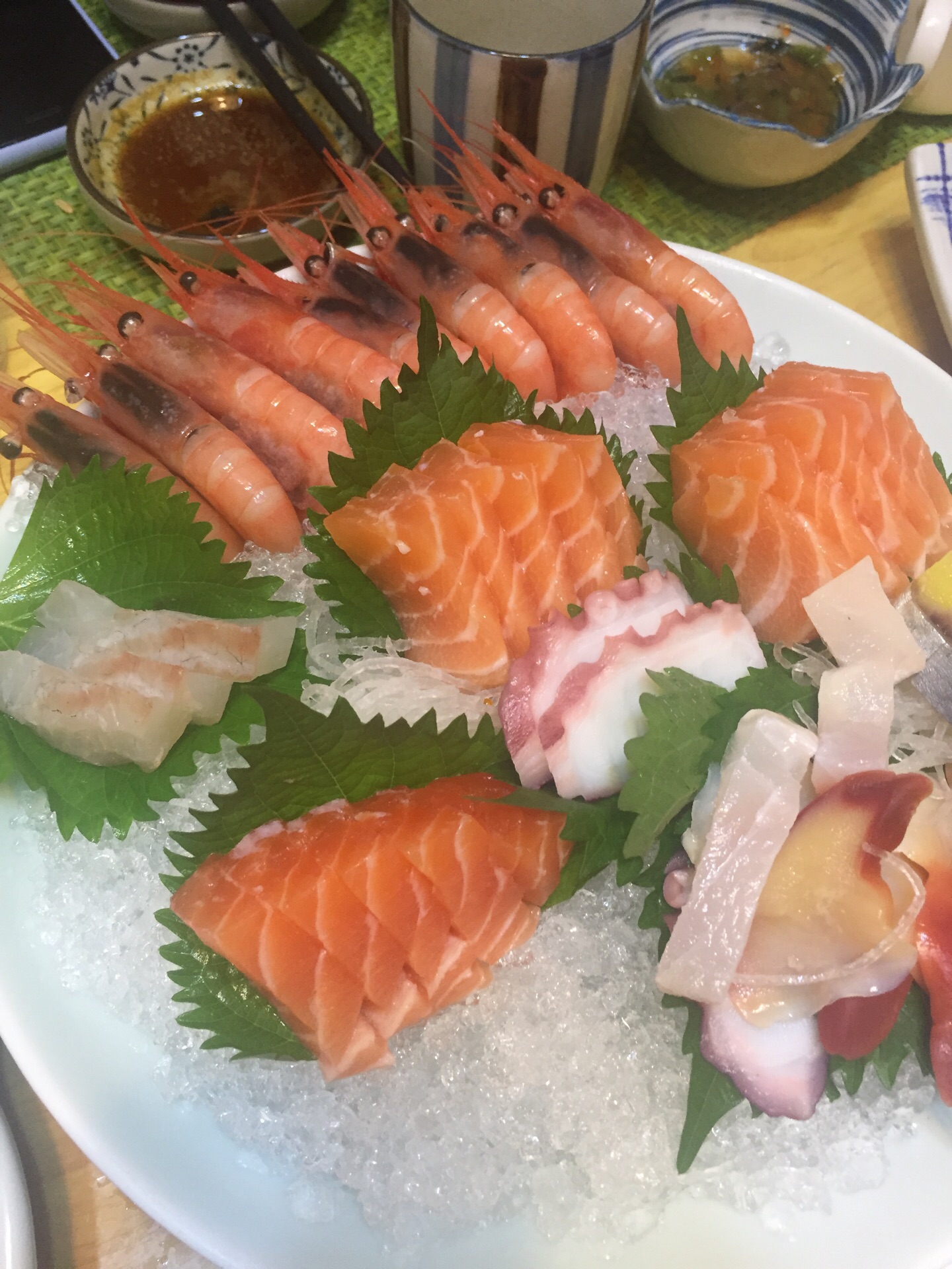 在他们家的刺身拼盘里,品种之繁多,其中最新鲜的味道最美味的当属三文鱼鱼腩刺身和北极甜虾刺身。食材新鲜细腻,满口醇香,太棒了。