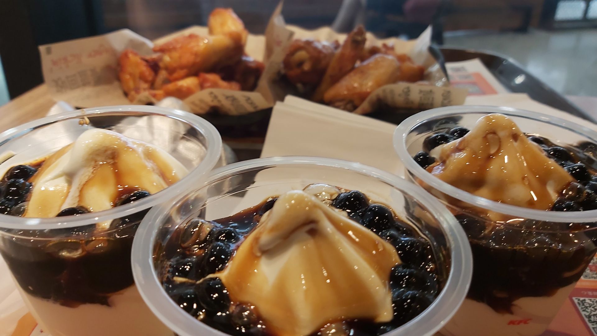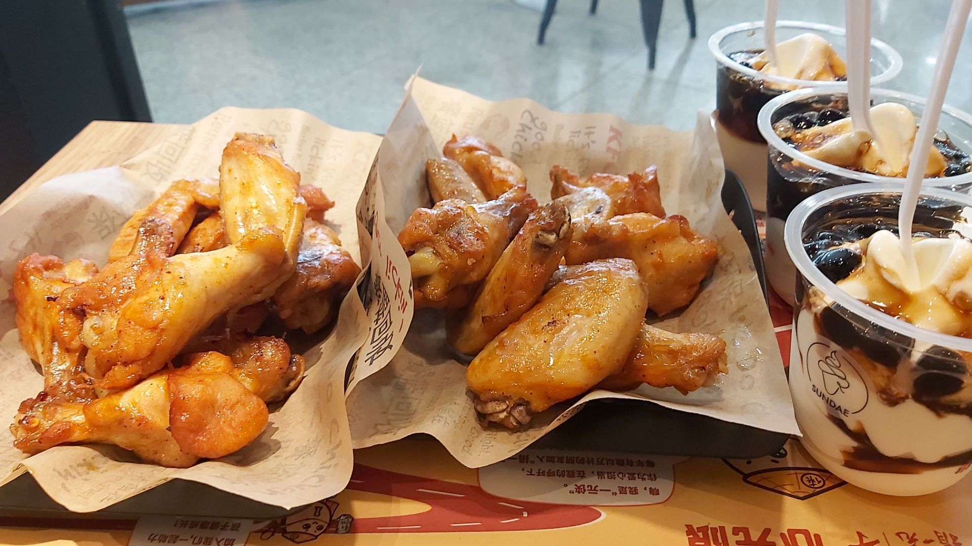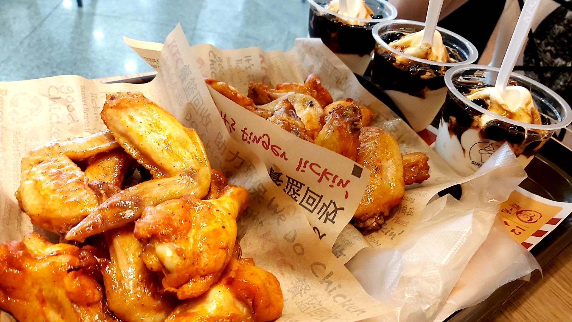 这次去肯德基,买了十份奥尔良烤翅,加三杯新地,三个人的中餐,算很丰盛了这次去肯德基,买了十份奥尔良烤翅,加三杯新地,三个人的中餐,算很丰盛了。推荐肯德基的奥尔良烤翅,可以说是所有烤翅里味道最棒的。冰淇淋也很好,黑珍珠口味,强烈推荐。