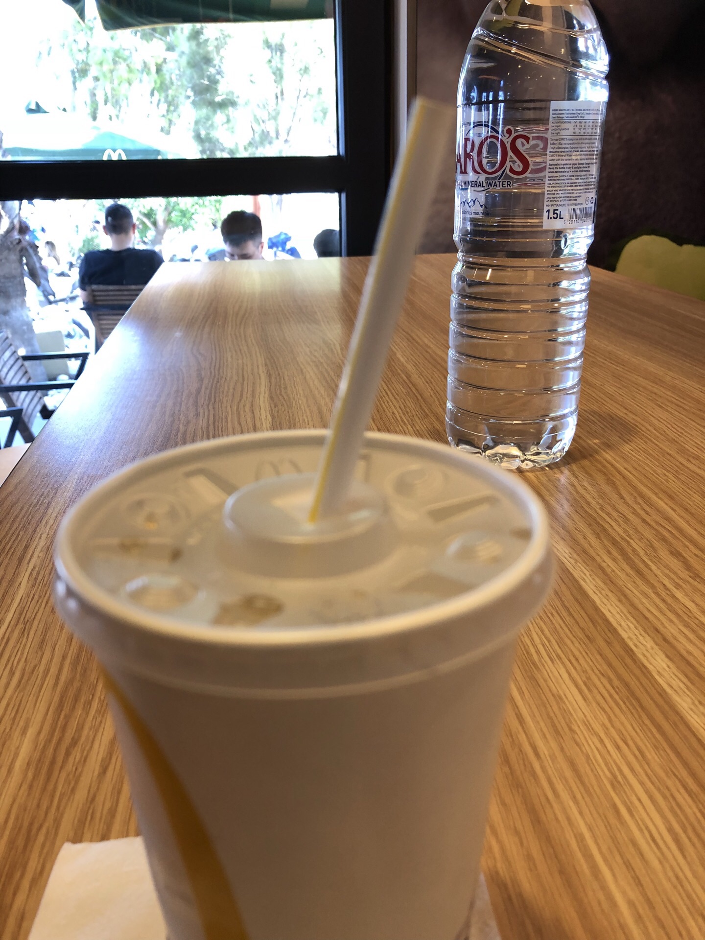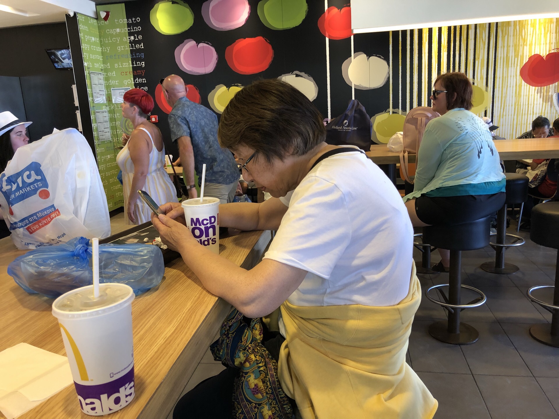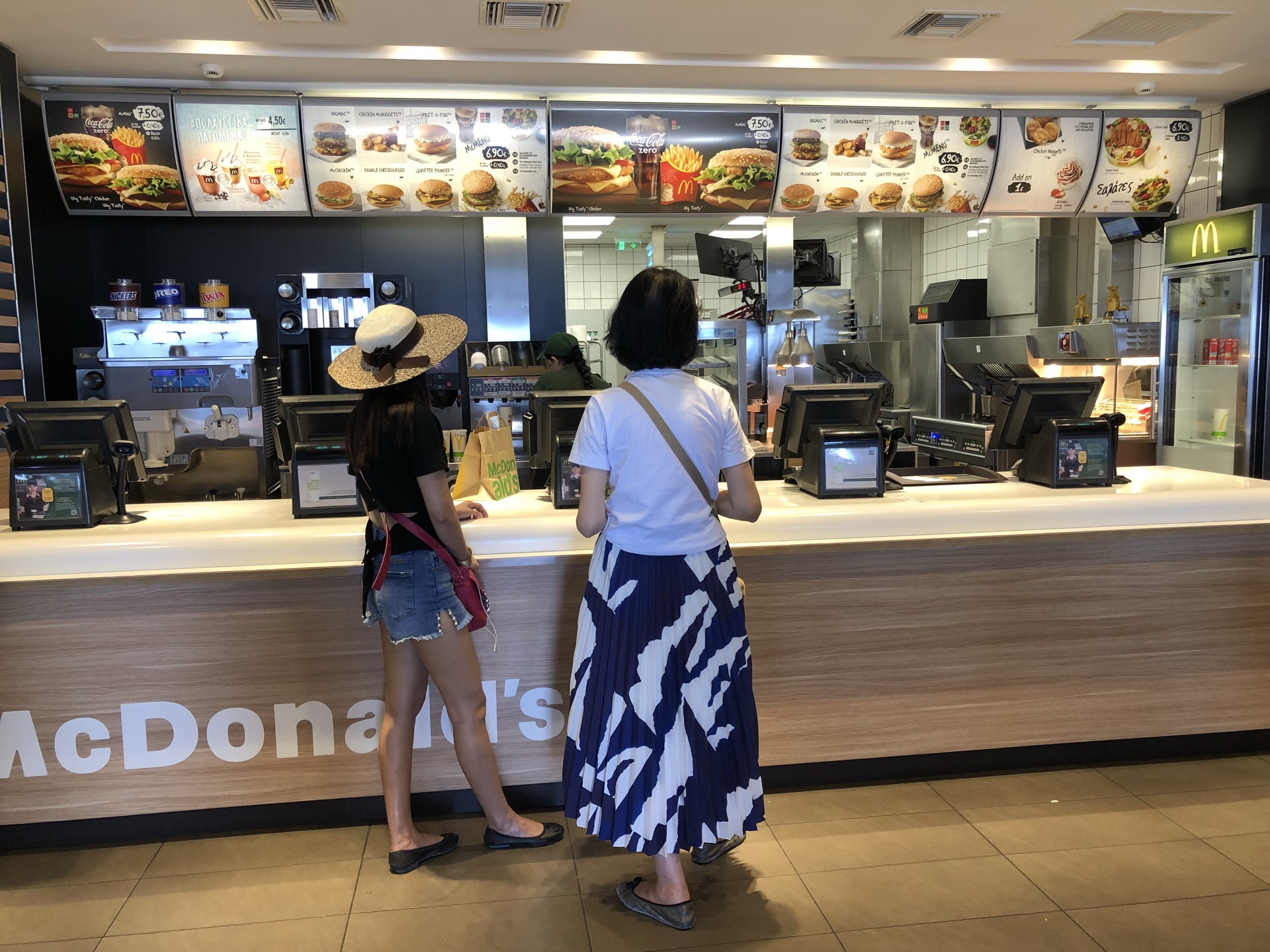 逛费拉小镇,逛累了就到镇上的麦当劳喝饮料歇歇。几个人要了两杯2.90欧元的,4杯2.60欧元的,大概相当于我们的中可小可吧。麦当劳的斜对面有个公厕,如厕0.5欧元。在麦当劳发现凭收银条的密码可以免费使用卫生间,还能省点钱。麦当劳室内室外都有座儿,环境不错。