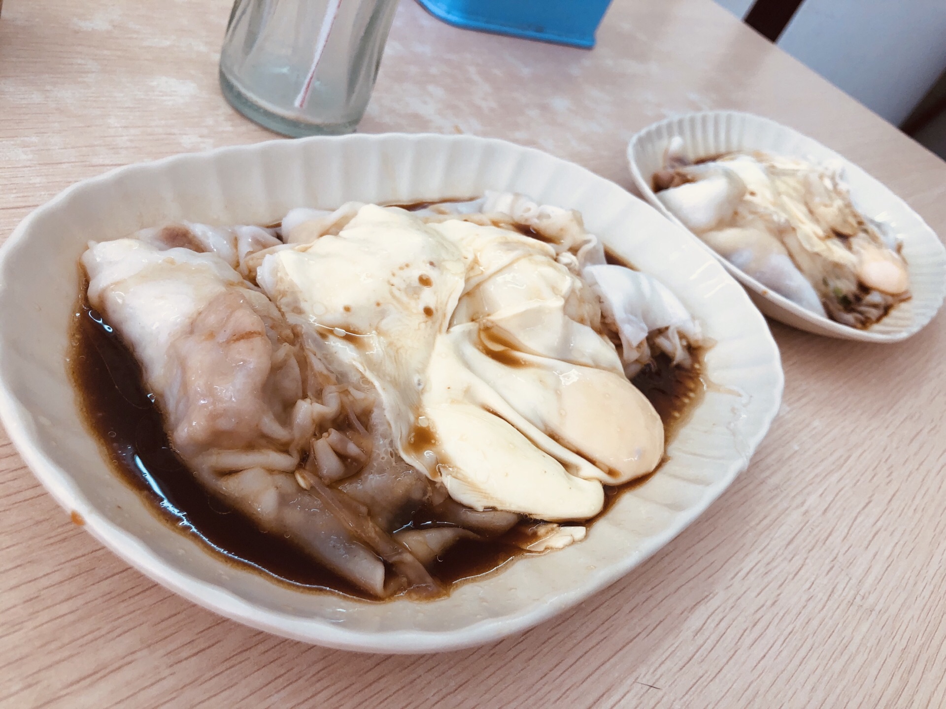 最近师傅吵着要吃肠粉呢,于是就跟着他一起跑到这家来吃,第一次吃这种里面带卧蛋的肠粉,因为之前在广州好像都没有台,遇到总体而言这个但是挺好吃的,然后不小心就破了,需要小心翼翼地吮吸才可以,但是味道总体感觉口感是不如广州那边的,也不知道为什么。
