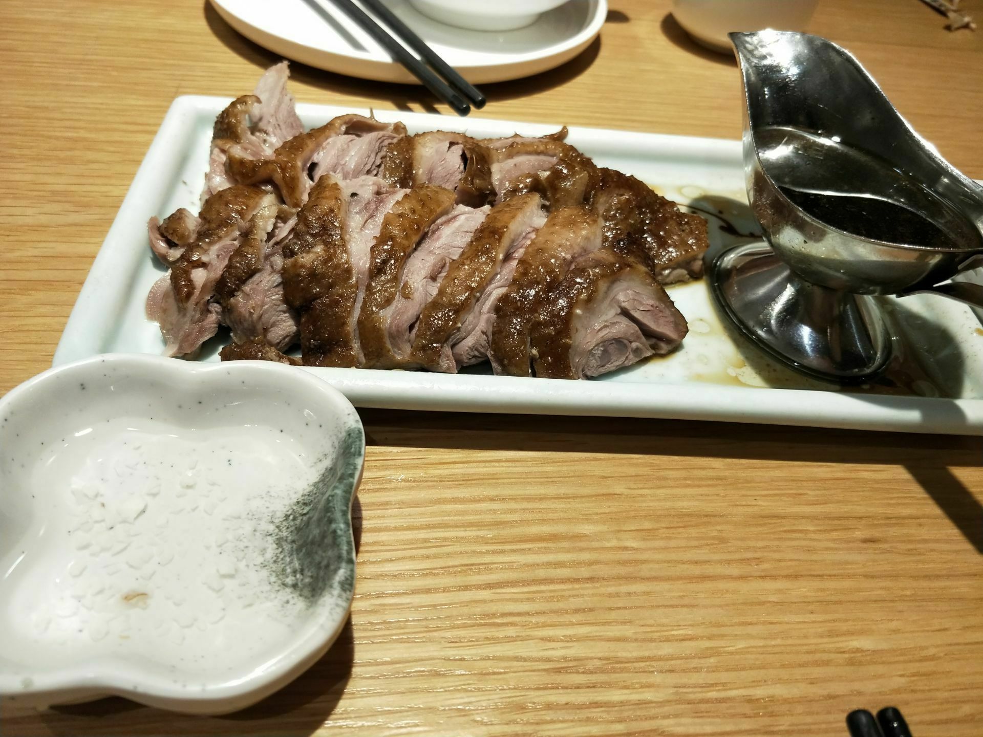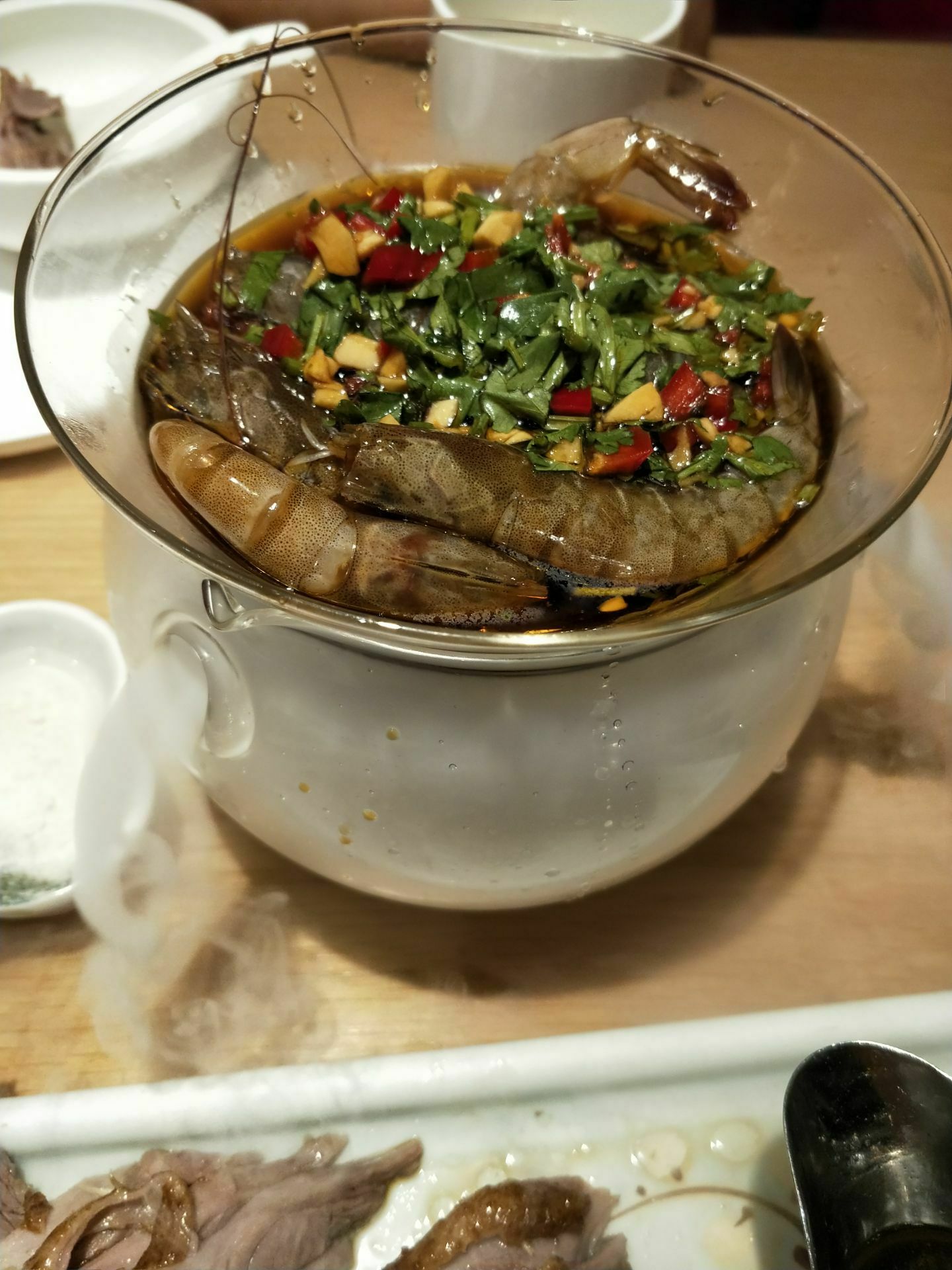 好久没喝到广东的粥了,特意选了这家店。广东人喜欢夜宵或者早茶喝粥,我们只有晚餐有时间。 点了招牌的鲍鱼干贝基围虾粥,另外配了卤虾、卤鹅和春菜。 熬粥需要点时间,粥煲得确实不错,里面的料也不少,确实很鲜。 卤虾有点和上海的糟虾差不多,但是汁不一样,入口时没有那么冲,但是味道不是很鲜,但是吃到虾肉后回甘很甜。 卤鹅的鹅肉还是很嫩的,调的卤汁也不是那种重口味的,清淡但又不失鹅的本味,就是刀功稍差,好多都没切断。 春菜是第一次吃,用豆酱烧,单吃豆酱太咸了,两者一起烧,刚刚好,菜也很嫩。