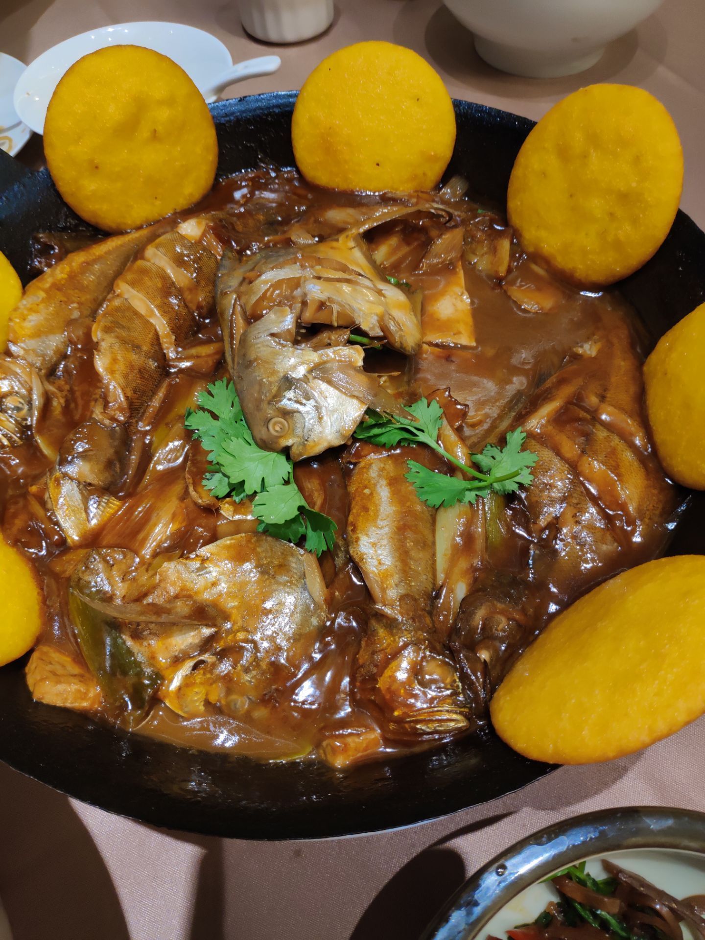 ...北菜,原来是山东菜啊,只有胶东半岛才会有这么丰富的海鱼资源,一锅七八条呢,边上贴的面饼可好吃了铁锅烧鱼,以前认为这是东北菜,原来是山东菜啊,只有胶东半岛才会有这么丰富的海鱼资源,一锅七八条呢,边上贴的面饼可好吃了。香辣带鱼和鲜虾粉丝煲也强烈推荐。