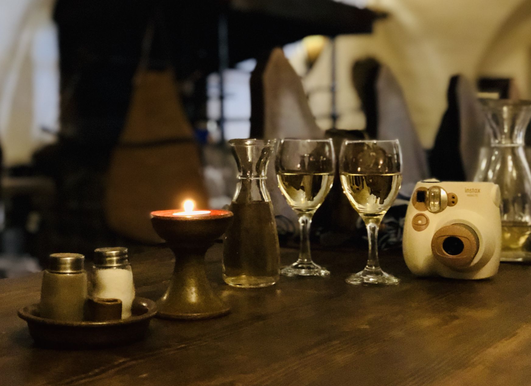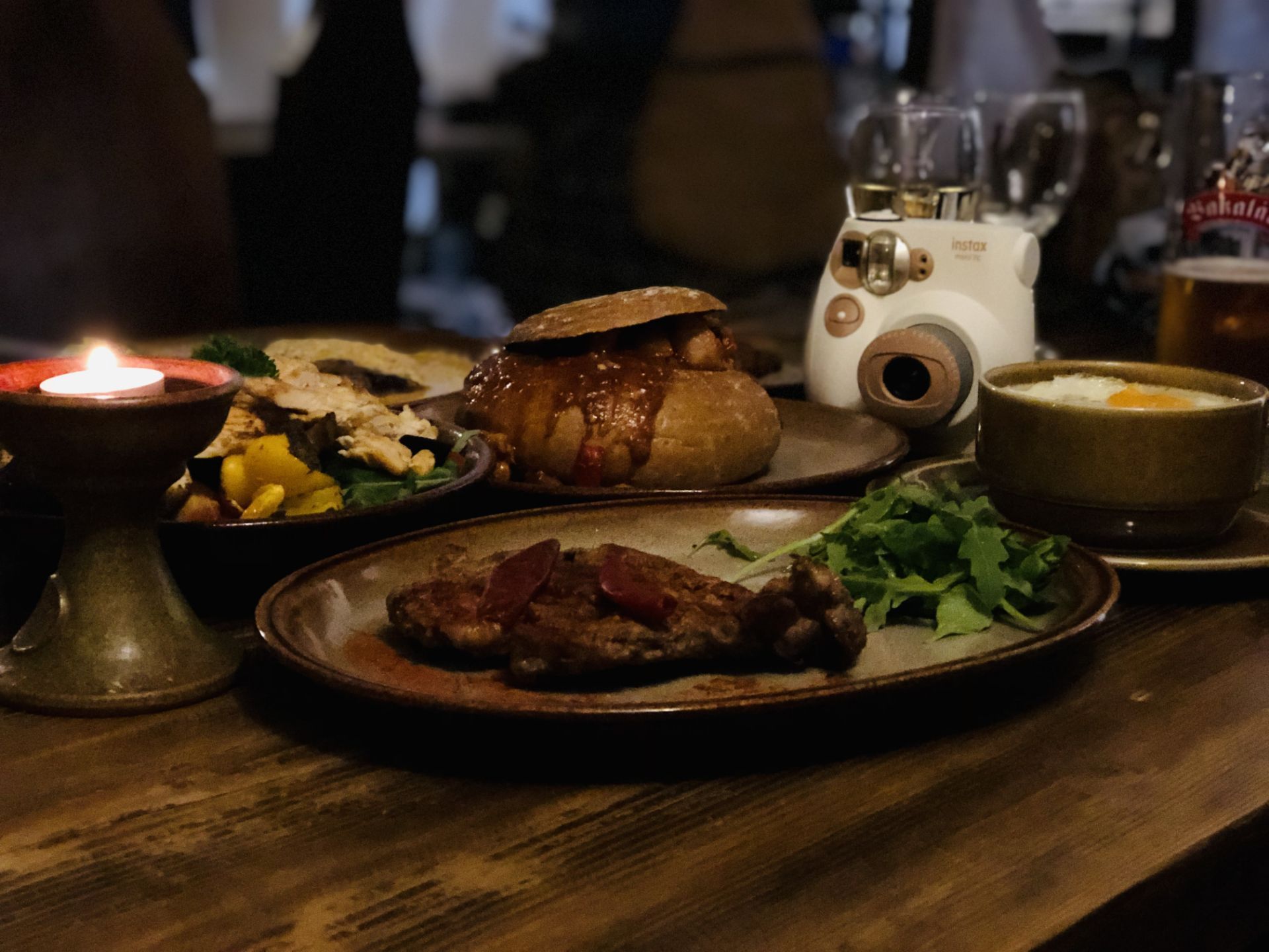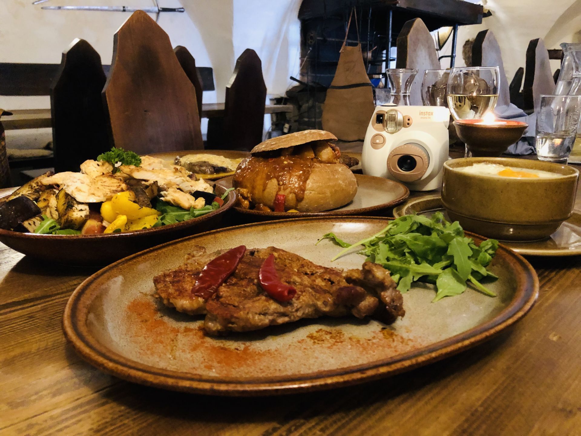 口味和服务都很不错,就是上菜速度慢了点,很安静的用餐环境,地窖式餐厅,天然烛光,也有透明窗顶,照的到日光的位置。 一份鸡肉沙拉,波西米亚浓汤,牛排,猪排(这个猪排很好吃,肉很敦实很嫩),面包裹着肉和汤(特色,特别好吃),啤酒和白葡萄酒,四个人人均才100人民币,太完美了。