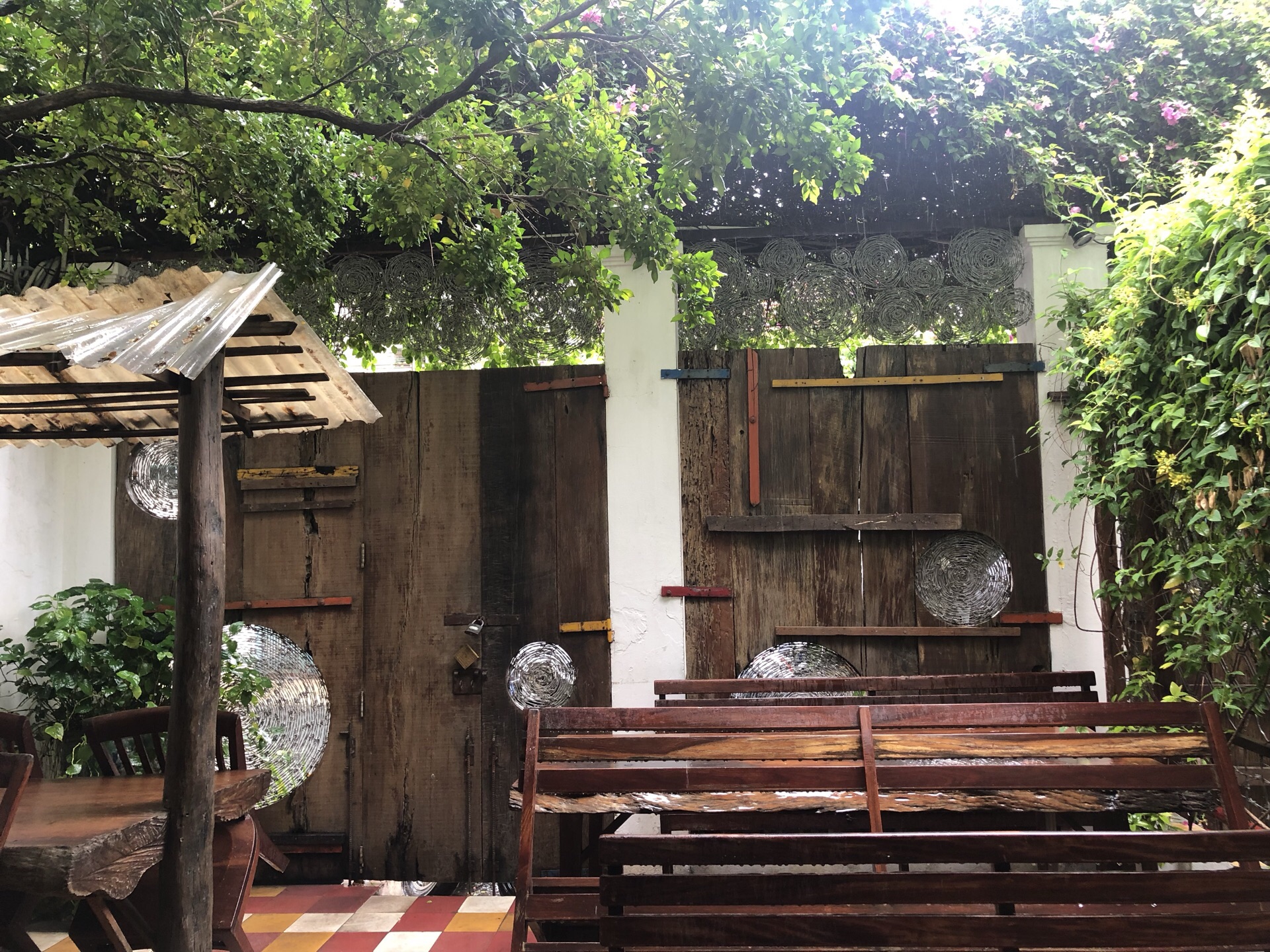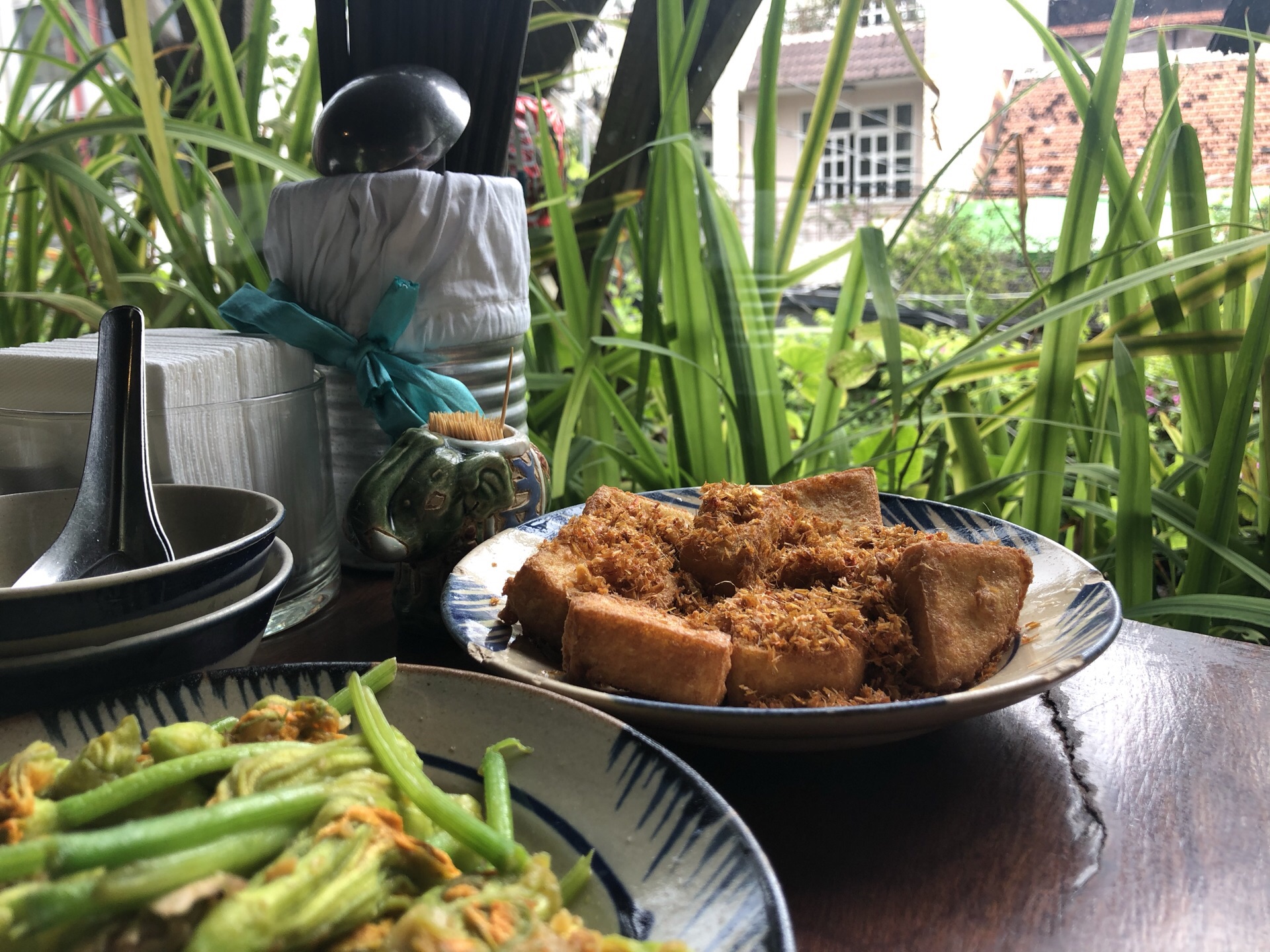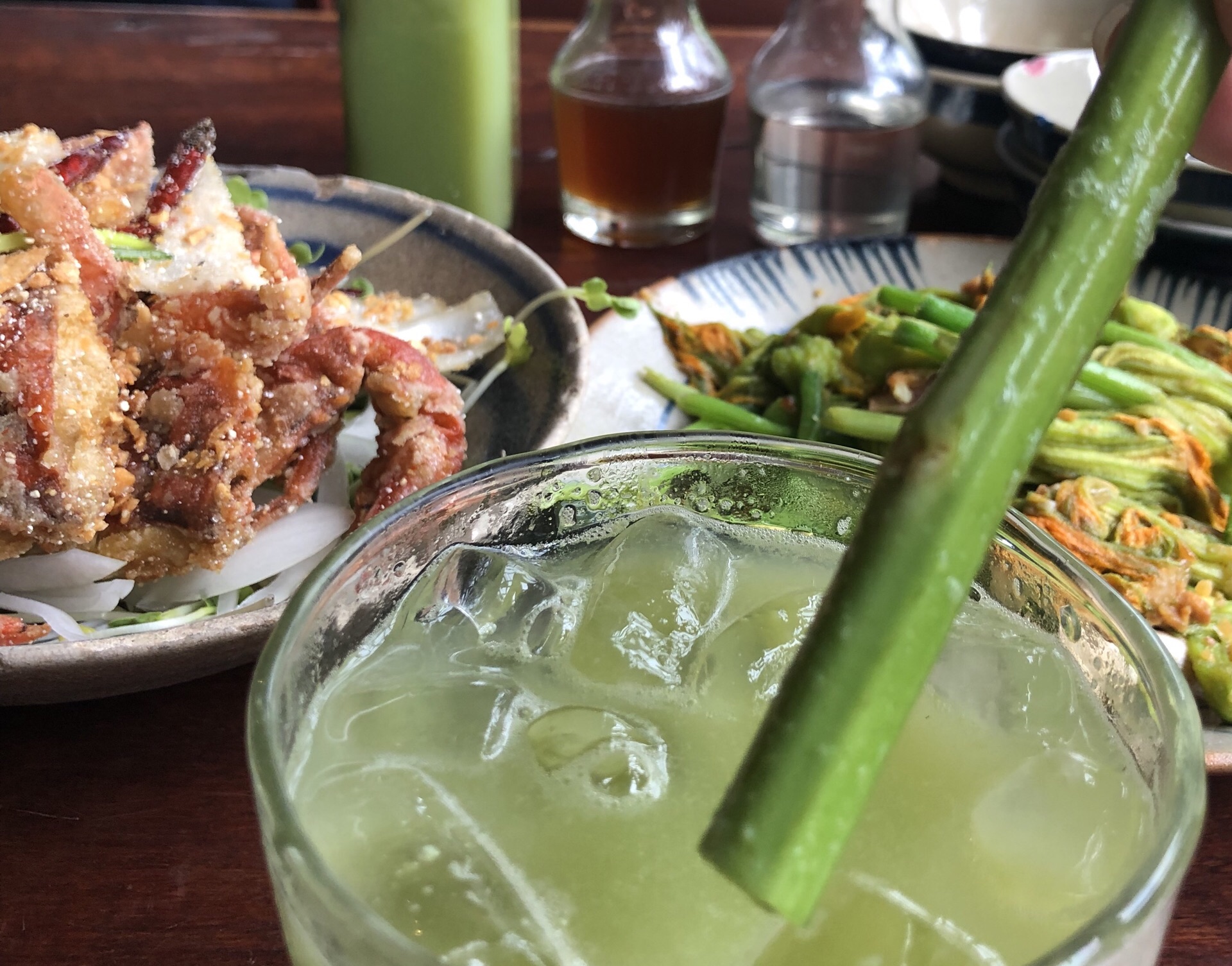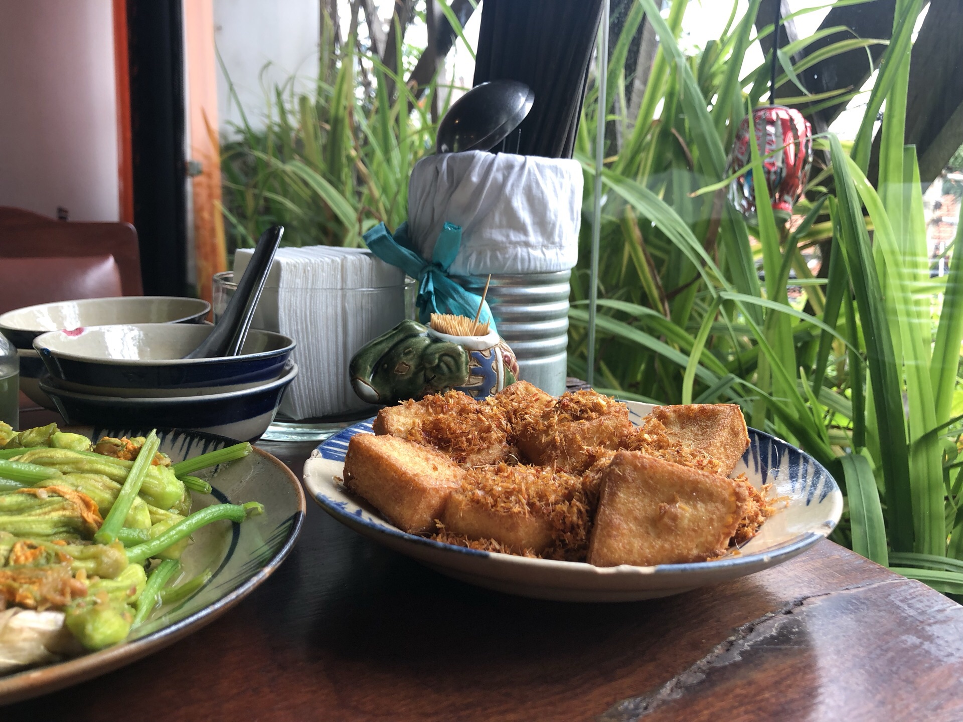有点特色。豆腐、软壳蟹和南瓜花蒂,饮料越南苹果配蜂蜜,一个人吃得很饱,600千不到一点。有会说中文的服务员,外国食客多一点。