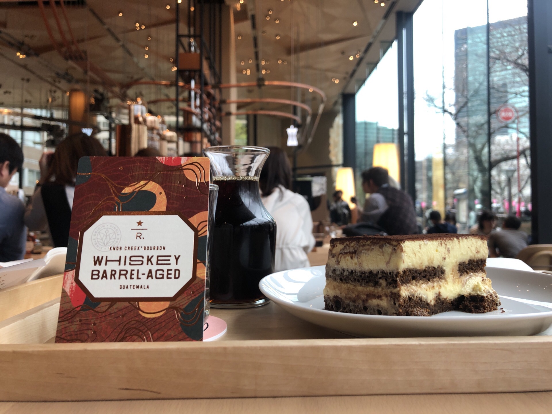 由隈研吾操刀的星巴克亞洲代表作,無論選址、建築或內裝都具高水準,尤其銅製櫻花落雨裝飾非常有創意由隈研吾操刀的星巴克亞洲代表作,無論選址、建築或內裝都具高水準,尤其銅製櫻花落雨裝飾非常有創意。 威士忌桶熟成冰釀咖啡有著特殊的酒香,但帶甜不是我的菜,搭配名店Princi 的提拉米蘇,十分相襯。