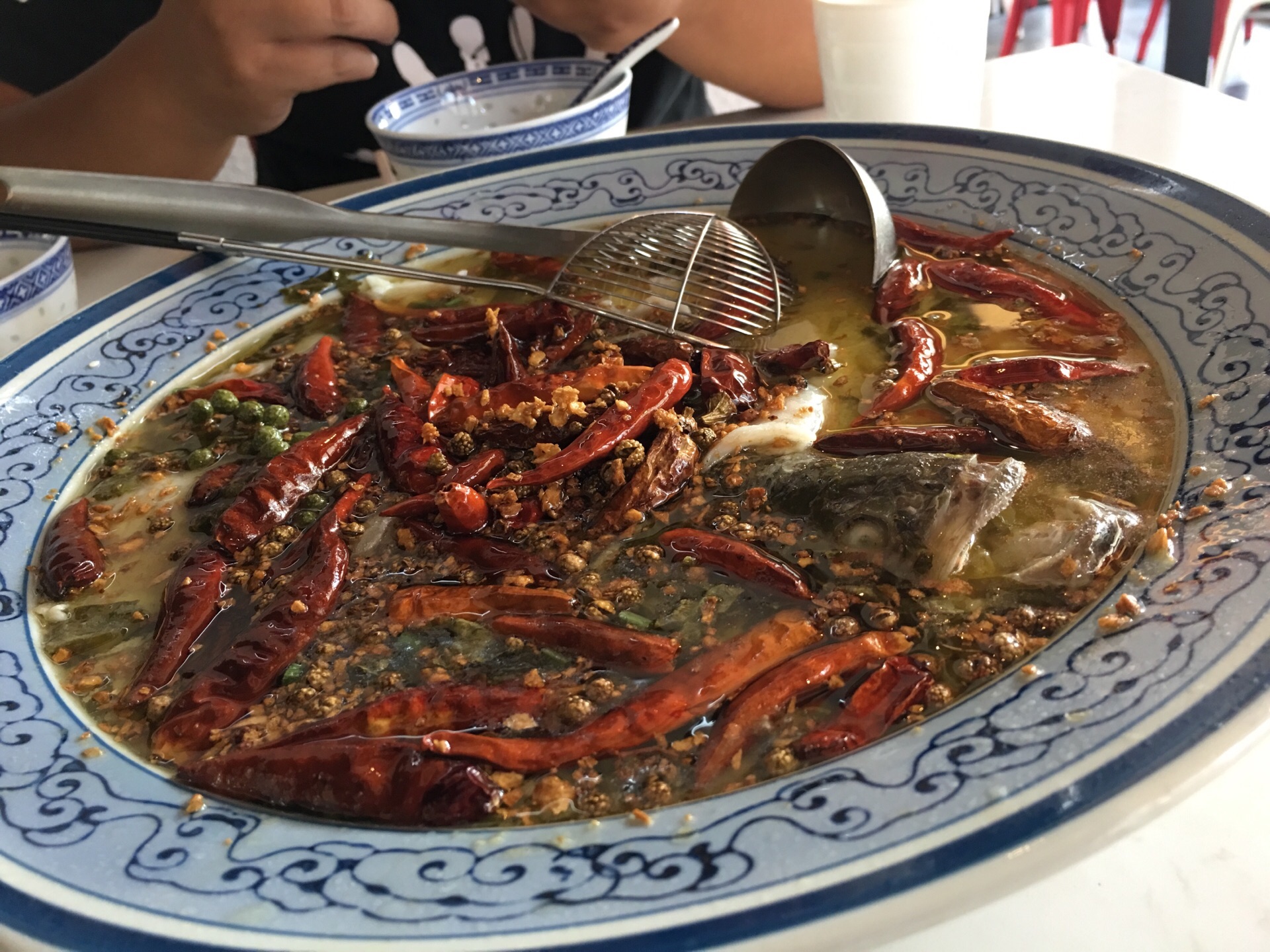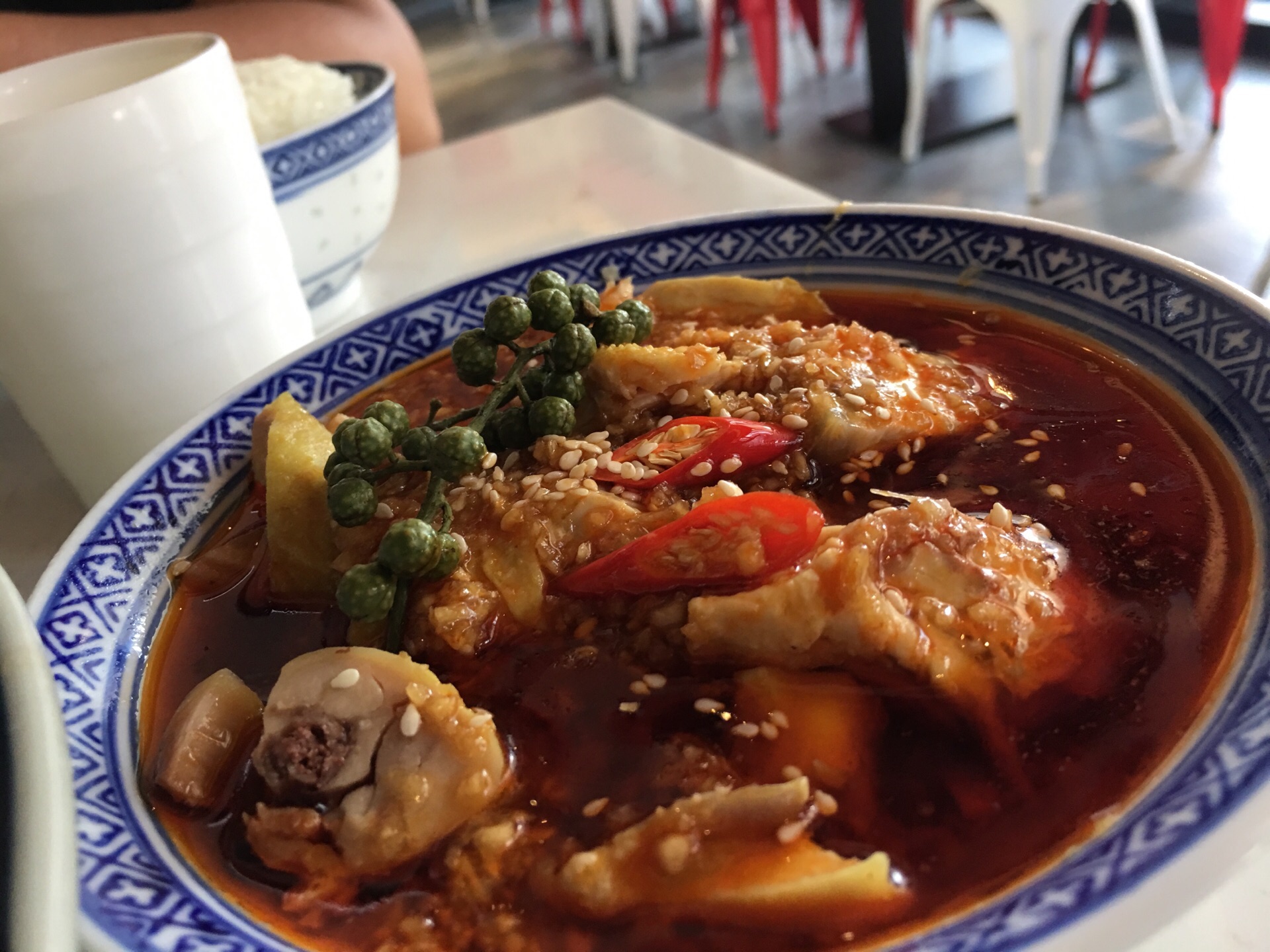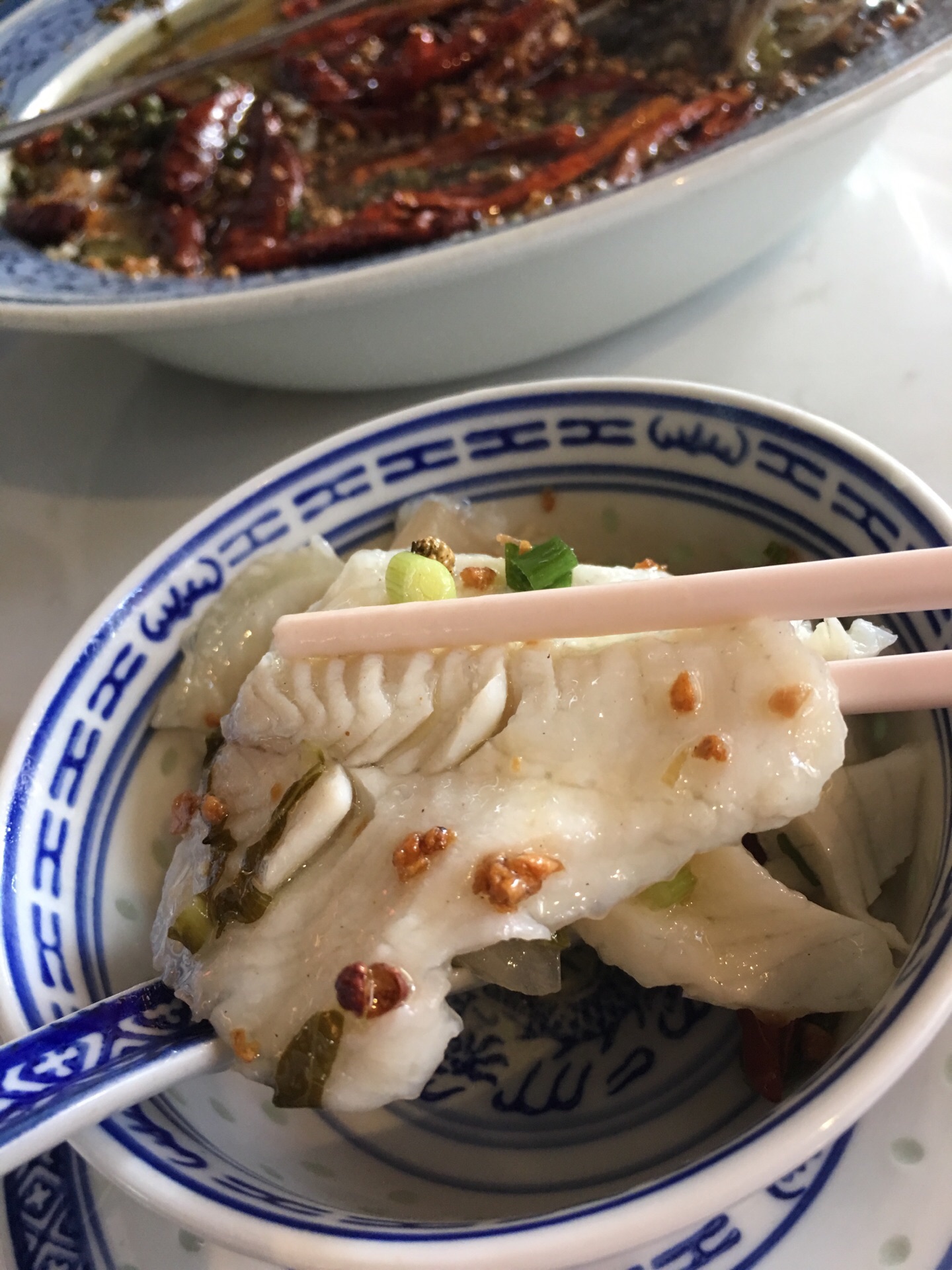 『荣耀走场』 朕已到达八鲜过海东海泰禾店现场 最近这记性差点都忘了发点评了 店址就在小龙坎火锅楼上好像也只有他们一家 落地大窗光线充足整体很舒适 「招牌酸菜鲈鱼」肉质鲜嫩辣度适中值得推荐 「开胃鱼皮」量少鱼皮偏软不够脆,一般 「口水鸡」可以说百吃不厌每次必点 「红润」饭后必备甜点强烈推荐 整体服务不错,上菜速度有点偏慢,继续加油,退朝!