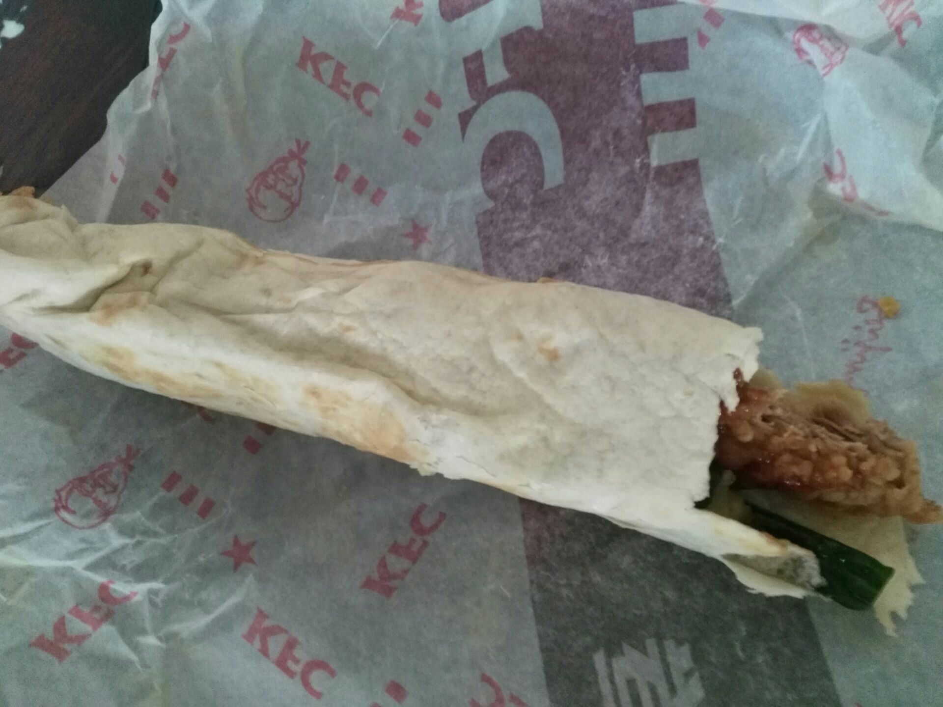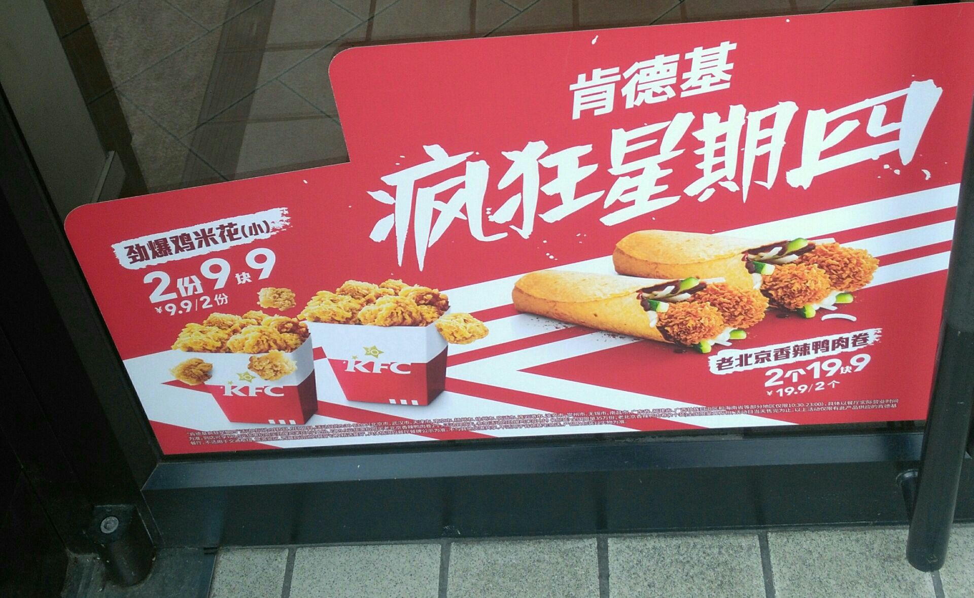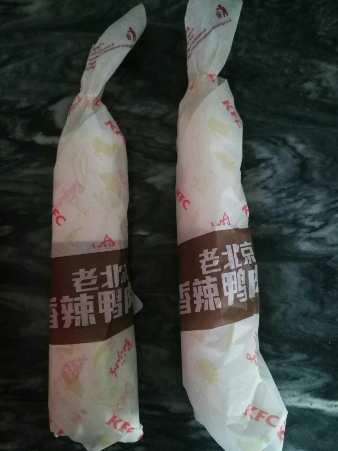 肯德基虎门步行街店(二) 正好是周四中午来到肯德基虎门步行街店,看到有疯狂星期四的活动(见图一)。尝试一下老北京香辣鸭肉卷吧,两个19.9元(见图二)。里面有点鸭肉,几块黄瓜条和些许甜面酱,有一点点辣,味道还行(见图三)。