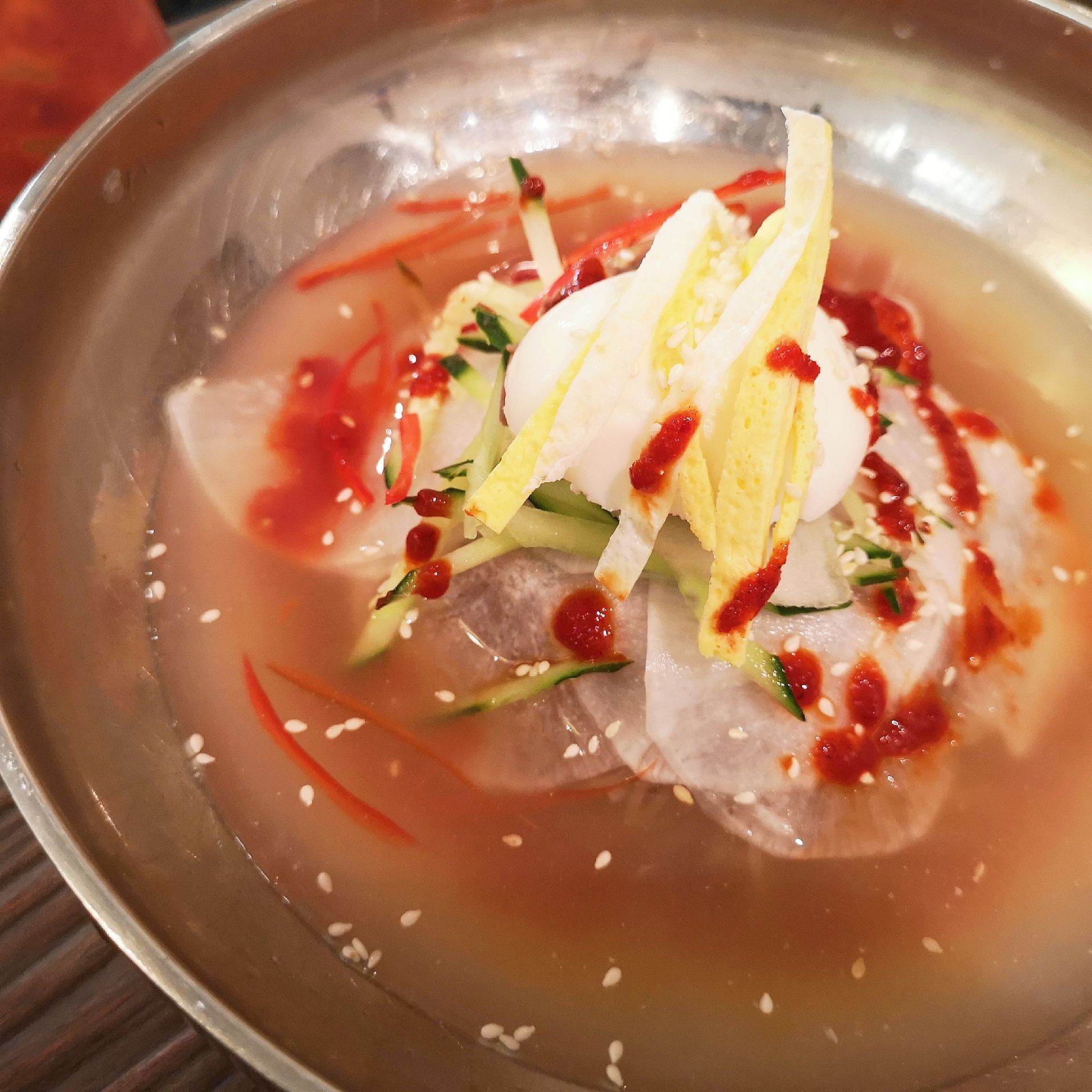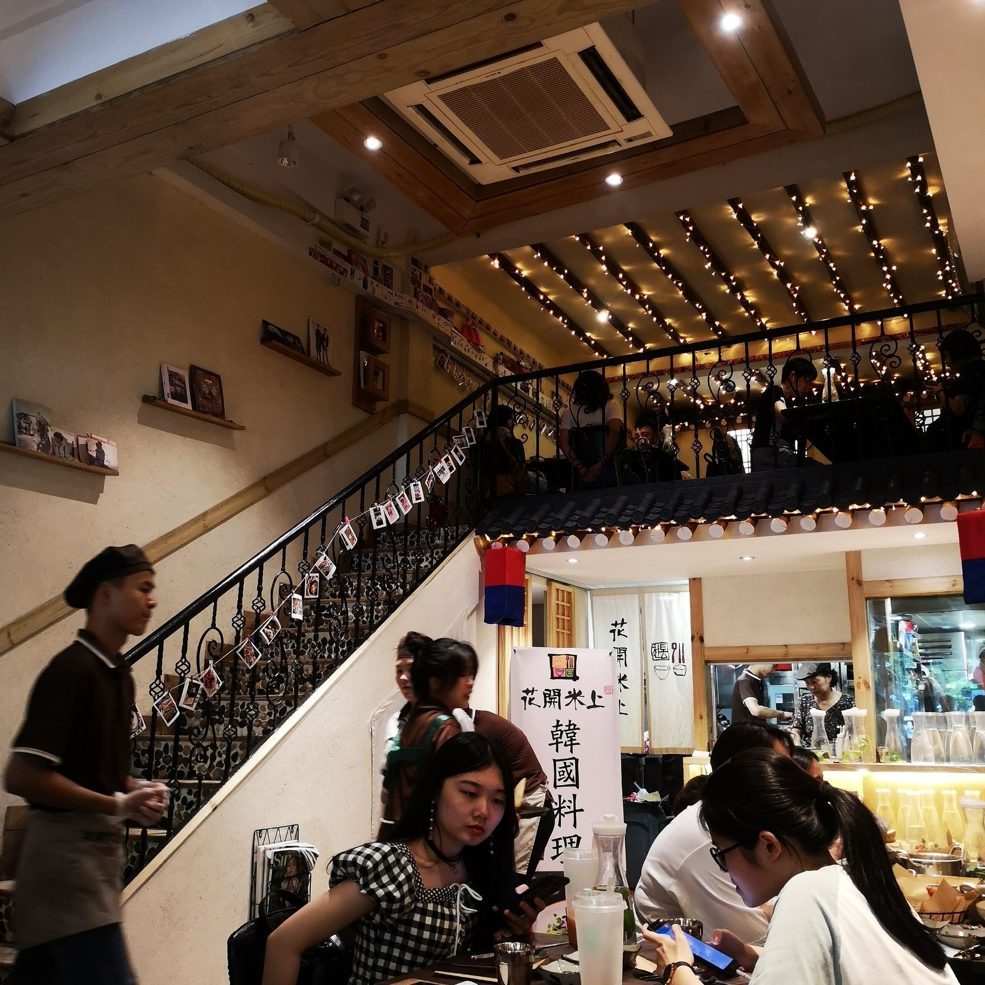 位于惠福东路和教育路转角位置的韩国料理店,最近新开的店,没有想到人气十足。周末中午1点多去也需要等位,大约40分钟。店铺不大,不过有小夹层二楼,空调够力不怕热。装修风格以韩国歌手等等来装饰。可以微信下单十分方便,店员服务态度积极。双拼炸鸡味道可以,蜂蜜味道比较甜,辣味只有一开始辣后面不辣,好在粉皮不多。水冷面冰冰凉凉,和炸鸡一起吃很搭。鱼饼汤也可以,汤底很香的海带味道。有现金券可以用优惠一点,人均不算贵。