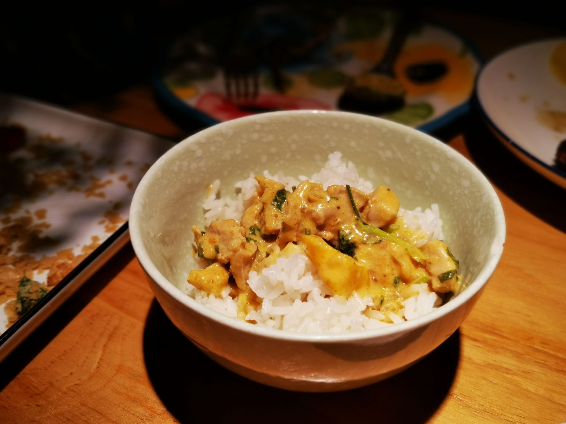 但这道菜的最佳打开方式,是用来拌饭,咖喱汤汁配茉莉香米,好吃到飞起。咖喱味道浓郁,里面的鸡肉鲜嫩入味