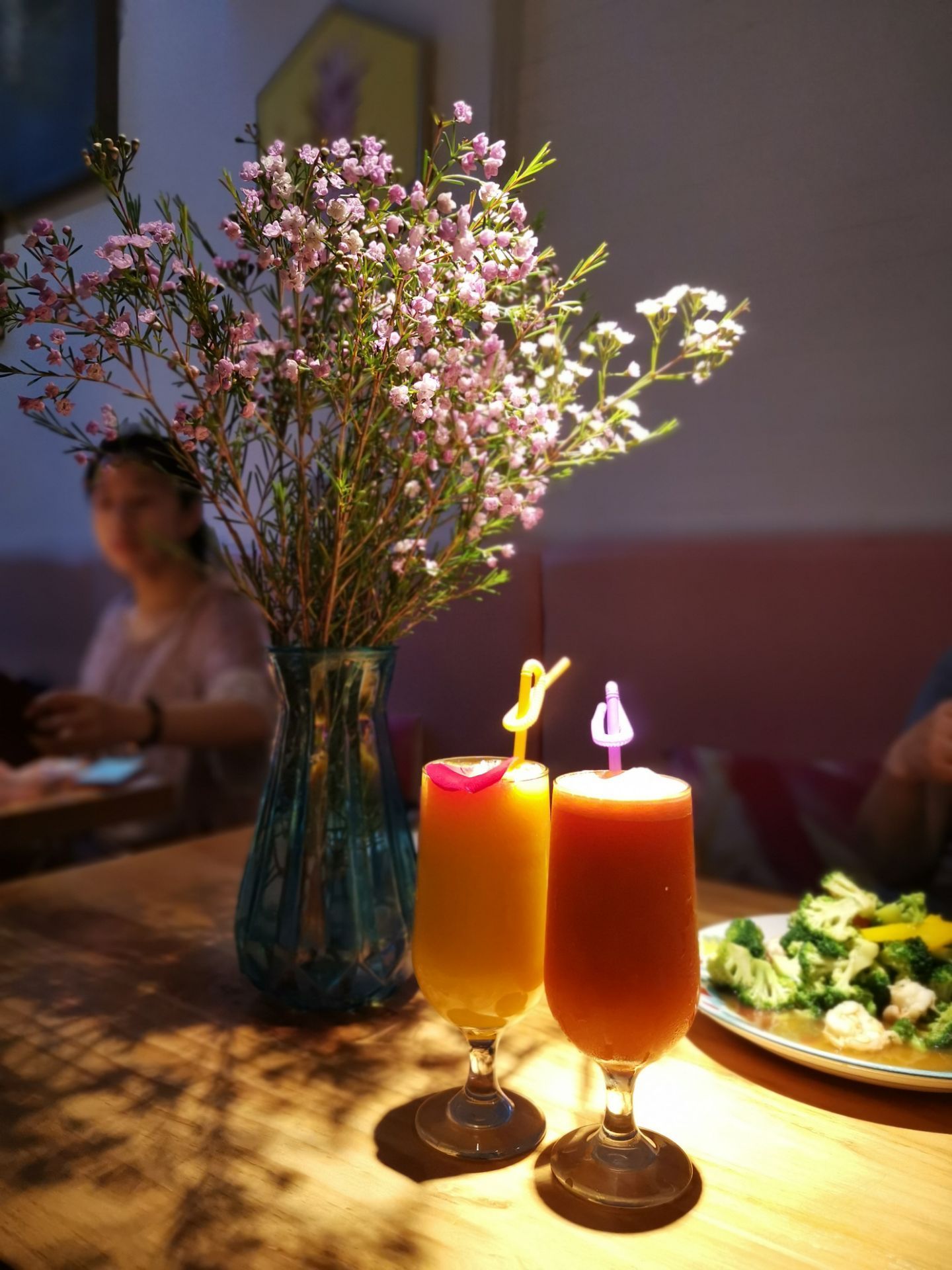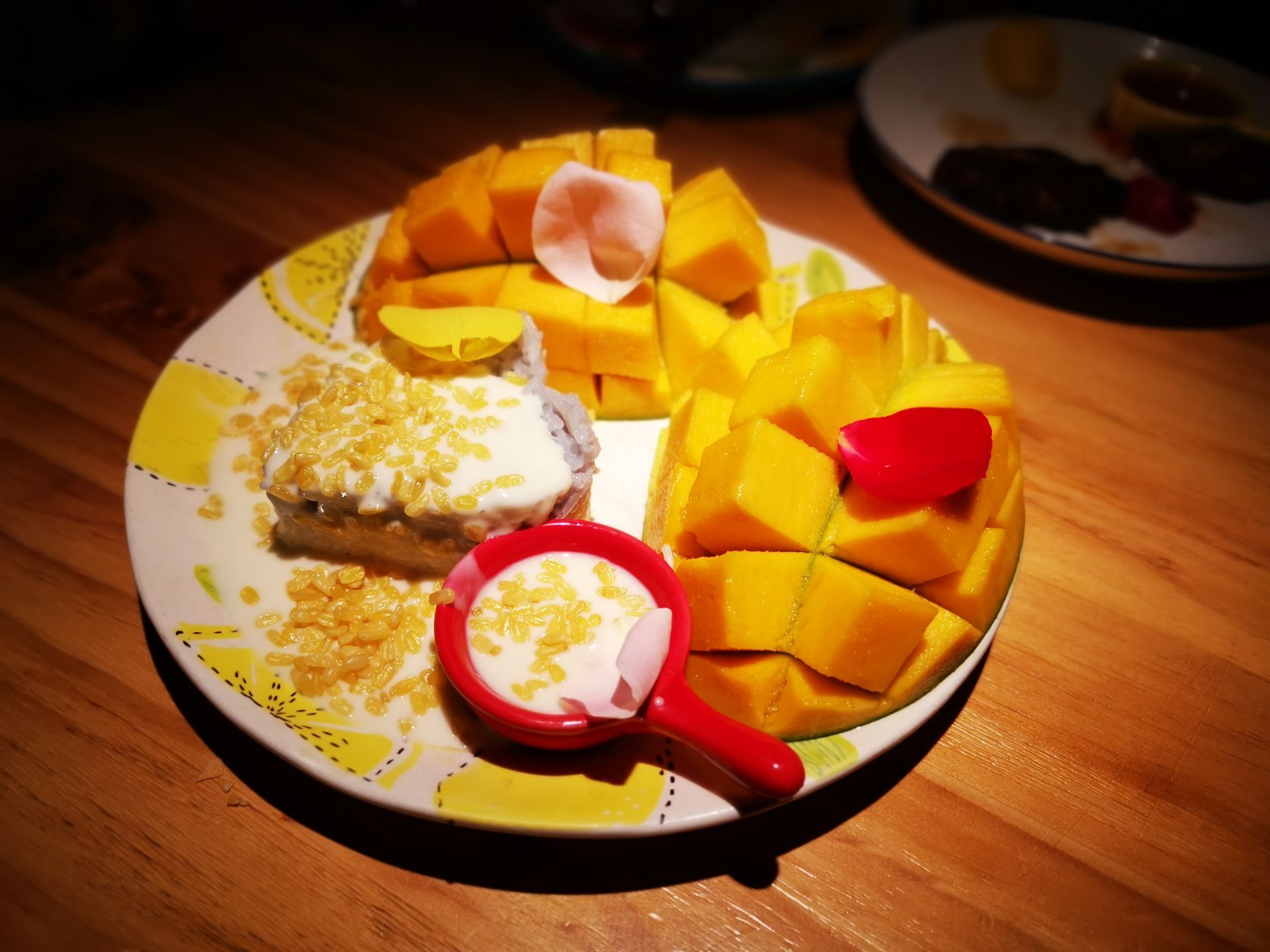 >>>环境 这是第三次来,花泰的门口以上放上了2019必吃榜上榜餐厅的牌子。拍照打卡、等位用餐的人络绎不绝,不过我的小伙伴已经早早的帮我们占好座了。 她家3-4人的桌子特别少,一定要早点去。整个餐厅倒出都是花花草草,真的假的,红的粉的,让人看了心情大好。 >>>菜品 花泰女皇咖喱 48元。女皇咖喱的玫瑰花瓣上恰到好处的滴了几滴椰奶,这大概就是所谓的娇艳欲滴。咖喱味道浓郁,里面的鸡肉鲜嫩入味。但这道菜的最佳打开方式,是用来拌饭,咖喱汤汁配茉莉香米,好吃到飞起。 麦片虾球 98元。这次吃到的新菜。虾球埋在麦片堆里,让我想到了另一道菜风沙仔排。虾球真的超级大,Q弹饱满,奶香十足。麦片里面还混着炸过的罗勒叶,香香脆脆也非常好吃。 芒果糯米饭 48元。两大块芒果,配了压制成心形的糯米饭,光是颜值就让人少女心炸裂。想要食用方便,可以请服务员帮忙去掉芒果皮。去完皮后发现芒果真的很多,而且非常香甜。糯米饭有3层,顶上洒的是黄色的脆米,下面紫色的是蝶豆花染的一层,最底下就是糯米饭了。三种混着吃,配上椰奶,又脆又软糯的口感,实在太迷人了。 西兰花炒大虾 58元。三次来都吃了这道菜,汤水依旧很多,大概就是特色。大虾个头也很大,西蓝花很清爽很脆嫩。 泰国炸鸡 42元。炸鸡用的多是切开的鸡翅,不拖面粉炸的,稍微有点焦。远远的看还以为是什么炸蚂蚱呢。不过味道很棒很香,蘸点甜辣酱更有滋味。 香蕉烤馕 20元。额外送了烤馕,选了最爱的香蕉味。趁热吃哦,享受又脆又有韧性的那种口感。 芒果汁、胡萝卜苹果汁 两款都是42元。原价价格较高,但确实是实打实的果汁,很好喝哦。 经典泰式奶茶 38元。三人前往,额外赠送一杯饮料,选了奶茶,居然也让我惊喜。茶香浓郁,奶味醇厚,又带点微微的苦味,恰到好处!