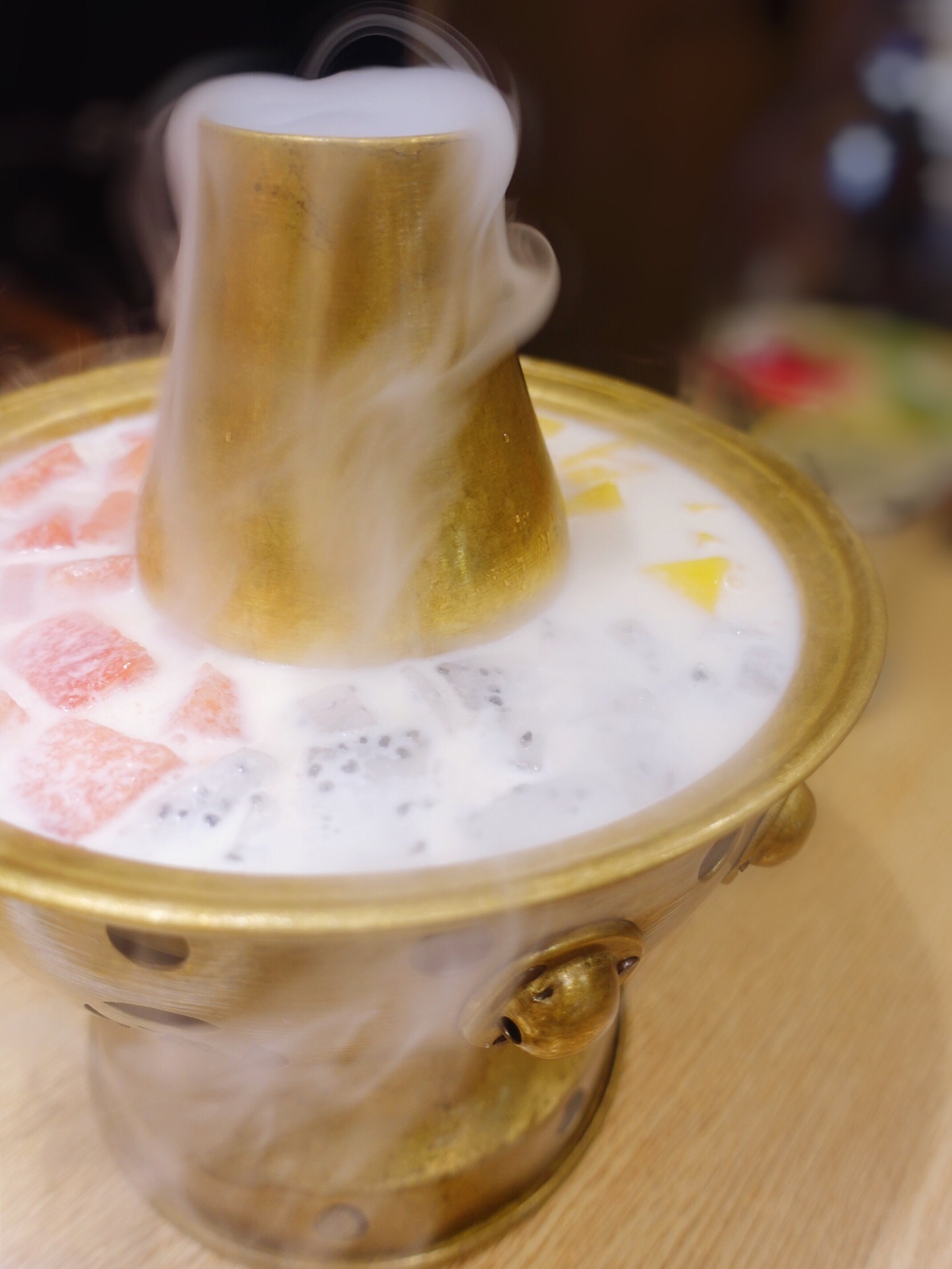 一层蛙锅不够吃必须来个双层锅 等待蛙锅的时候先来份网红水果捞 烟雾缭绕很飘逸 香甜牛奶加了各种...