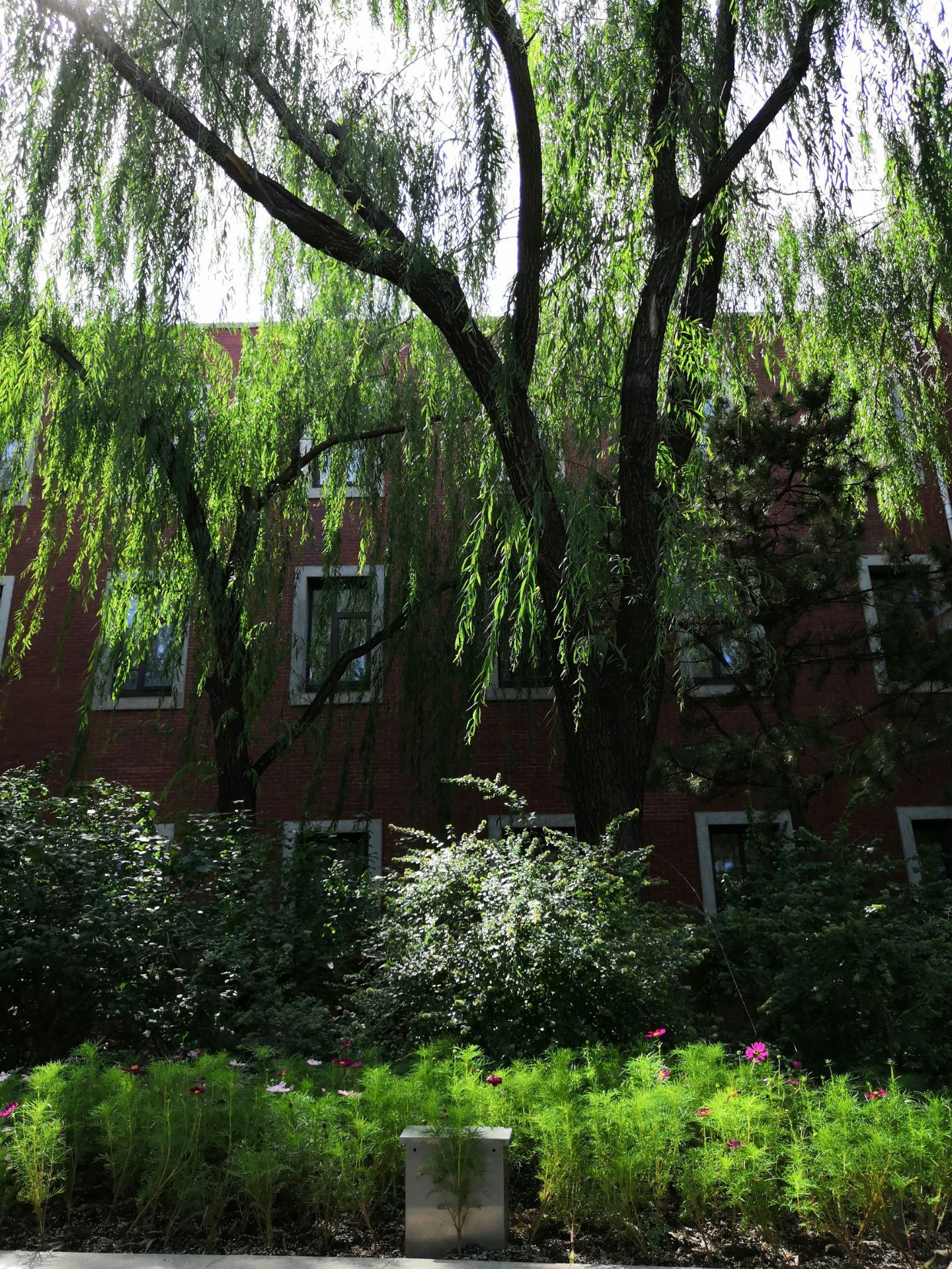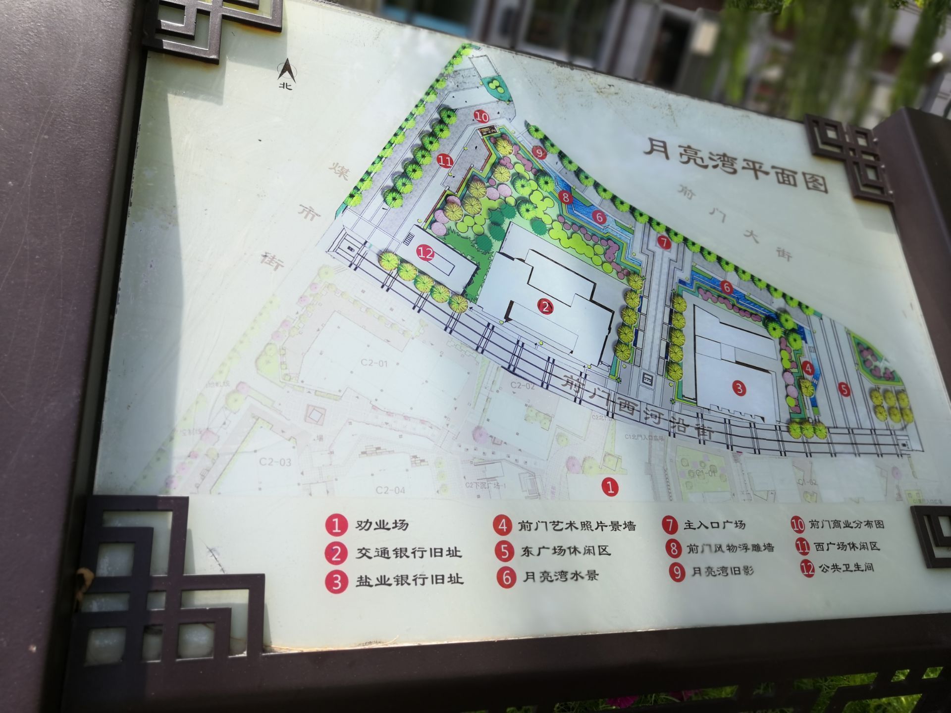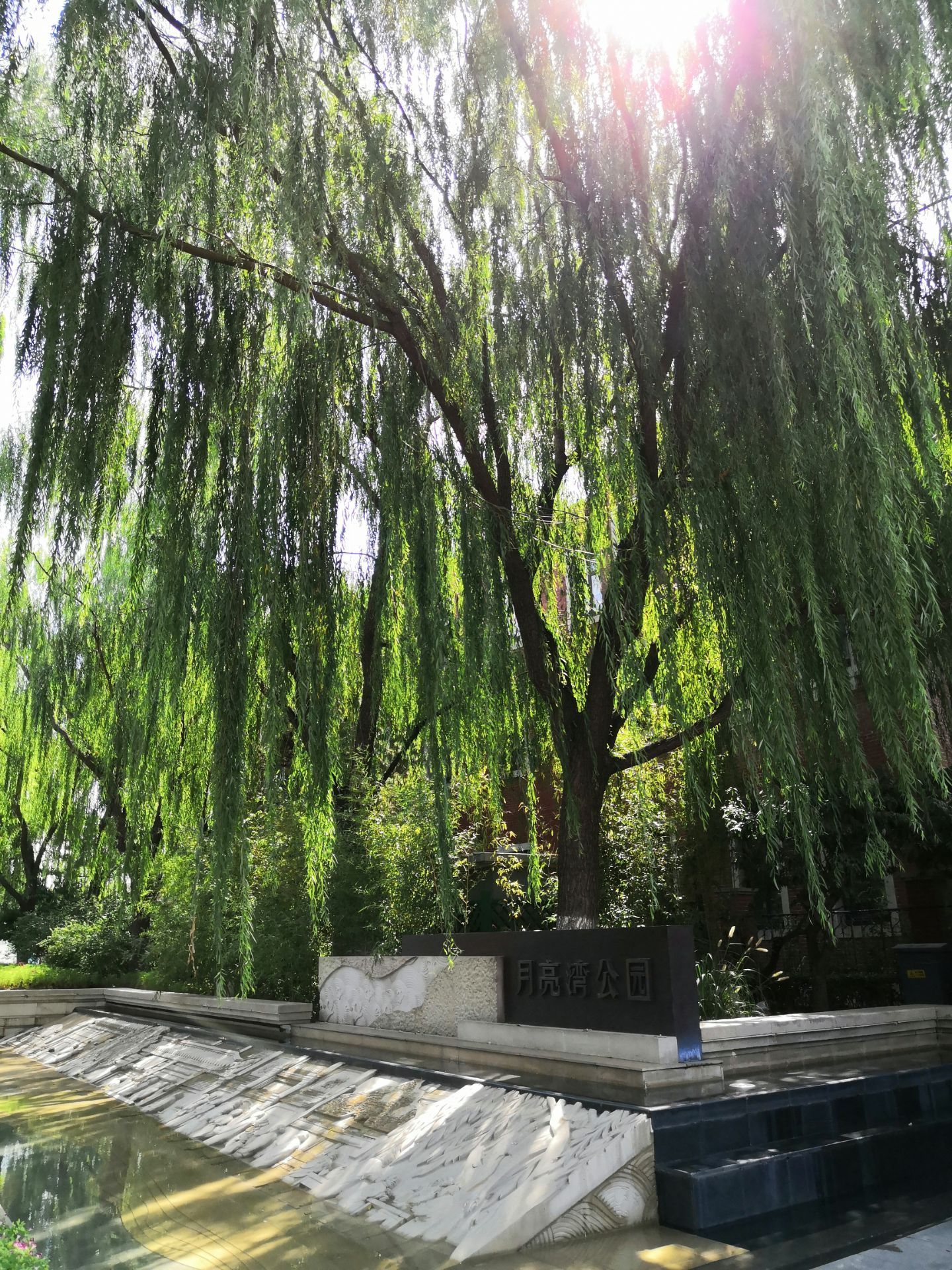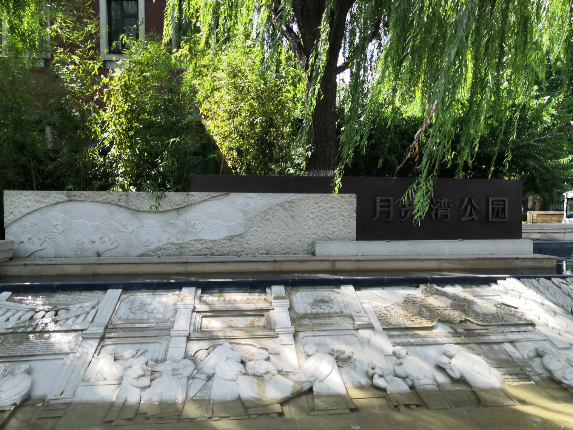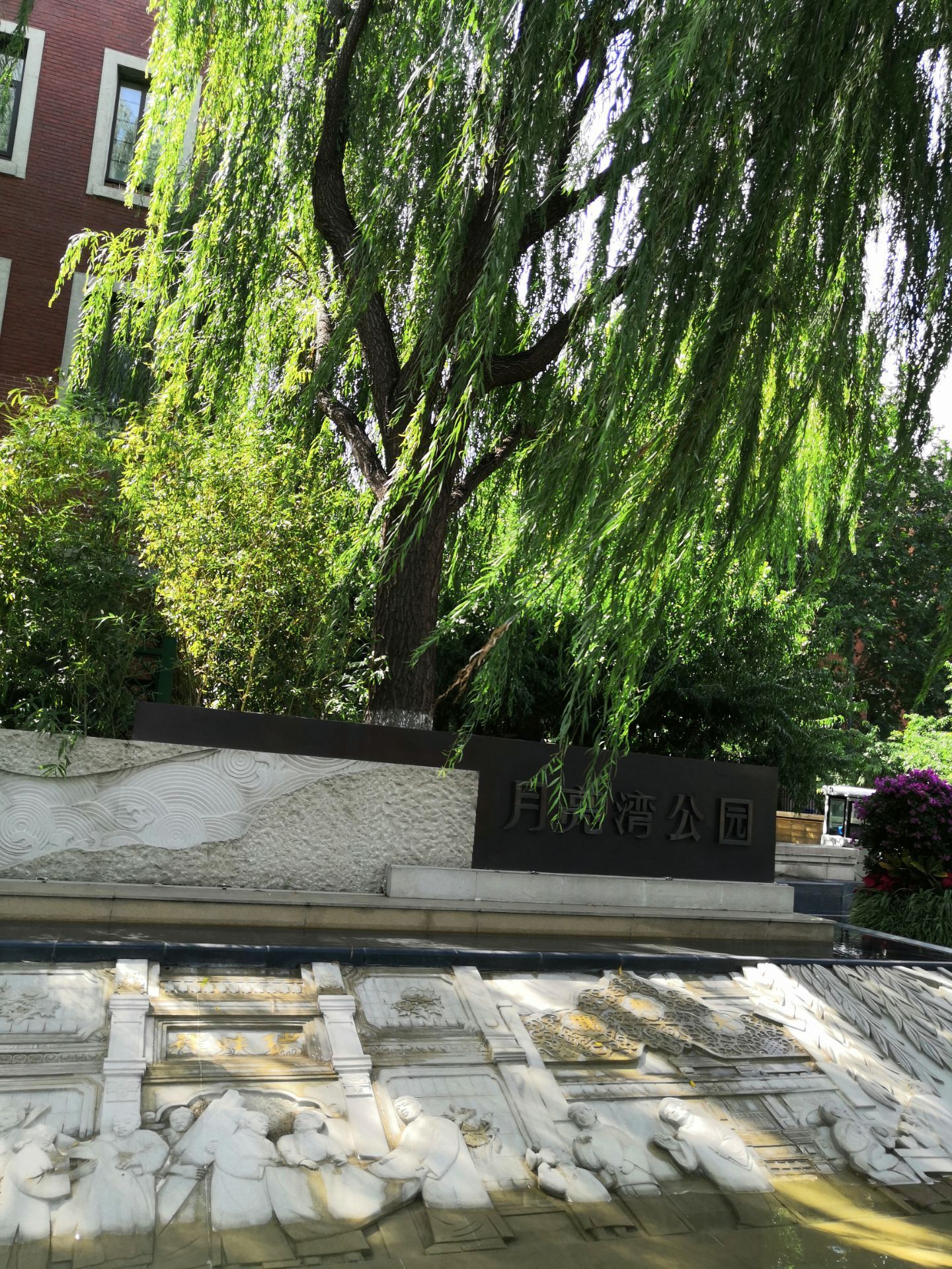 坐公交车去前门大街,下车后看到流水和垂柳,月亮湾公园的名字映入眼帘。真的没有注意过这个地方,水边是浮雕,浮雕主要展现北京前门大街老北京的商业民俗风情,通过月亮湾的水景浮雕展现前门大街昔日商业往来的热闹景象。浮雕以张一元、内联升、全聚德等前门老店铺为背景,点缀从事经典商业活动的人物场景。池底为传统的装饰水纹,在池边辅以等高线状的地形层次,形成月亮湾的驳岸。转过去就是前门大街了。