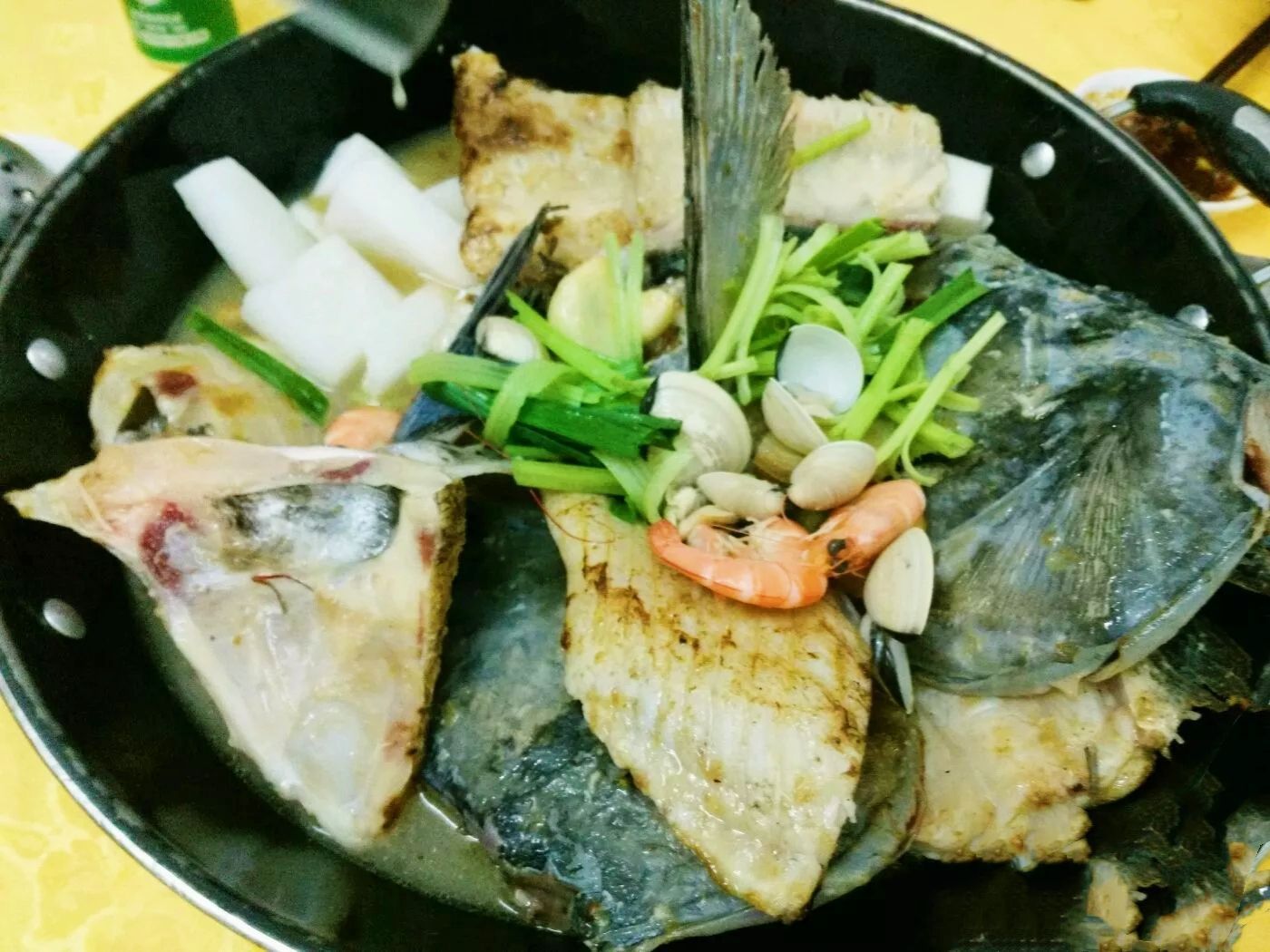 首先必须要提示一下,这家店是在顺德碧桂园后面的碧江村里面,所以地址有问题,绝对不是在越秀区。 这家店是家人开车一起去吃饭的,有车去比较方便,走广珠西高速下来再去很近。停车的话停在后门比较多车位,前门通常都会比较多车停,未必一定有位置停车。 这家店总体装修风格就是典型的岭南大屋,青砖瓦片,而且是在原来的建筑基础上稍微加工,变动不大,比较有古色古香。而且晚上天黑之后,红灯笼亮起来,非常有气氛,如果夏天去在露天的地方吃饭也是一个不错的体验。里面有很多以德字命名的房间有大有小,喜欢清静的话可以考虑选择小包间。 家人推荐之前吃过的炸牛奶,炸云吞还有一鱼三吃,因为我们只有5个人,所以也不敢点太多菜。炸牛奶,外皮香脆,里面还有少许的流心,不错,而且有奶香味。炸云吞,很大一只,不过里面的肉馅确实不算多。 这里主打就是一鱼三吃,因为是周末只有三吃,假如是平常周一至周五过去可以还有另外多2种吃法。 点了一条9斤多重的鱼,起片净肉打清水火锅,鱼肉比较鲜味,然后鱼头还有骨头就做砂锅,味道还不错。还有一锅鱼汤,比较香甜。总体吃得非常饱,而且价钱不算太贵。有机会会再来吃。