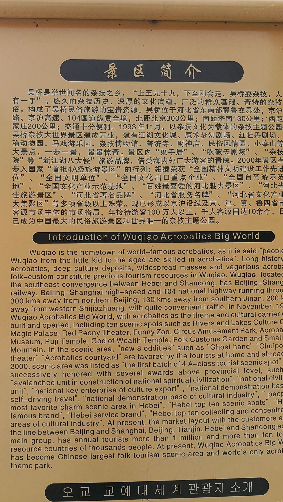 杂技之乡的欢乐江湖。 吴桥的杂技渊源已久,最突出特点是其民间性,吴桥杂技大世界的建设沿袭了其一贯的江湖特质,景区内主要有以下几大设施:一是江湖文化城,里边模仿老吴桥街坊设施,分不同时间段在不同的室外场子就地表演各类民间绝活,如猴戏、唢呐口技、顶缸等,游客可随意观赏;二是三座剧场,分别表演魔术、杂技、传统魔术鬼手,每一场大约40分钟左右,要提前了解好场次时间;三是马戏。 所有表演与专业杂技团相比,在节目编排、舞美设计等方面有不少差距,但贵在原汁原味,接地气,而且确有些民间绝活。 门票140元,价格倒还合适。参观需要注意合理安排好时间,部分剧场表演时间衔接不是很到位,有些演出有些时间段空缺。景区的管理还需加强,环境也有待改善。