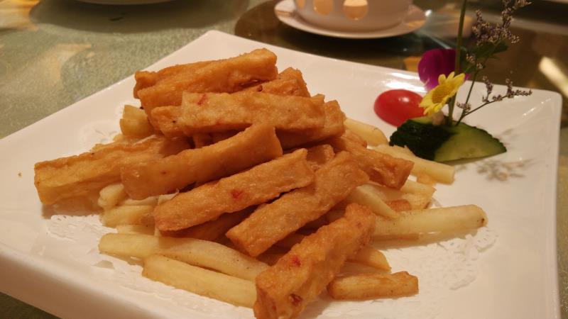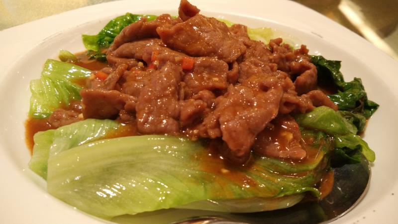 香炸百花胶,里面应该是虾胶,口感爽滑。 沙茶拌牛肉,牛肉嫩滑,沙茶酱味道也很好,最爱这个菜