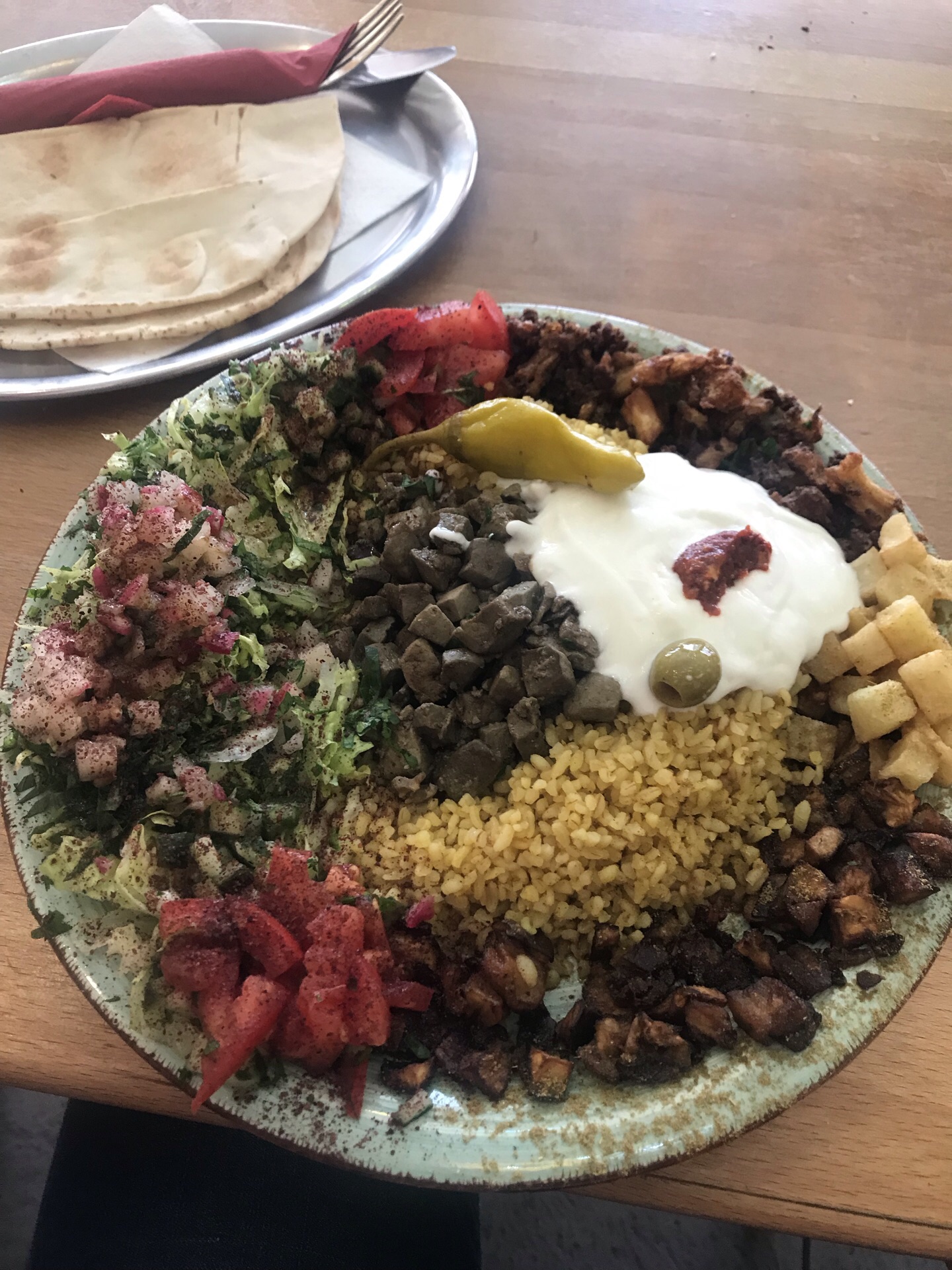 烤肉的话比较好吃,有各种配菜,还配一个饼。总体感觉还不错的叙利亚餐厅。餐厅卫生一般,有很多苍蝇总体感觉还不错的叙利亚餐厅。菜单写在墙上,直接点就行。烤肉的话比较好吃,有各种配菜,还配一个饼。当然你也可以外带吃。餐厅卫生一般,有很多苍蝇。