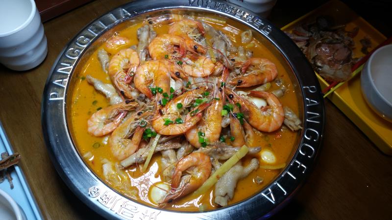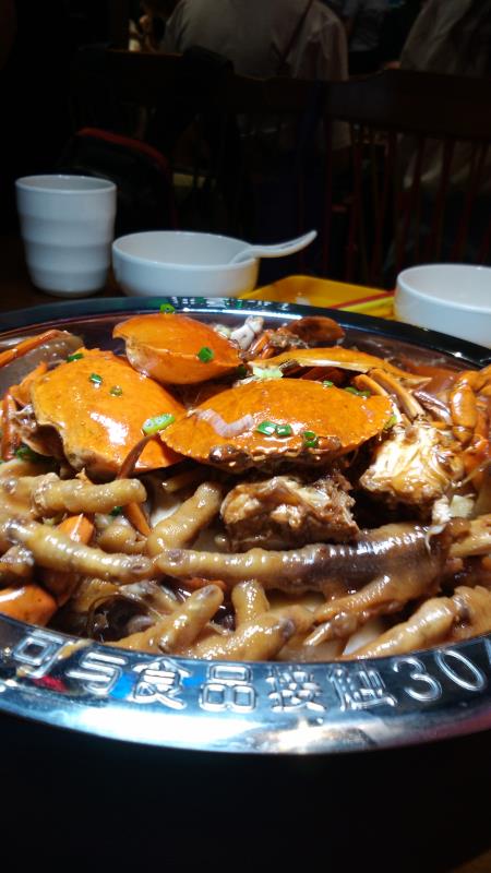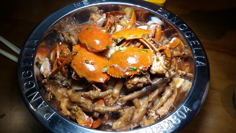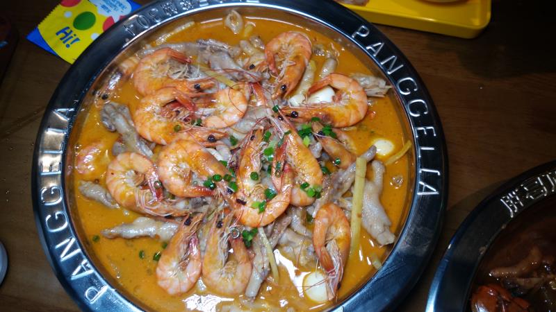 店内装修都几特别,昏暗神秘的灯光。坐下来就有服务员热情地送上水。菜单是一张简单的纸,主打煲类的为主,有海鲜煲和肉类的煲选择,总共有12种之多。我们都是喜欢吃海鲜的,所以点了2个不同的煲,明虾煲和肉蟹煲,有大煲和小煲之分,大煲适合3-4人吃,小煲适合2-3人吃,我们5个人,为了能是多种不同口味,所以叫了2煲都是小的。小煲上来的份量也挺多的,2煲小的足够5个人吃了。 吃煲之前先来个小吃口水鸡,鸡肉挺嫩滑的,而且都几入味,但感觉不辣,酸味占了大部分。 肉蟹煲,有不辣,微辣,中辣,特辣几种口味选择,我们选了不辣的味道,一煲上来材料都挺多的,最上面的一层是蟹,然后下面一层是鸡爪,还有土豆,年糕,豆腐等等。鸡爪闷得很软很入味,大家都觉得很好吃,不停地在啃,感觉鸡爪的受欢迎程度比蟹还要多,土豆也是焖得很淋,年糕切成片状,开始以为是鲍鱼菇,软软糯糯的,还不错。 明虾煲,这个煲要了微辣的,味道感觉没有不辣的味道浓郁,感觉还是不辣的煲底酱料比较好吃,最后我们还把这个煲里的材料夹去蘸不辣的煲底酱料吃。总体来说这里的海鲜都挺新鲜的,味道也是不错的。 吃煲的同时再点了一些这里的特色饮品,分别有萌萌哒,芒果牛奶,太阳的后裔,月亮的后裔,名字都很特别。萌萌哒是用hello kitty形状的樽装的,饮品是粉红色的,很可爱,而且樽是可以拿走的,价钱也很便宜,15元一杯,可以又喝又拿。另外芒果牛奶是用奶瓶来装,也是可以拿走的。太阳的后裔和月亮的后裔颜色不一样,但是味道是差不多的。个人比较喜欢芒果牛奶的味道。