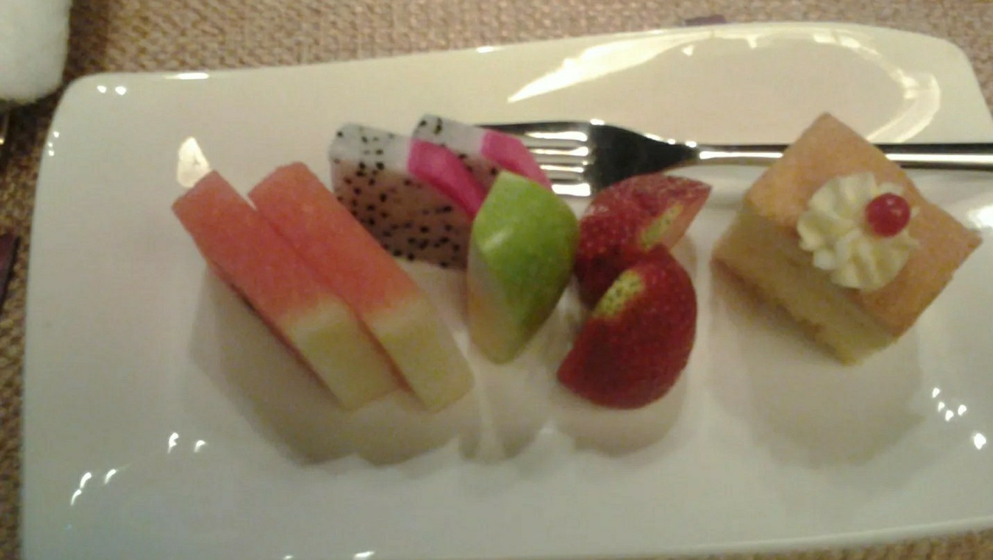 网友2019-09-23呵呵,有些不忍吃了。户县软面:呵呵,在如此酒店吃到这碗面,亲切哦,而且做得不错哦,同样的,醋少了些户县软面:呵呵,在如此酒店吃到这碗面,亲切哦,而且做得不错哦,同样的,醋少了些。呵呵。 时令水果拼盘:每人一份,一条小船上满载了水果,配上个掌舵的小蛋糕。呵呵,有些不忍吃了。
