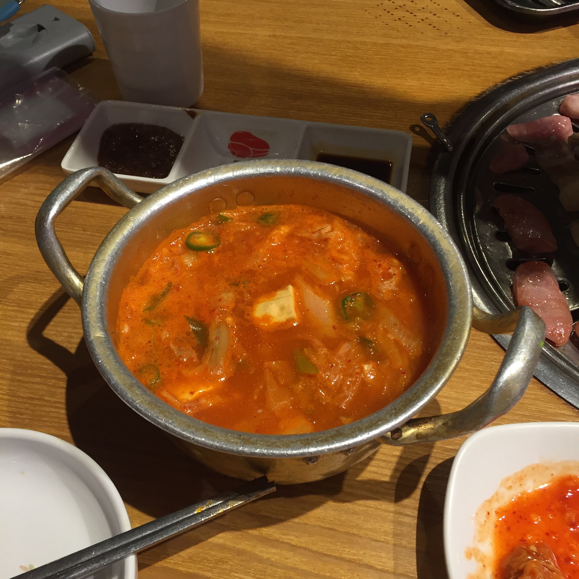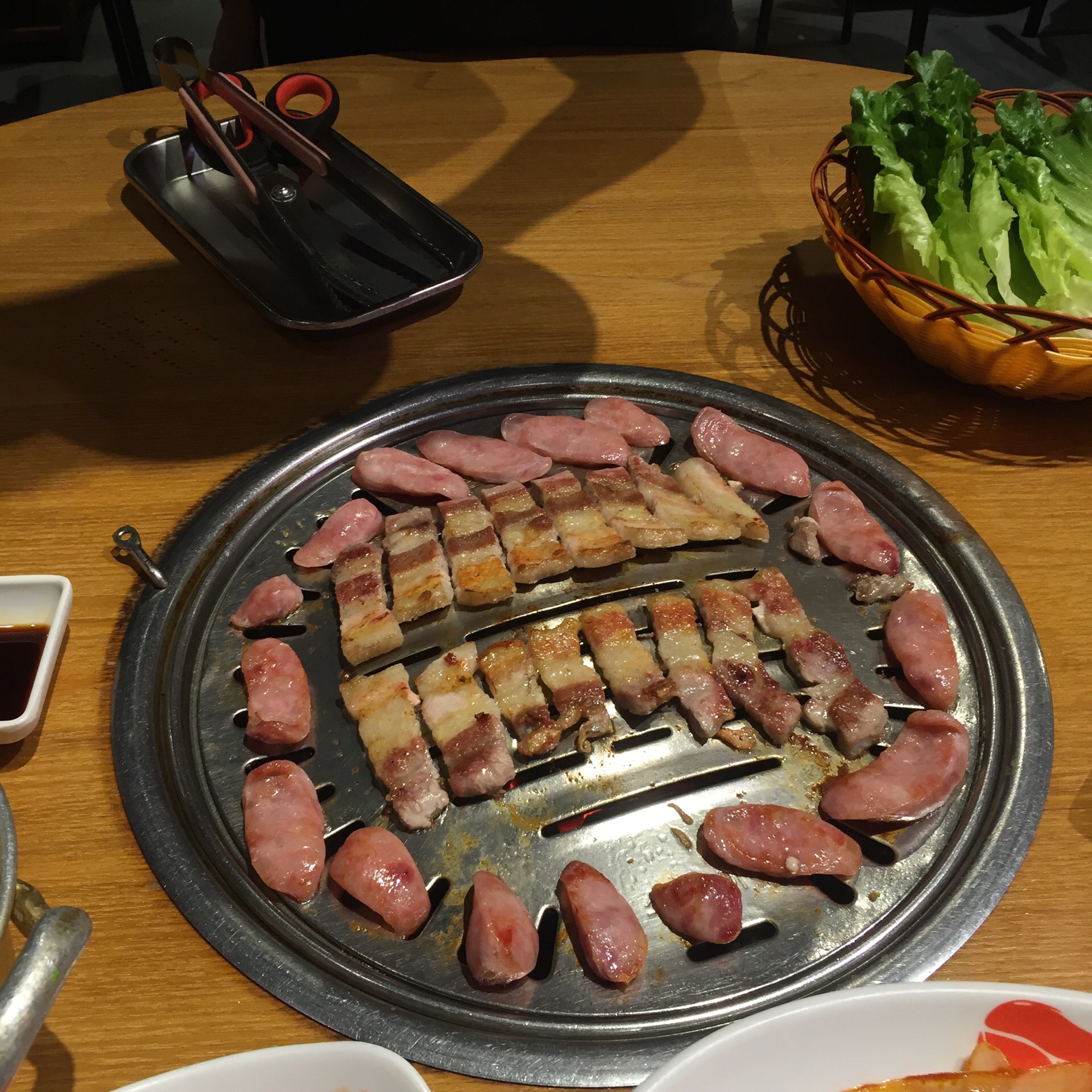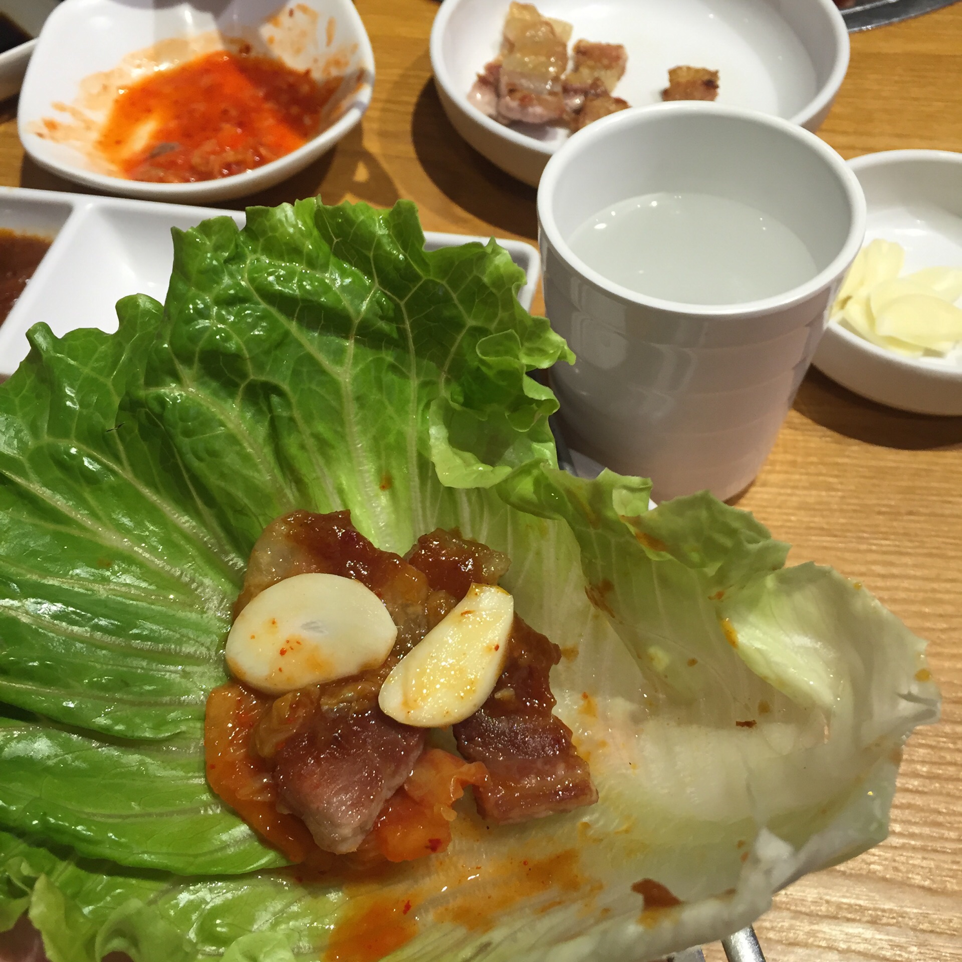 【地址】位于中华城北区三楼外围; 【环境】喜欢他们前台的背景墙,满满一面 桌与桌间隔不算大,但也还可以,坐在里面感觉像是在韩国电视剧里面的场景 ~ 【服务】服务很棒,小哥哥一直在桌与桌之间来来回回帮忙烤肉,感觉他好辛苦呀。烤得是真的好吃 ~ 【推荐菜品】 1⃣️ 护心肉:很嫩,味道很香,不用包菜蘸酱都好吃 ~ 2⃣️ 五花肉:烤得香香脆脆的才好吃 ~ 3⃣️ 鸡软骨:嘎嘣脆,很香 ~ 4⃣️ 台湾香肠:必须要配蒜瓣才好吃呀 ~ 【总体】⭐️⭐️⭐️⭐️⭐️ 服务超赞,味道不错,性价比很高,三个人200块吃得超级满足 ~ 让你感觉在韩国的缸桶屋韩国烤肉,绝对不要错过哈