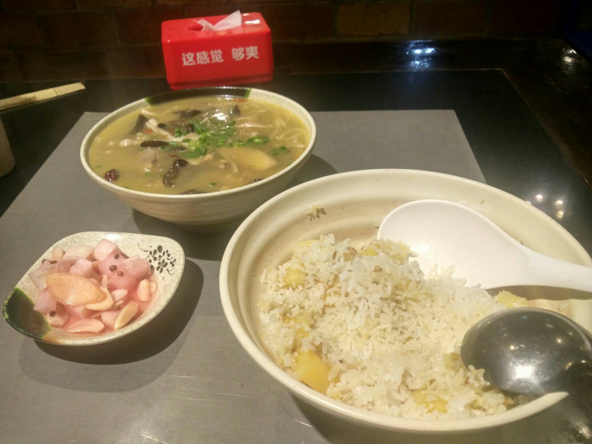 柴火洋芋饭位于武隆汽车站旁边,每位6元。再配上一个山鸡野菌汤,整个搭配就完美了柴火洋芋饭位于武隆汽车站旁边,每位6元。洋芋饭煮得不错,洋芋很酥,饭软硬得当,放在大锅里用柴火焖烧,有了饭瓷,吃起来脆脆的,饭里还有腊肉,总之味道不错。再配上一个山鸡野菌汤,整个搭配就完美了。