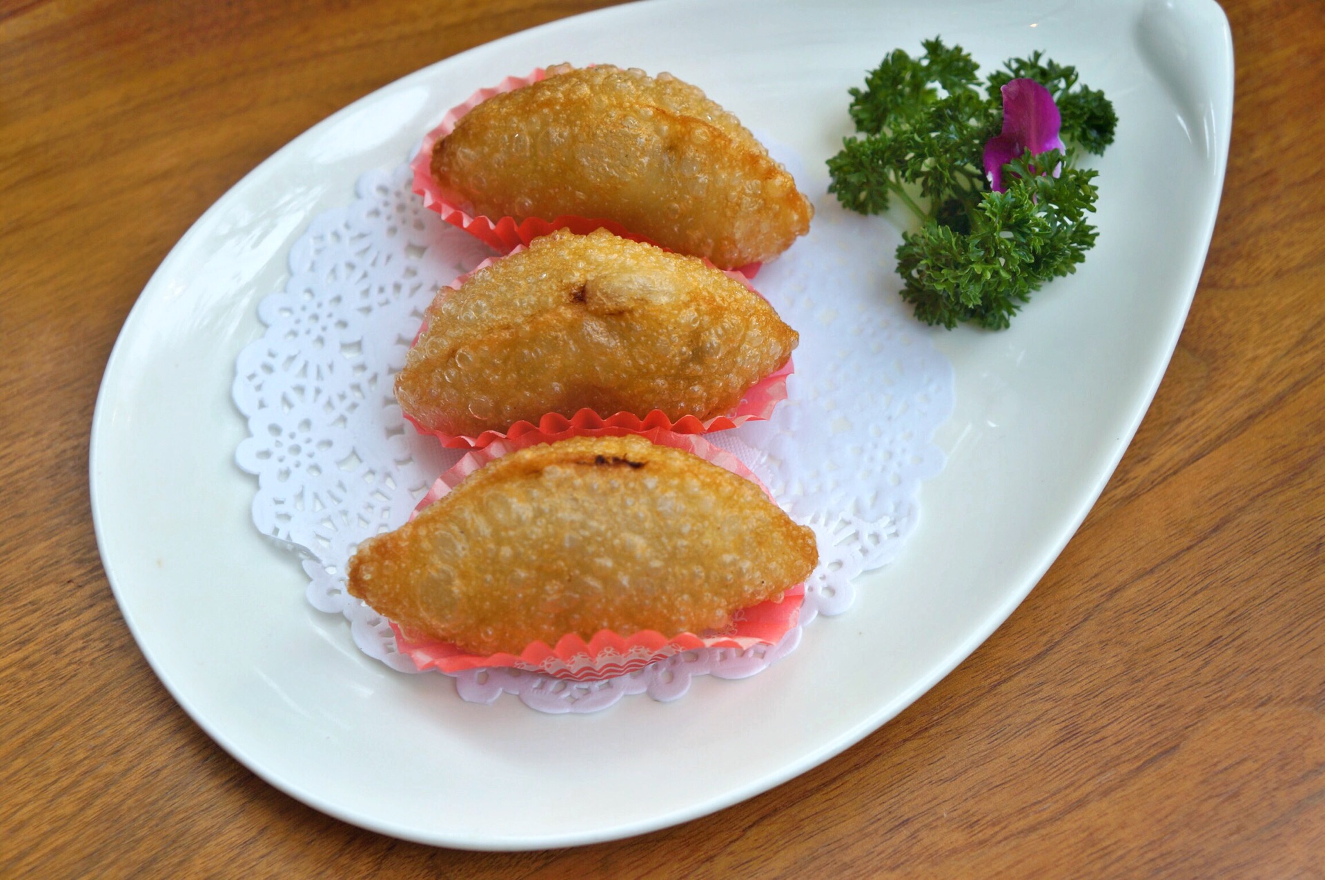 【家乡咸水饺】口感特别,外面酥炸了一层甜年糕口感的外皮,里面则是笋丁、肉末和成的内馅