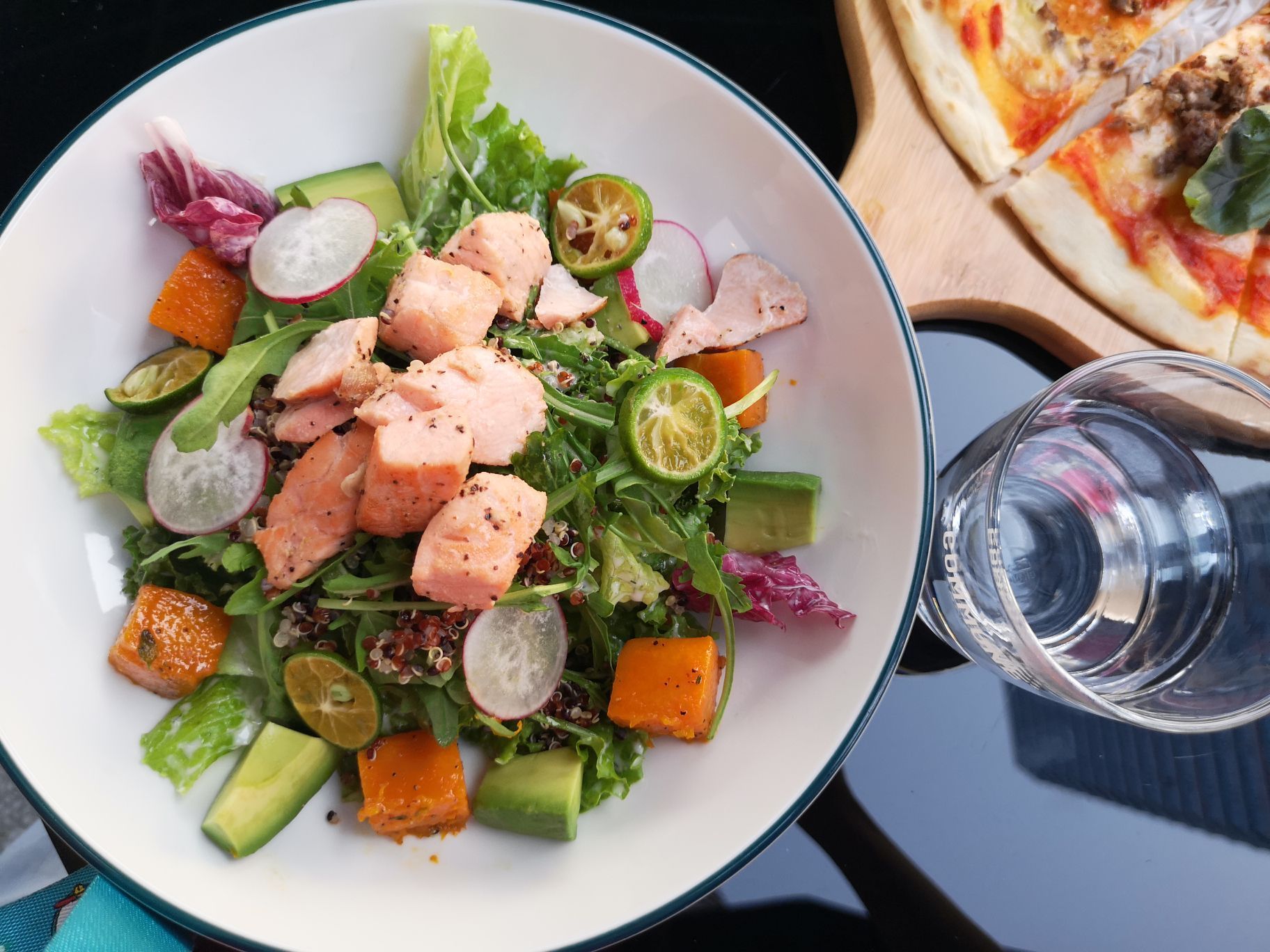 红咖喱大虾味道不错,虾仁很好吃,虽然是红咖喱不过不会很辣。三文鱼荞麦牛油果沙拉,味道酸酸的比较开胃
