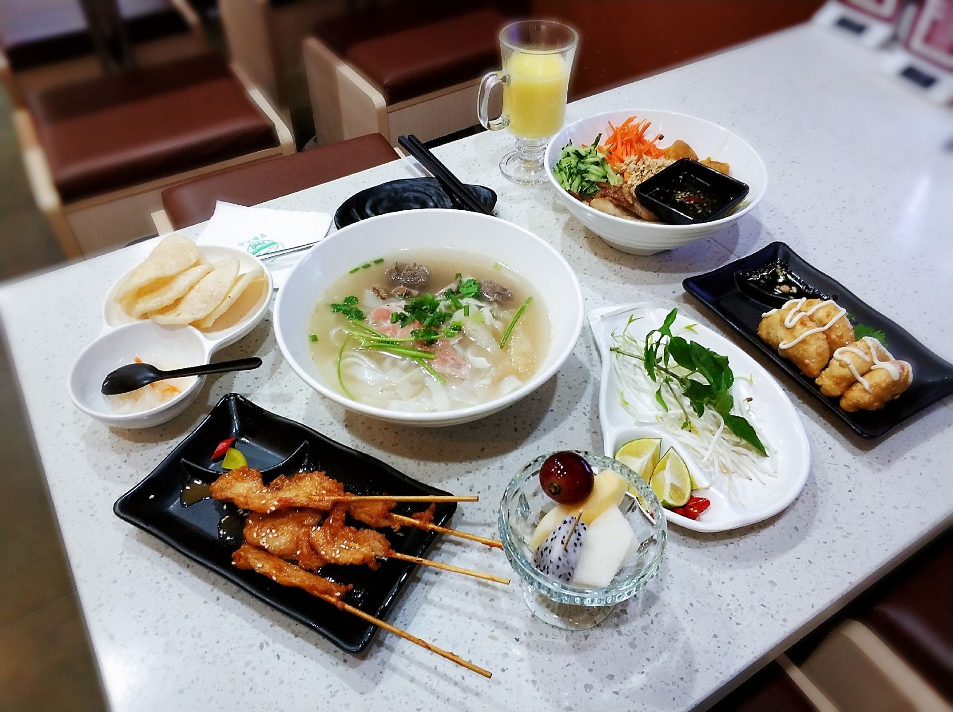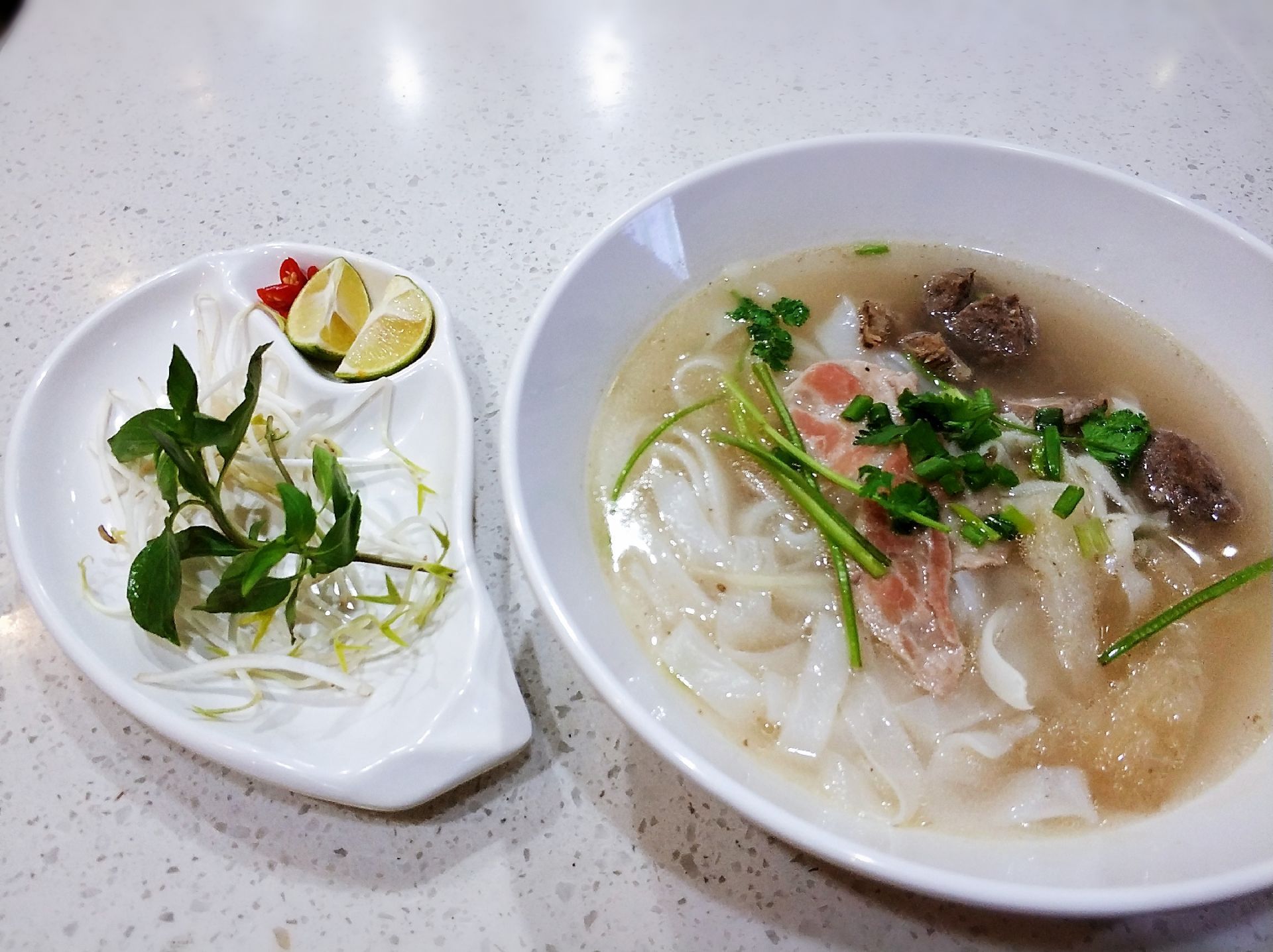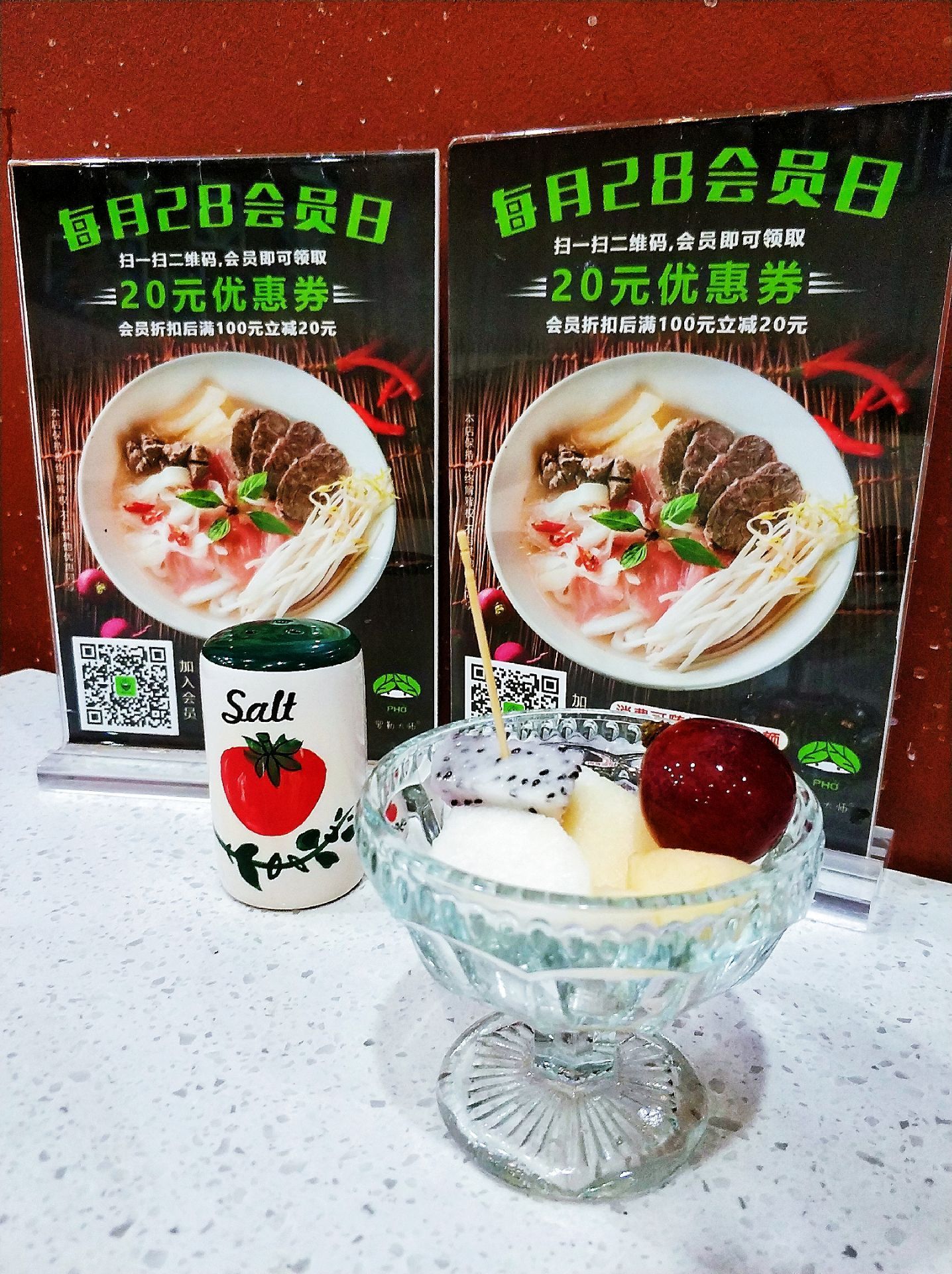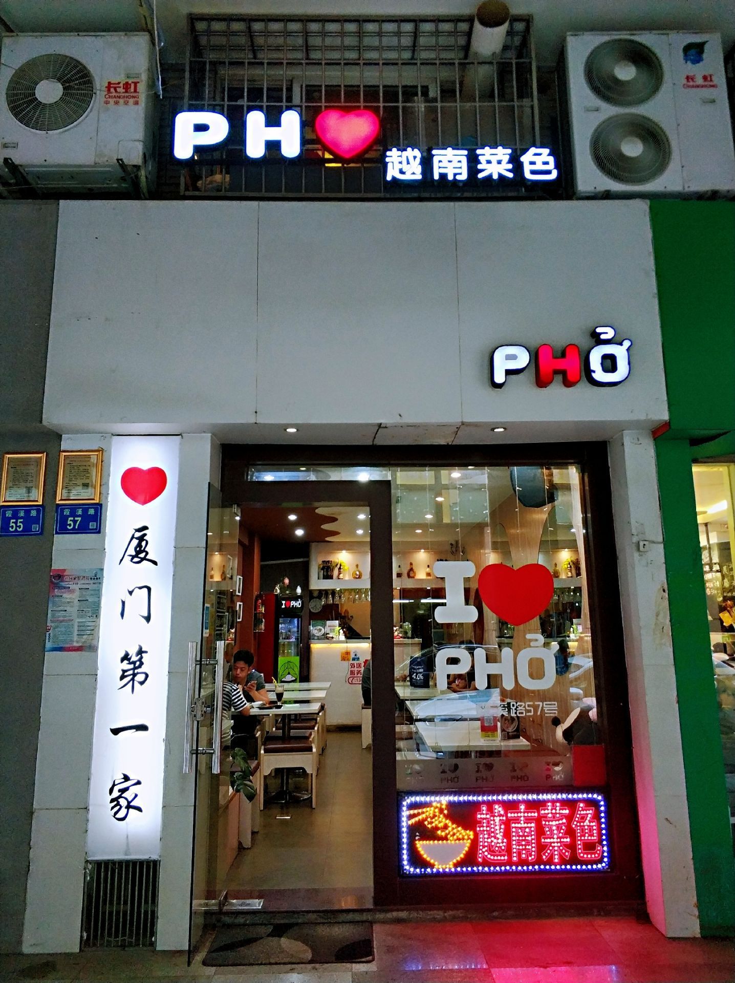 记忆中他家应该是厦门第一家越南河粉,怕都开了7、8年了吧?小小的店面,安于霞溪路一隅,低调淡然,岁月静好。没错,今天体验的就是这家越南河粉老店——PHO·越南河粉(中山路店)。 店址位于霞溪路57号,中山路名汇铜锣湾必胜客边上那条小路就是霞溪路,往里走个200米不到,就可以看到。店面不大且低调,需留意以免走过! 店内面积不大,以双人桌拼成的四人位为主,大概20来个座位,格局比较紧凑,座位间的间距有些窄。装潢方面,暗色地砖搭配白色餐桌,木纹墙面,墙上装有镜面,拓宽视野增加空间感。整面的照片墙,以及门口边上一角落的公仔,让整体看起来很温馨! |特别牛肉粉^店内招牌,厦门最早的PHO,连店名都以此命名!汤头很清澈,牛肉、牛展、牛肉丸,一应俱全。品完原味汤头后,依次加入豆芽、罗勒叶、青柠汁,辣椒,又是另一种酸爽开胃的风味!整体而言算是比较清淡的风格! |香茅鸡拌粉^小伙伴吃的,尝了一口,香气还不错,鸡肉油炸过,肉质还算紧实。 |龙虾片沙拉^萝卜酸放在龙虾片上面一起吃,噼里啪啦的响个不停,口感酸脆。 |越氏玉米饼^跟我们这边的玉米饼,感觉没太大区别啊,只是多加了沙拉酱,还不错。 |沙爹肉串^4串,不多不少,沙茶味还算比较浓,趁热吃口感比较好。 |养胃玉米汁^浓稠的玉米汁,热热地上桌,口感不错。 |餐前水果^葡萄、火龙果、苹果…中规中矩,没毛没病! 总评,在河粉界里,他家算得上是老字号了。早些年前,厦门还没什么越南餐馆,他家以一碗PHO,在美食圈内也占有一席之地!后来竞争变得激烈,洛城、雀越这些后起之秀出现后,他家还是以一贯的亲民路线,维持经营至今,实属难能可贵。相对于那些环境更好,价格更贵的同类餐厅,他家算是更有性价比吧!
