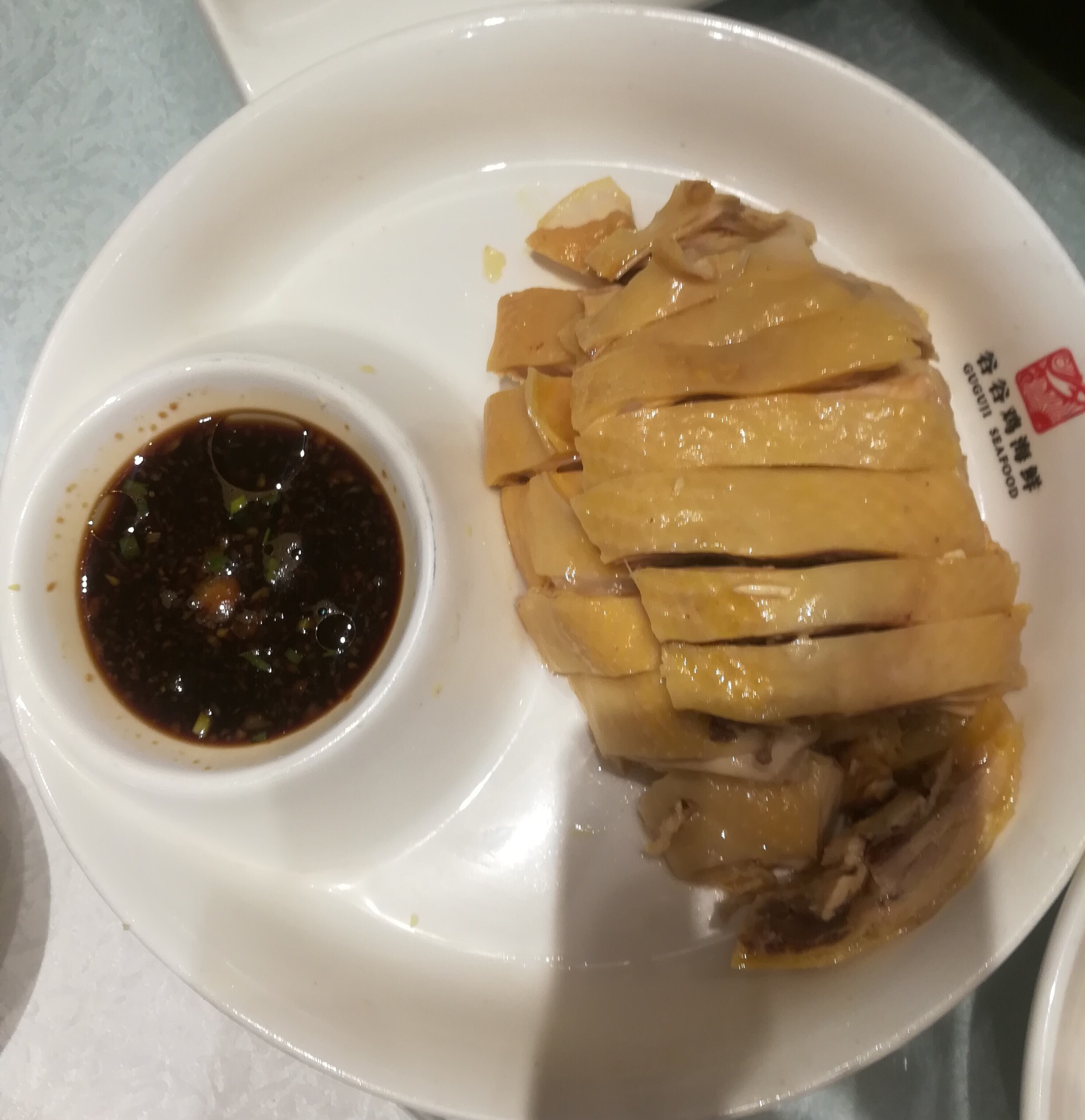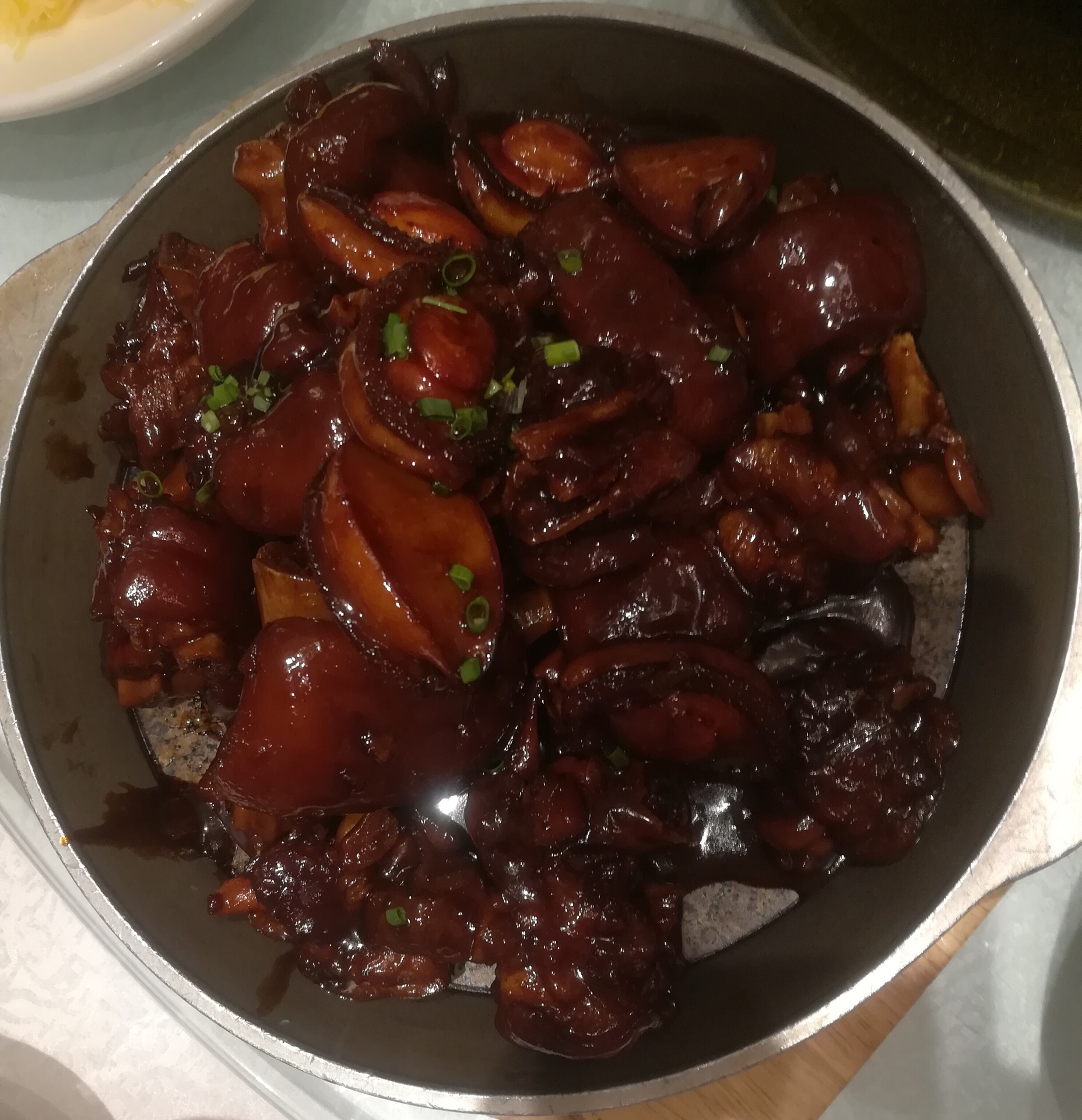 谷谷鸡象山海鲜城生意非常火爆,包房基本要半个月前预定才会有,我们只能去大堂吃了,点了秘制葱烤虾,葱煸炒的很香,虾浓油赤酱的,味道有点甜,谷谷鸡反而无功无过,招财进宝就是鲍鱼烧猪手,一盘上来里面有六只小鲍鱼,8.9块猪手,鲍鱼我没吃到,猪手味道不错,特别入味,有咬劲,感觉满满的胶原蛋白。