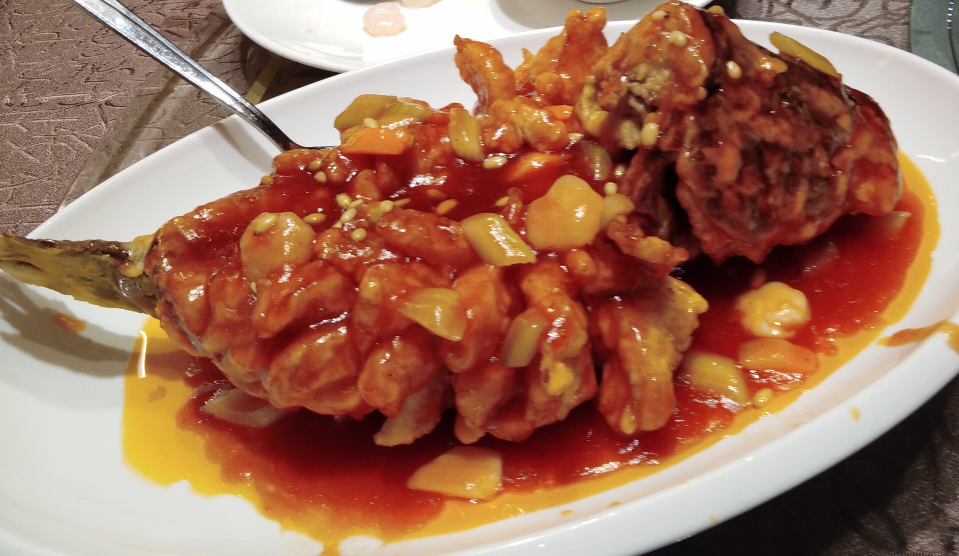 百年老店杏花楼环境好不必说,菜的品质一直是很稳定的,记得小时候谁请客如果去杏花楼就觉得这顿饭特别上档次了,这次的膏蟹粉丝煲味道中规中矩,要说的是这道松鼠桂鱼,鱼炸的很透,有了浇头还能吃到脆脆的,番茄汁酸酸甜甜搭配着鱼肉吃味道好极了。