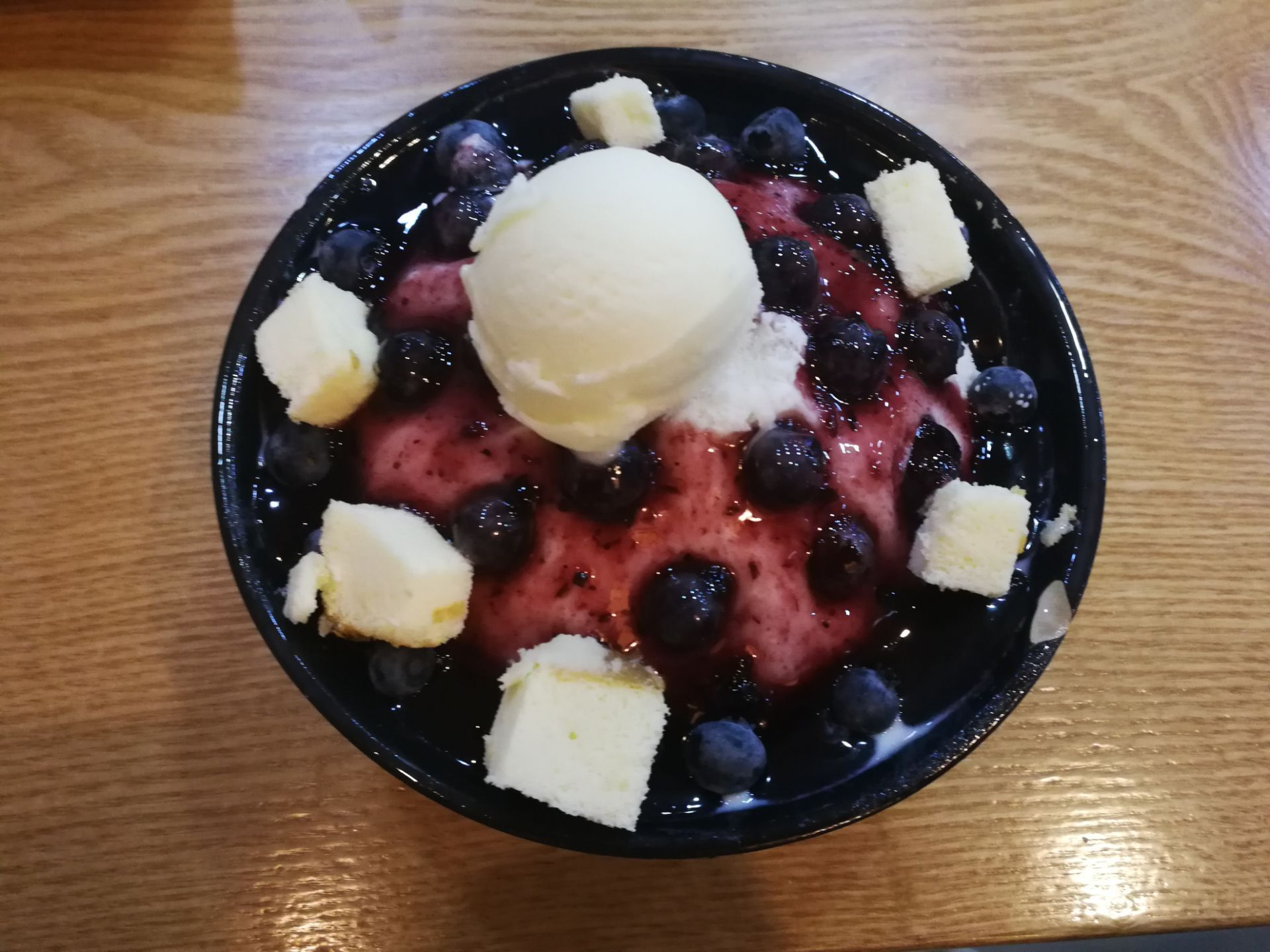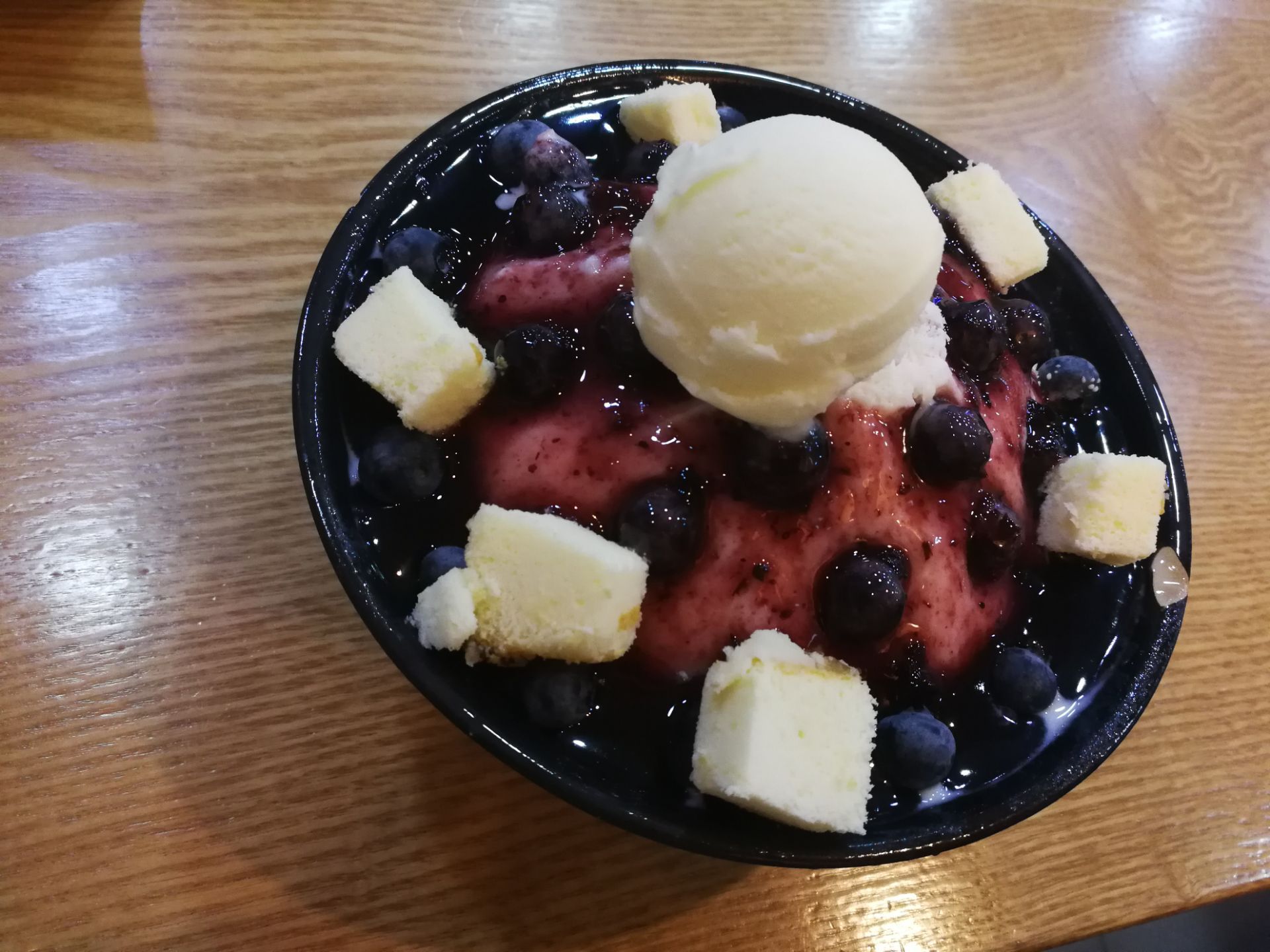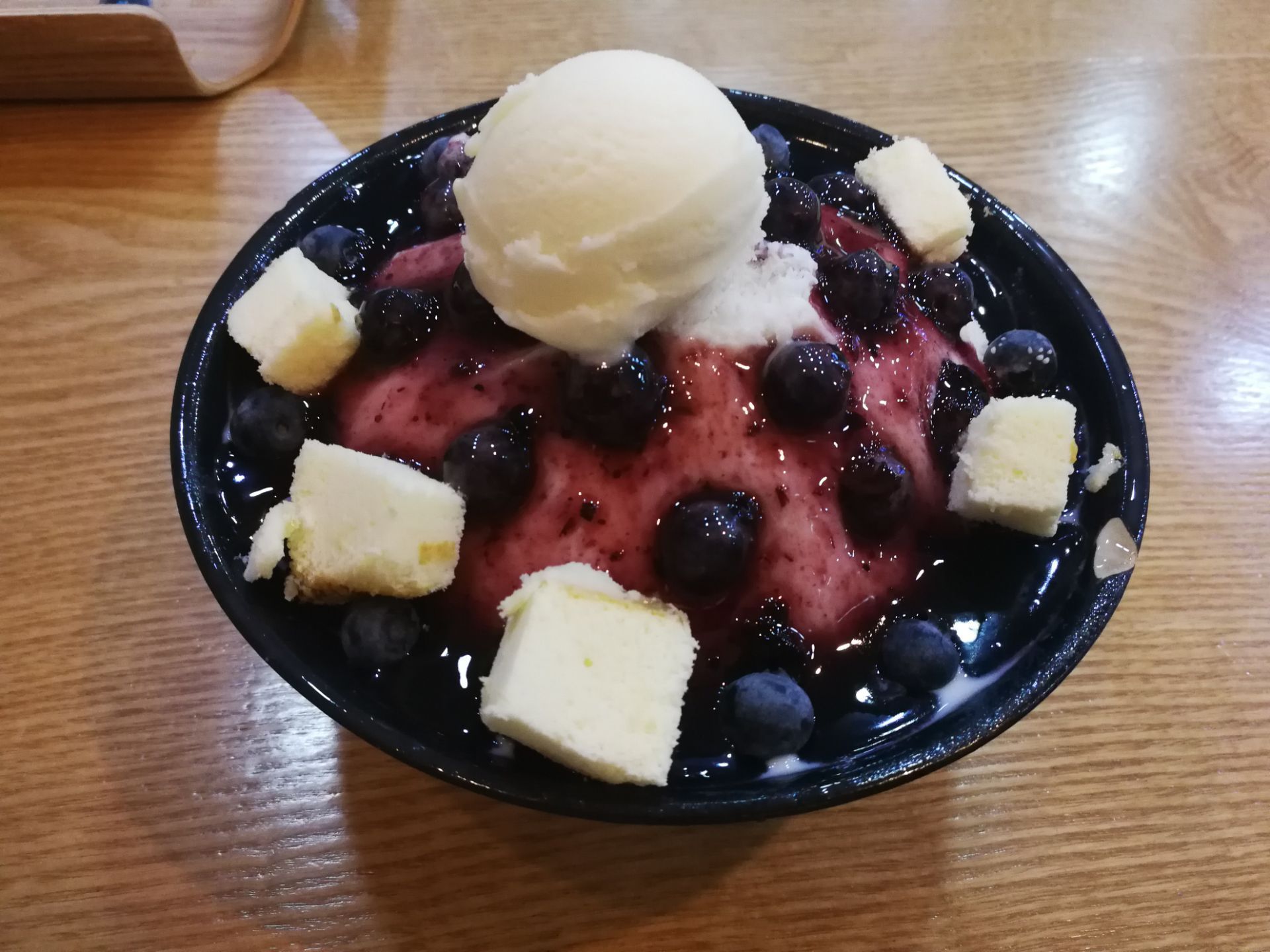 这次来吃的是蓝莓雪花冰,前台小哥很快验证券码,大概五分钟就做好送到桌上了这次来吃的是蓝莓雪花冰,前台小哥很快验证券码,大概五分钟就做好送到桌上了。上面有个冰激凌球,下面有蓝莓,蓝莓果酱,小块的奶糕,冰下面还埋着一些芒果,很好吃