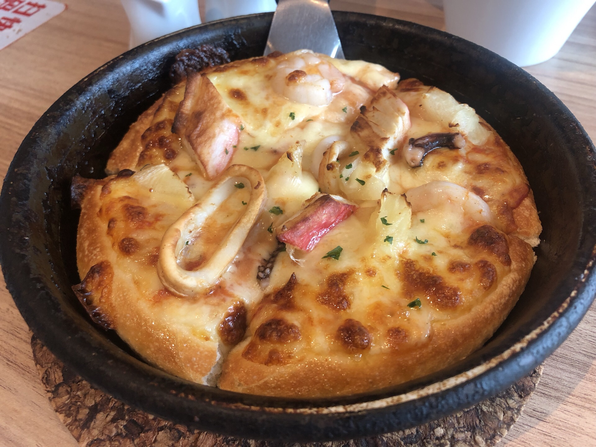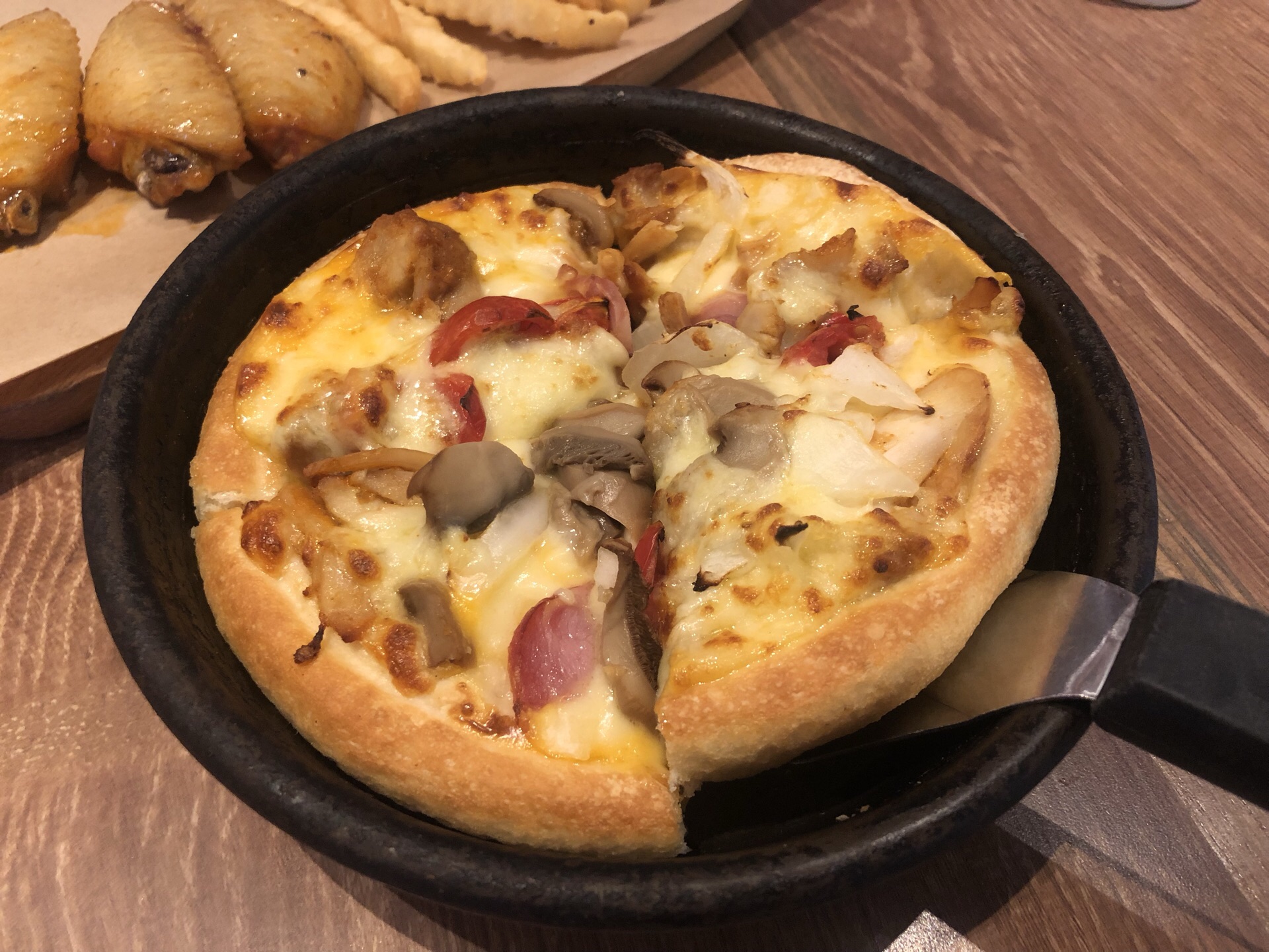 周浦最大的商场了吧,各种小吃比较丰富,星巴克常年爆满,而且非常不喜欢里面嘈杂的环境,所以第一次尝试万达的必胜客,虽然是两层楼,但一楼位置很少,二楼也不算大,奇怪的是,现在必胜客是被私人承包了吗,二楼的领班经理怎么感觉是个上海中年老阿姨呢,不是说老阿姨不好哦,是特别热情,做事麻利,只是跟其他店的风格不太一样,不过也还是好评啦! 因为下午来打发时间的,所以就选了下午茶套餐,性价比比较高一点,普通的饮料像咖啡红茶什么都可以免费续杯,坐一下午也没问题,配套的小食甜点选择不是很多,不过那个爆浆珍珠蛋糕倒是出乎意料的好吃,后来第二次在其他店吃的就差的远了,另外点了个迷你的披萨,只有三种口味可以做小盘装的,为什么不能多开发点品种呢!